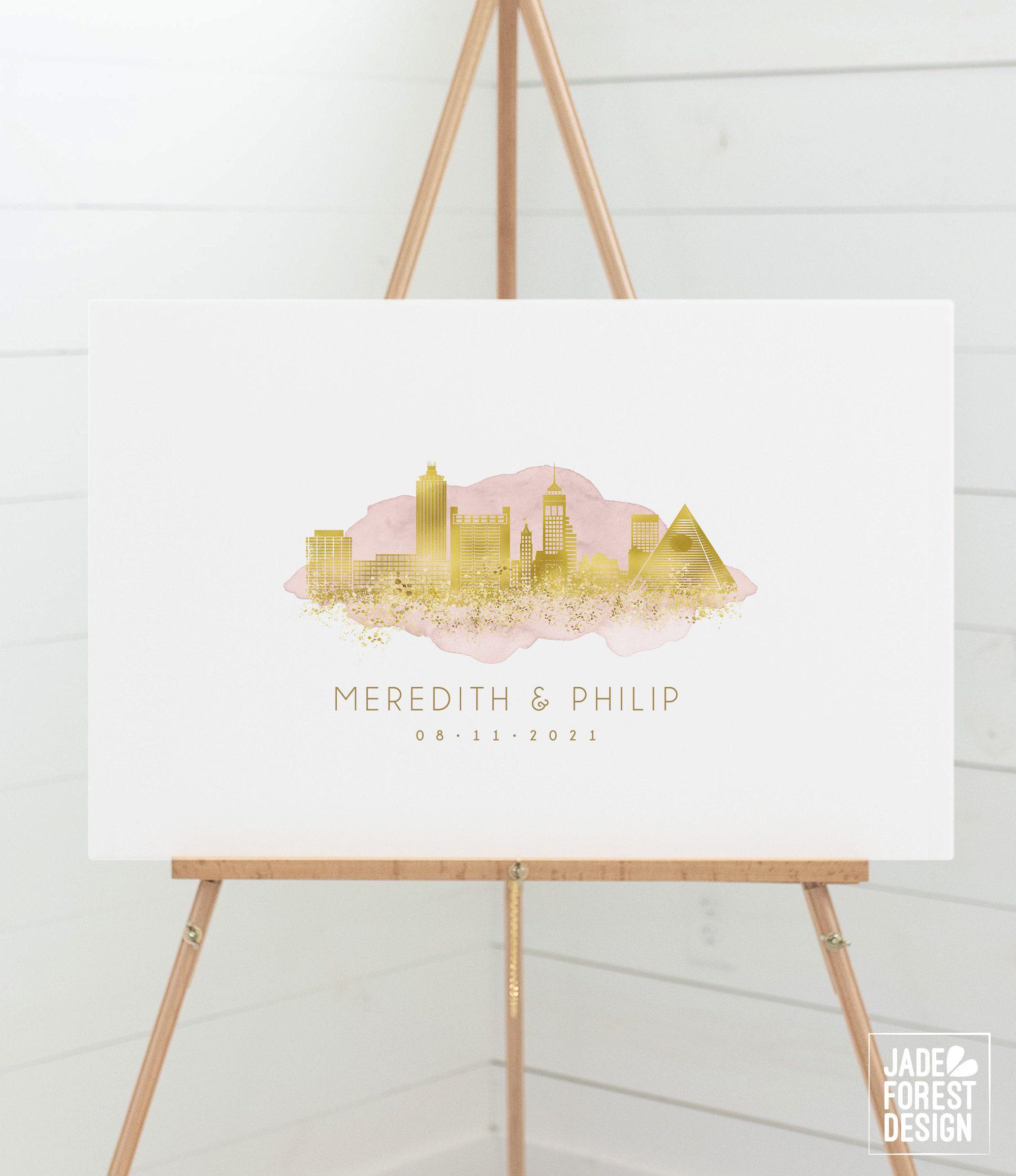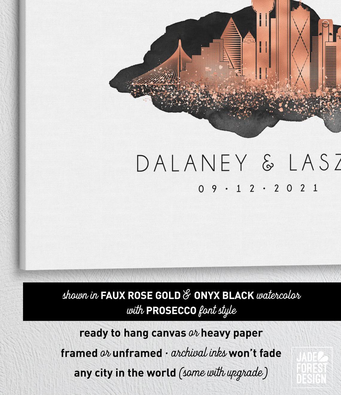Are you in love with the city you're getting married in? With the one you're moving to? Or maybe where you're from? Celebrate your love affair with our CUSTOM SKYLINE GUEST BOOK. It features your city skyline in a stunning faux metallic, enveloped with romantic watercolor. The artwork will be personalized with your names and wedding date, your choice of colors, and skyline (see list in Photos for available cities).
