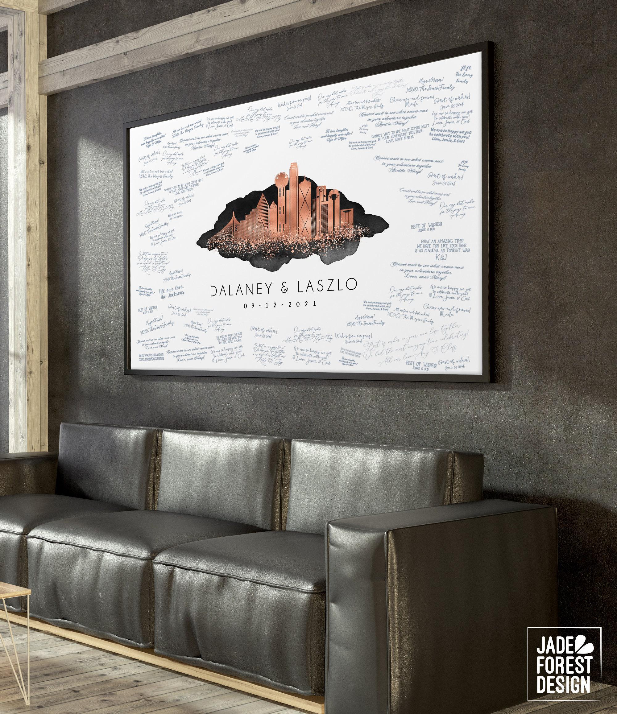 Dallas Skyline Guest Book: Faux Rose Gold, Black Watercolor Canvas