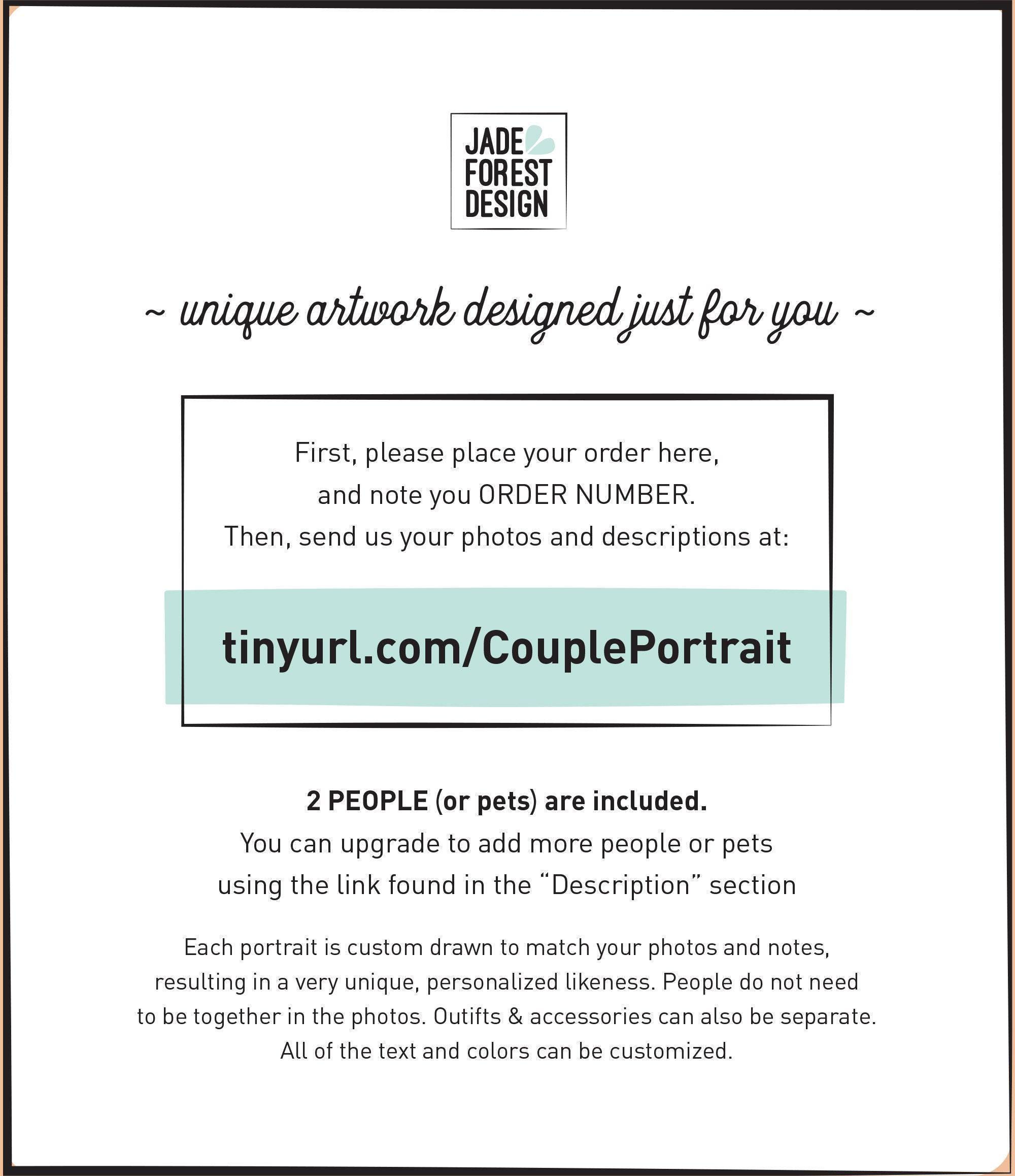 We usually ask you to provide your info in the "Personalization" or "Notes" box when placing you order. For PORTRAITS, each design has a unique web link for sending over your photos.