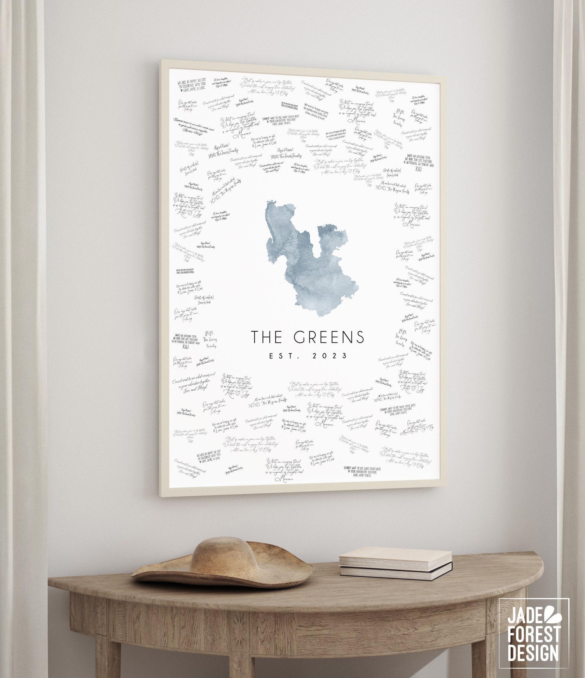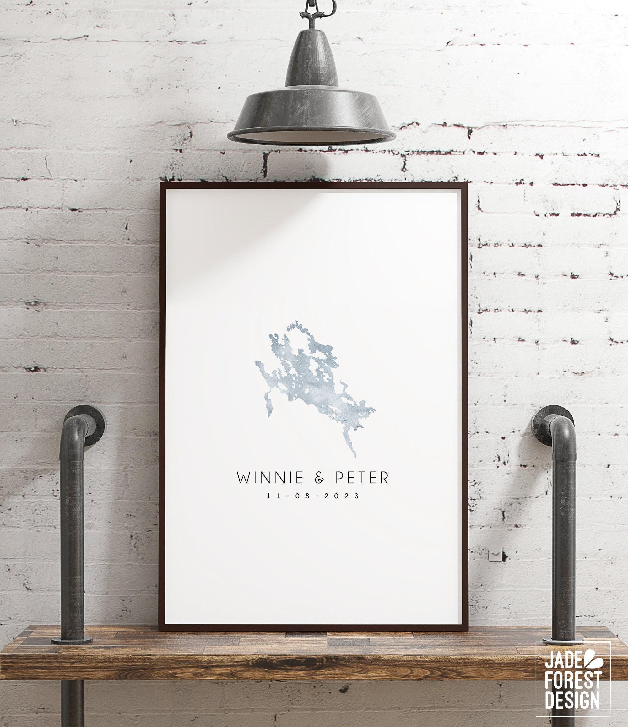 Celebrate your special day with a unique wedding guest book alternative that captures the beauty of your favorite lake in a stunning vista blue watercolor. This personalized lake map creates a meaningful keepsake, perfect for lakeside ceremonies or as a custom gift from the couple. Designed to be both an artistic statement and a heartfelt memento, it invites guests to leave their signatures around the custom lake shape, making your wedding memories truly unforgettable.