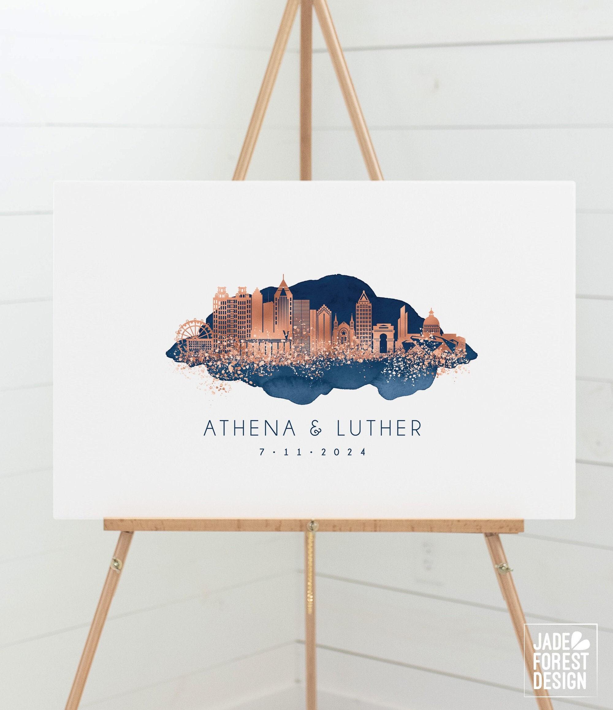 Celebrate your love and connection to Atlanta with this stunning wedding guest book alternative, beautifully showcasing the Atlanta skyline art in elegant faux metallic rose and navy watercolor. This Georgia canvas gift is thoughtfully designed as a personalized keepsake, inviting guests to leave their signatures around a custom skyline print featuring your names and wedding date. Crafted to blend artistry with sentiment, it offers a unique way to remember your special day.