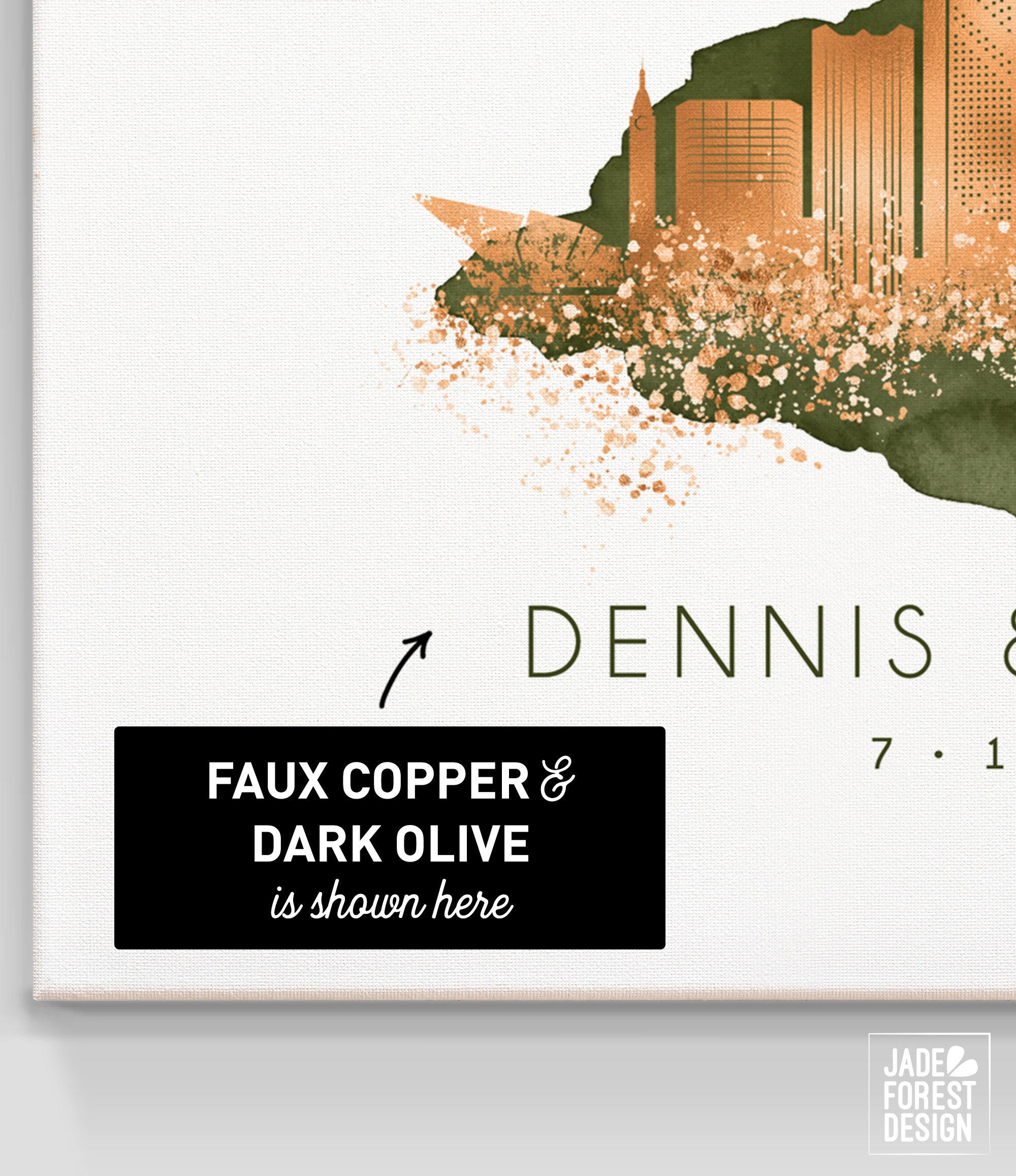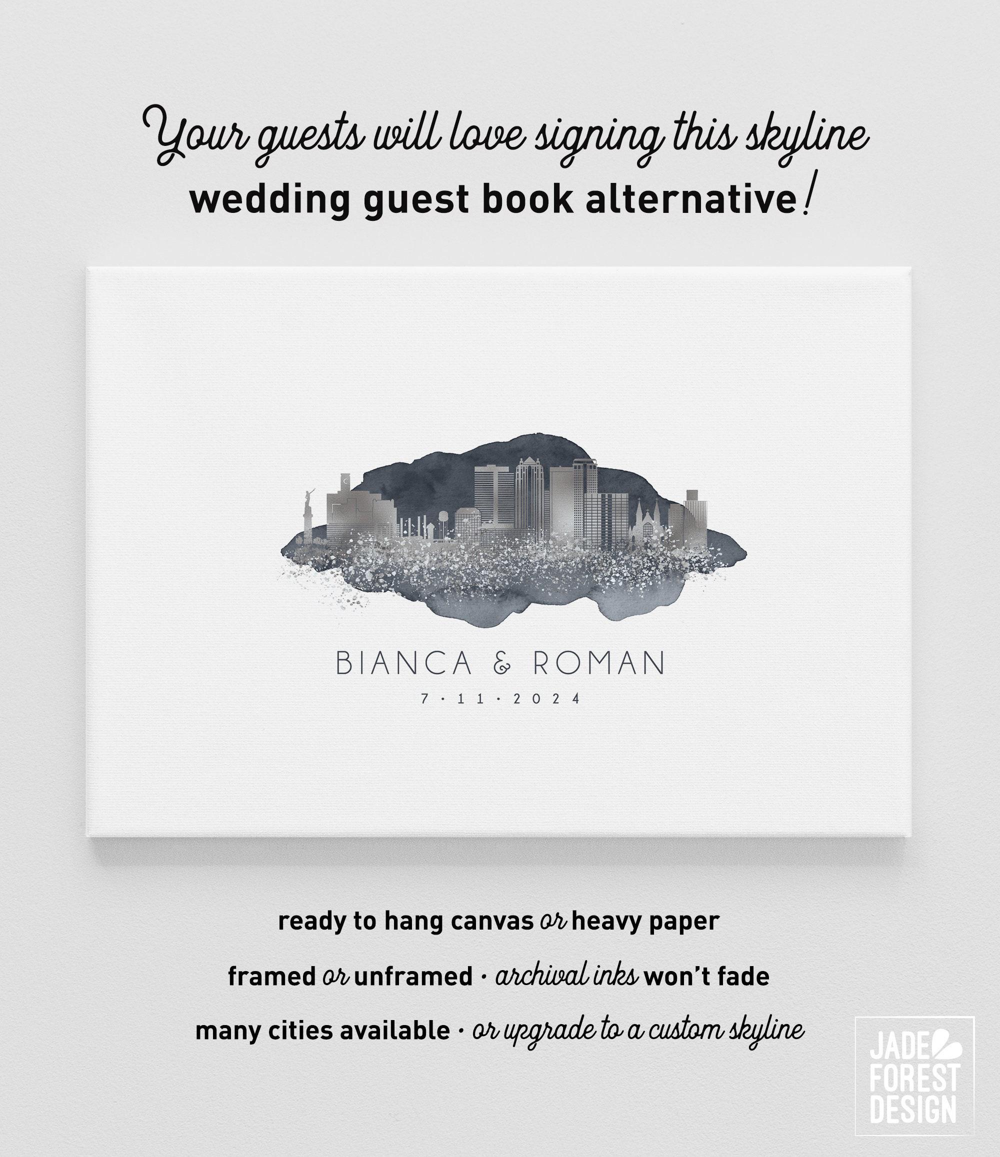 - ✅ Personalized with your names, wedding date, and choice of colors for the watercolor background, and the faux metallic skyline