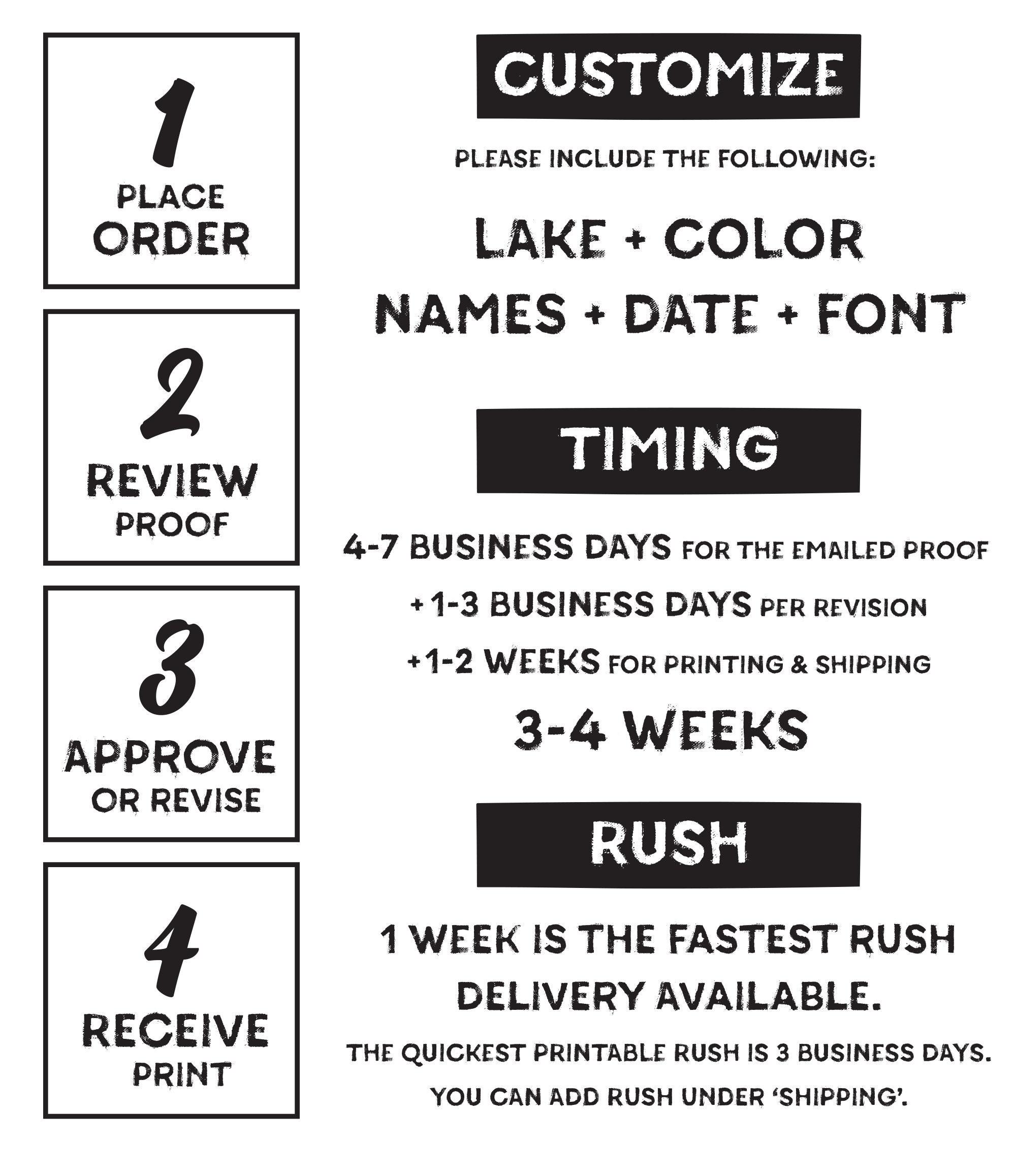 - 1. Place your order, including all your info: NAMES, DATE, LOCATION (Island, Lake, State, or Country shape)