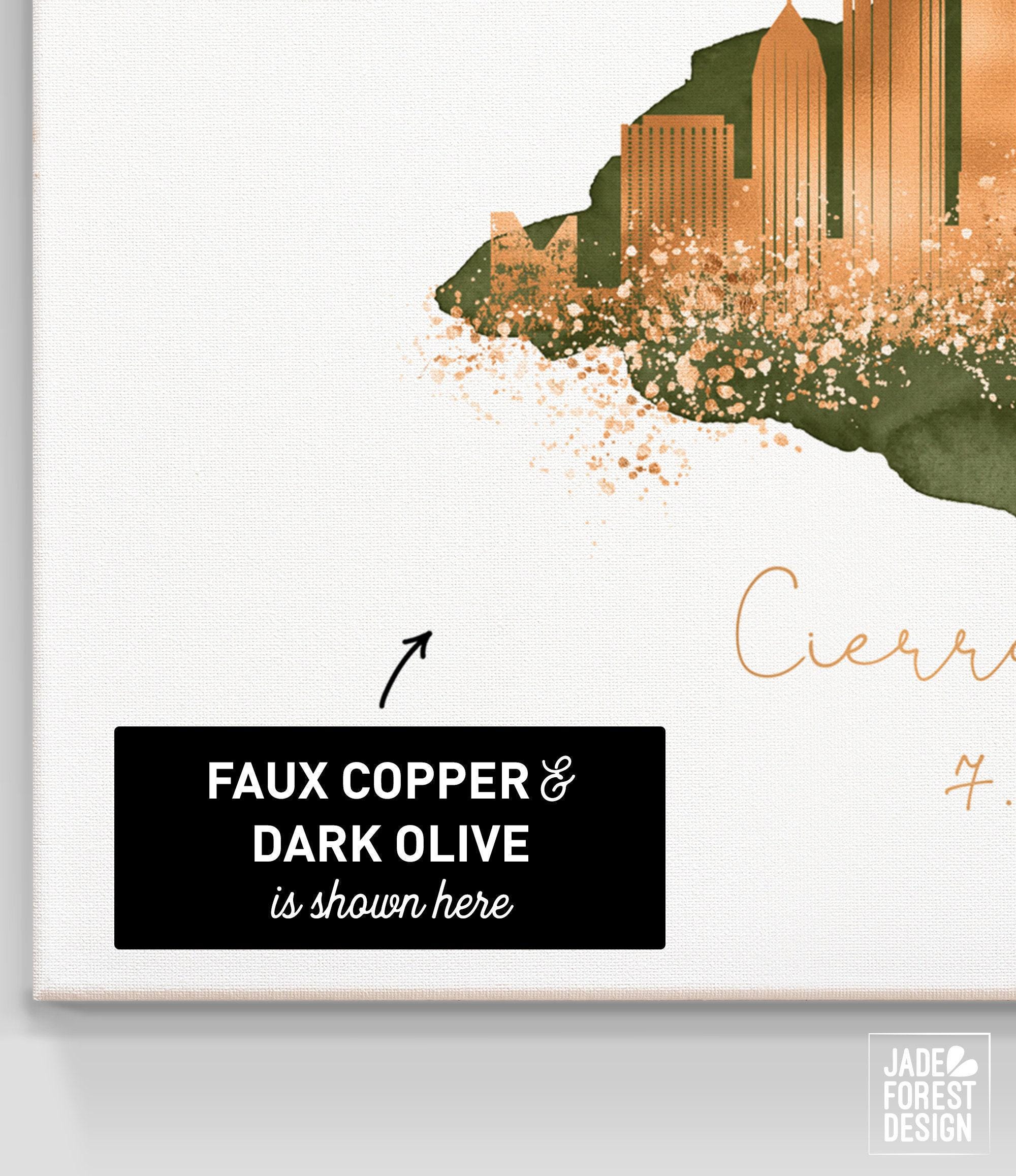 Are you in love with the city you're getting married in? With the one you're moving to? Or maybe where you're from? Celebrate your love affair with our CUSTOM SKYLINE GUEST BOOK. It features your city skyline in a stunning faux metallic, enveloped with romantic watercolor. The artwork will be personalized with your names and wedding date, your choice of colors, and skyline (see list in Photos for available cities).