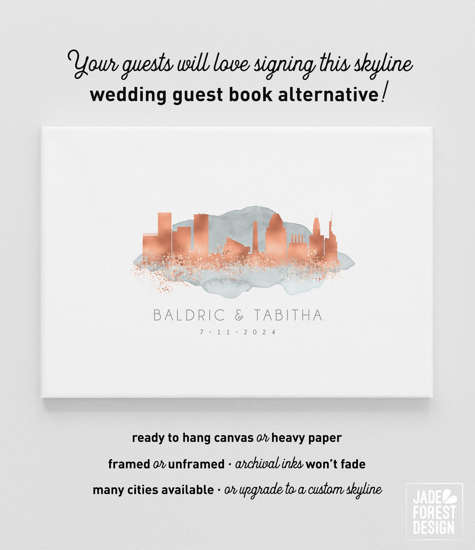 Are you in love with the city you're getting married in? With the one you're moving to? Or maybe where you're from? Celebrate your love affair with our CUSTOM SKYLINE GUEST BOOK. It features your city skyline in a stunning faux metallic, enveloped with romantic watercolor. The artwork will be personalized with your names and wedding date, your choice of colors, and skyline (see list in Photos for available cities).