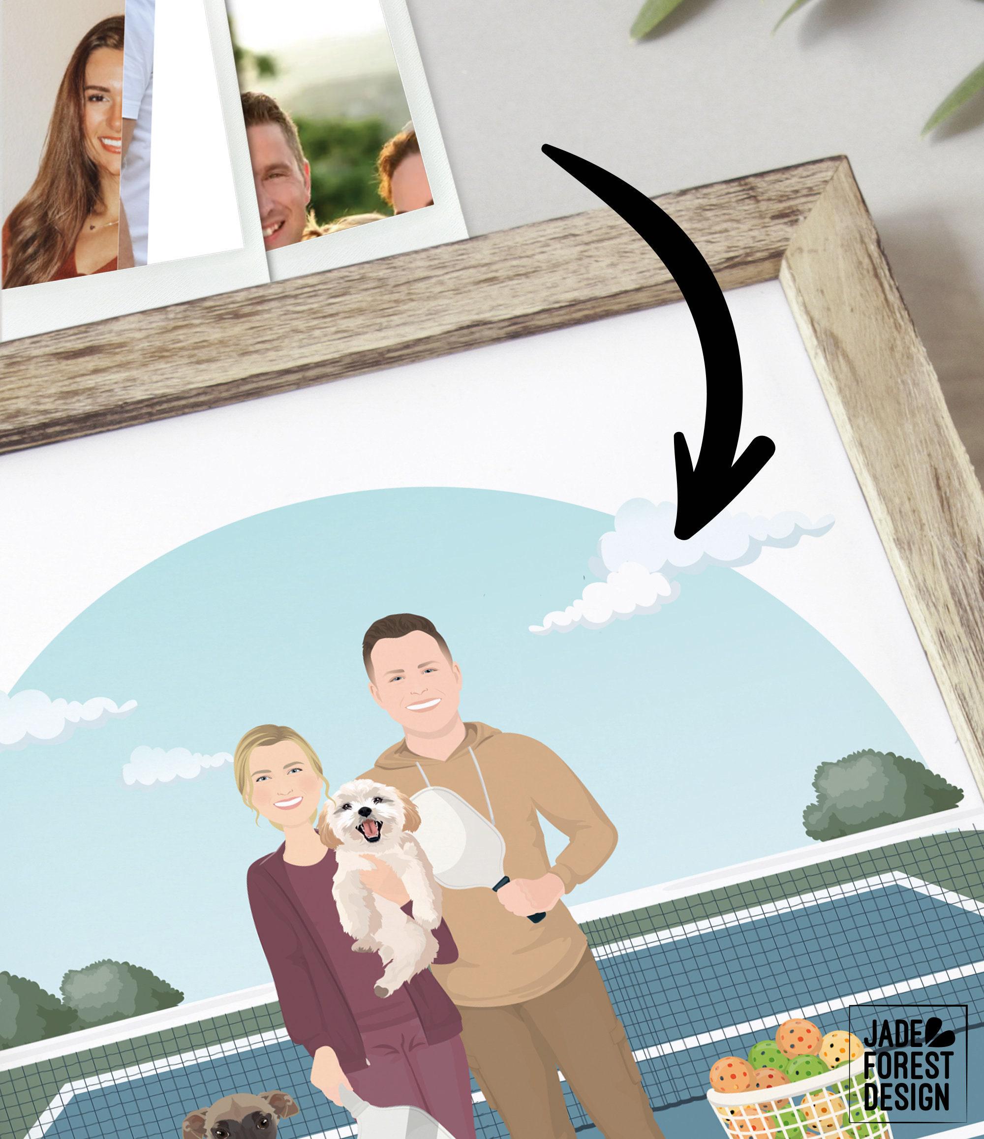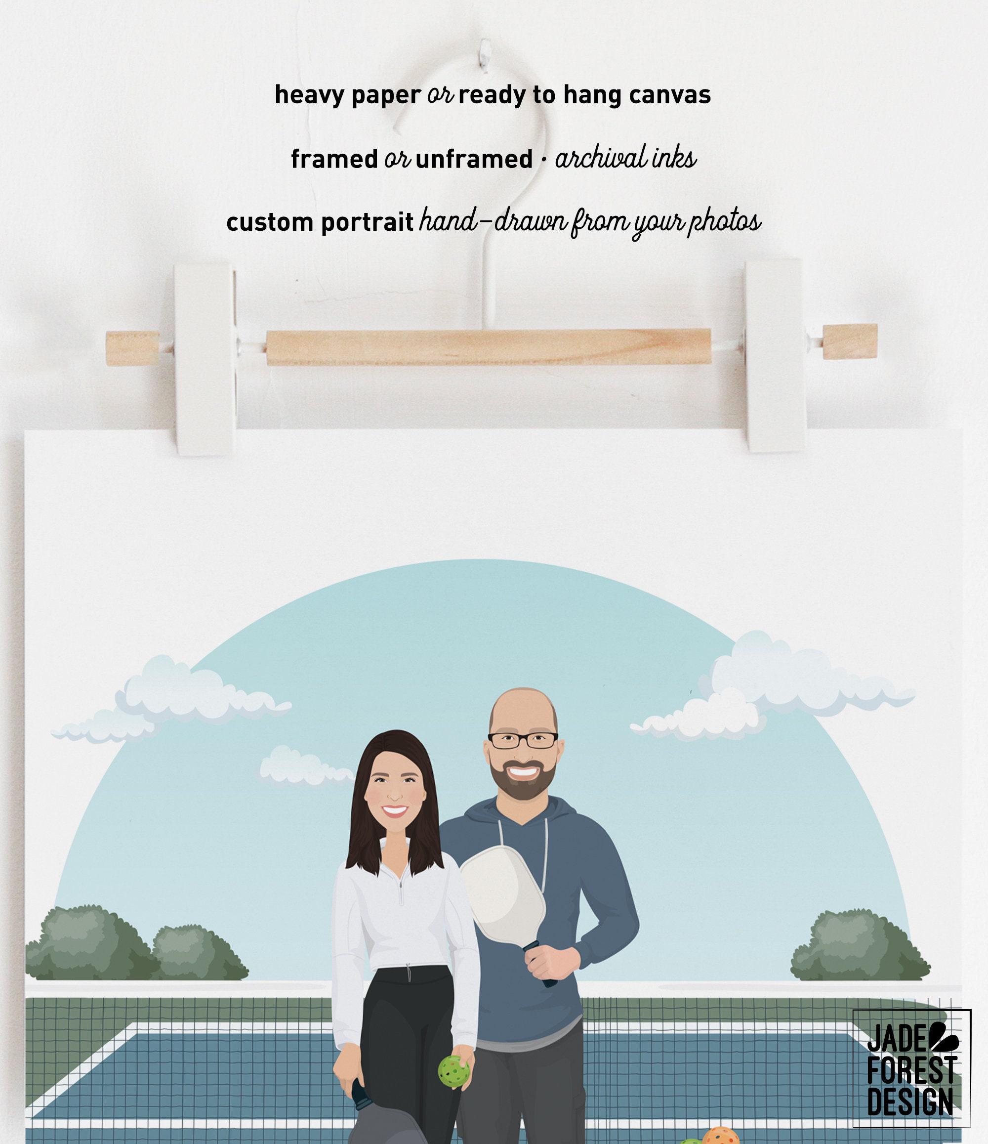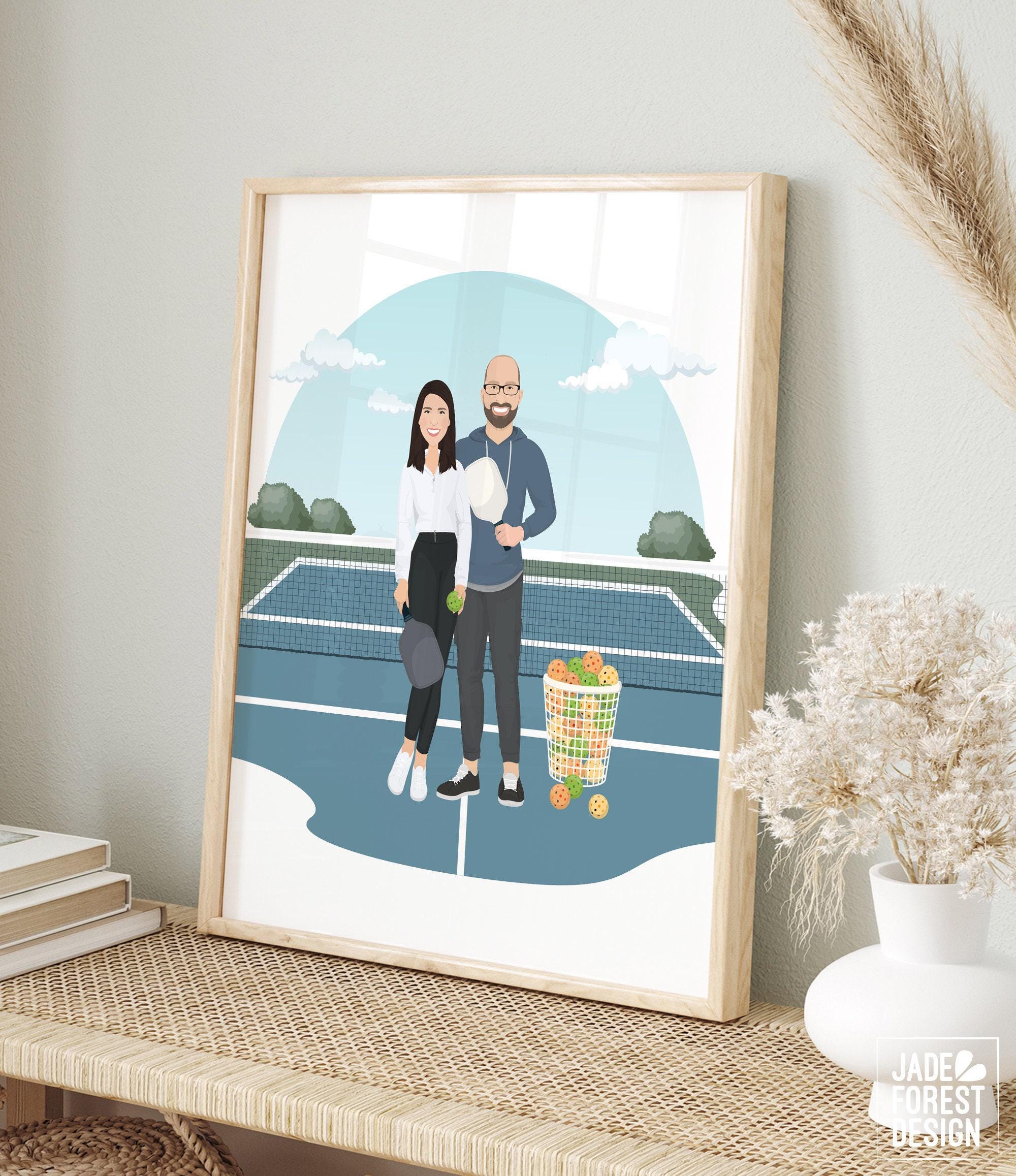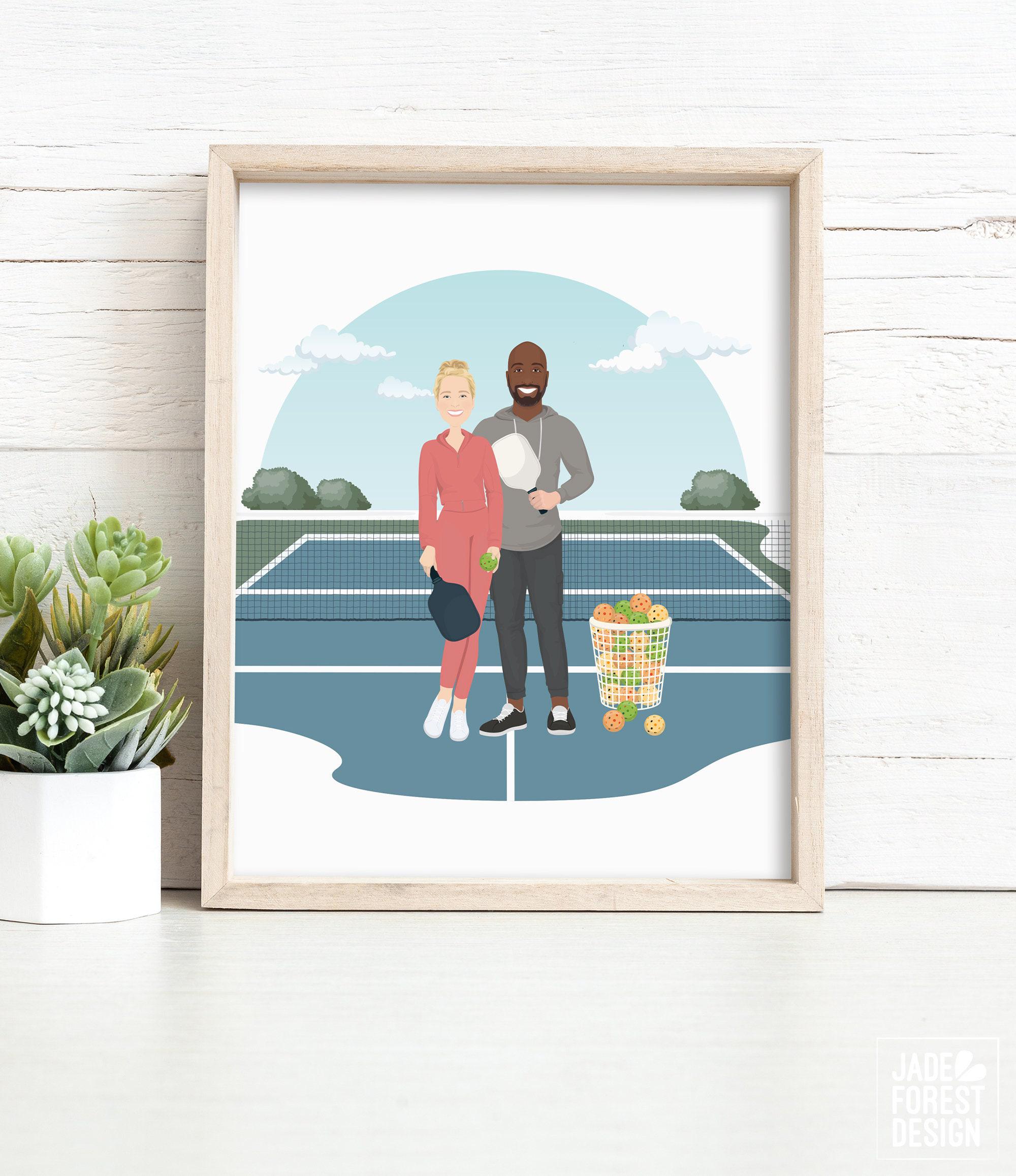 Celebrate your love for the game with this unique pickleball court portrait, perfect for any pickleball addict or doubles partner. This fun couple portrait captures the spirit of the sport with a personalized drawing from photos, making it an ideal pickleball gift idea for Mother's Day or any special occasion. Crafted with care, each illustration brings your favorite pickleball scene to life in a charming cartoon style.