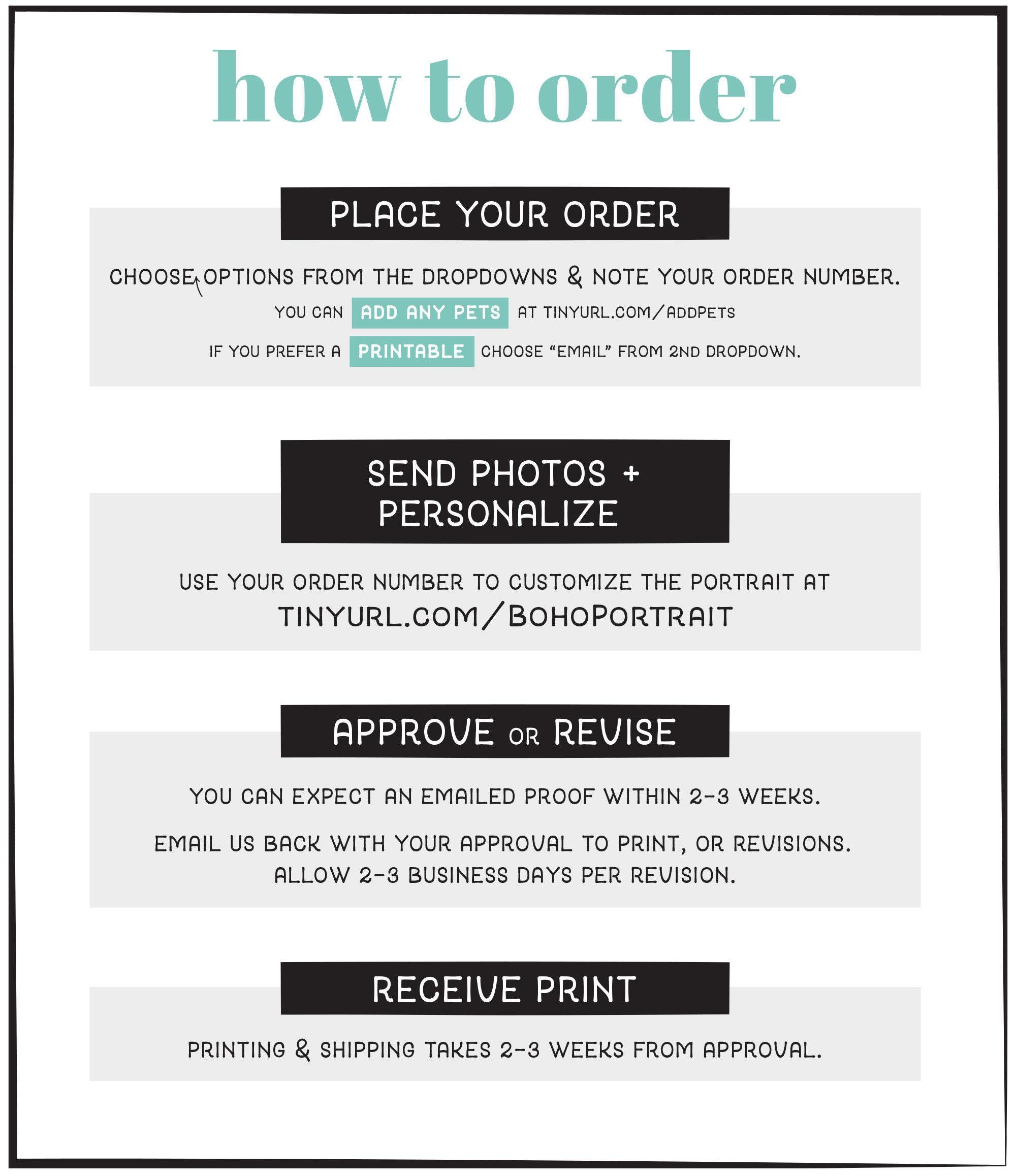 We usually ask you to provide your info in the "Personalization" or "Notes" box when placing you order. For PORTRAITS, each design has a unique web link for sending over your photos.