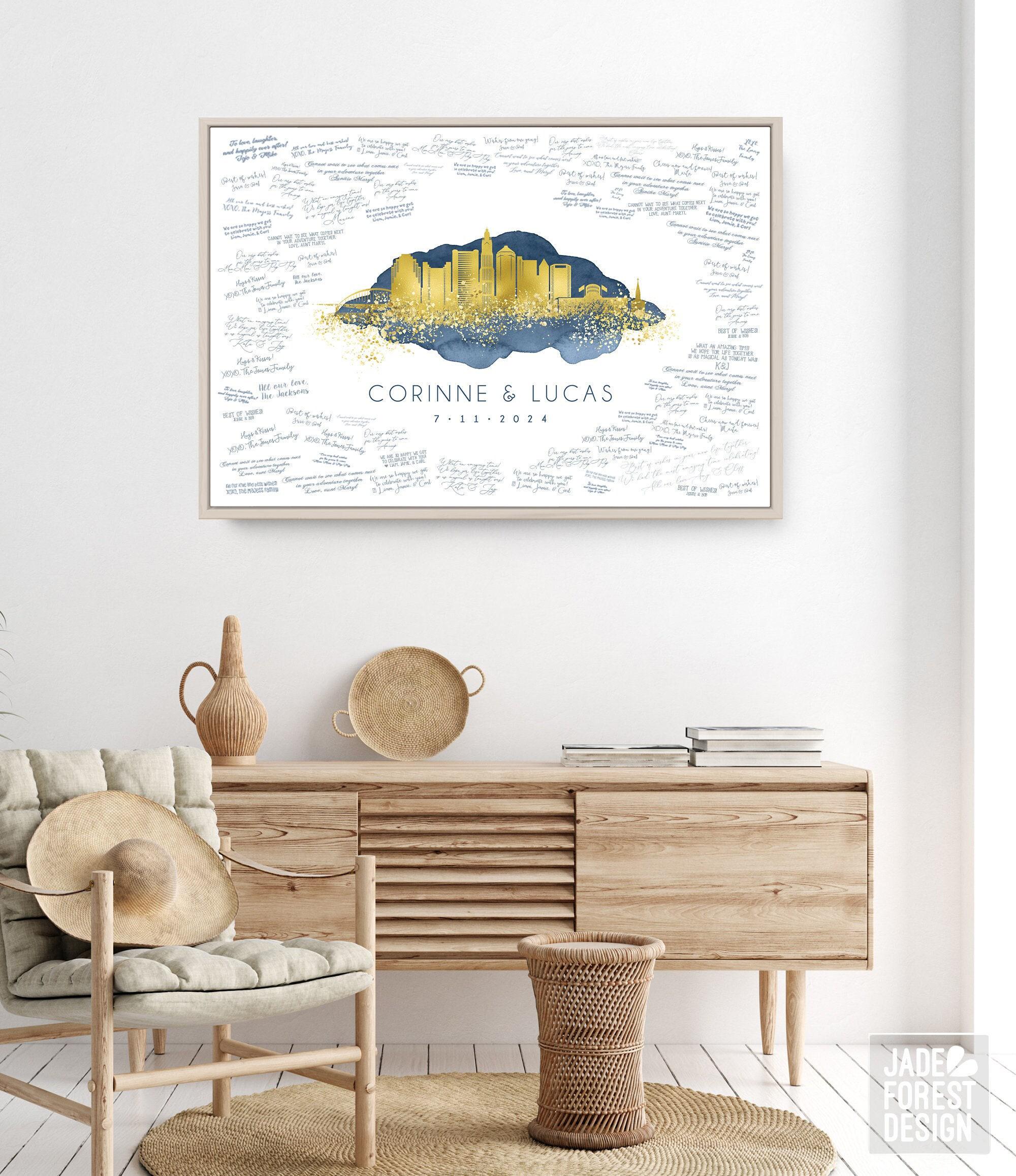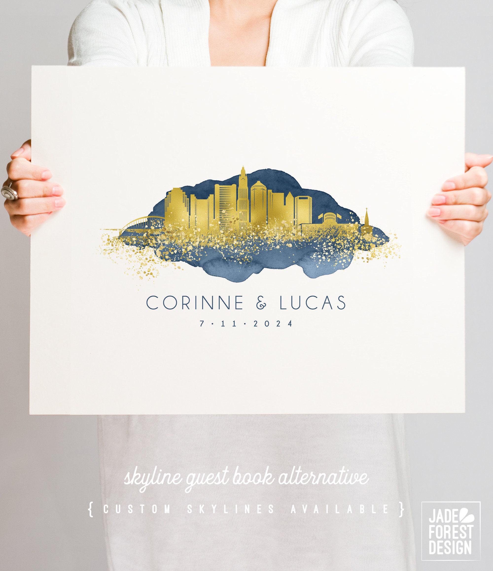 Celebrate your love story with a beautifully crafted wedding guest book alternative that captures the essence of your special day. This custom skyline art, featuring the iconic Columbus skyline, blends rustic wedding decor with a stunning hand painted look in cobalt blue and faux metallic gold. Designed as a canvas wedding sign, it offers a unique and modern wedding style that guests will love to interact with.