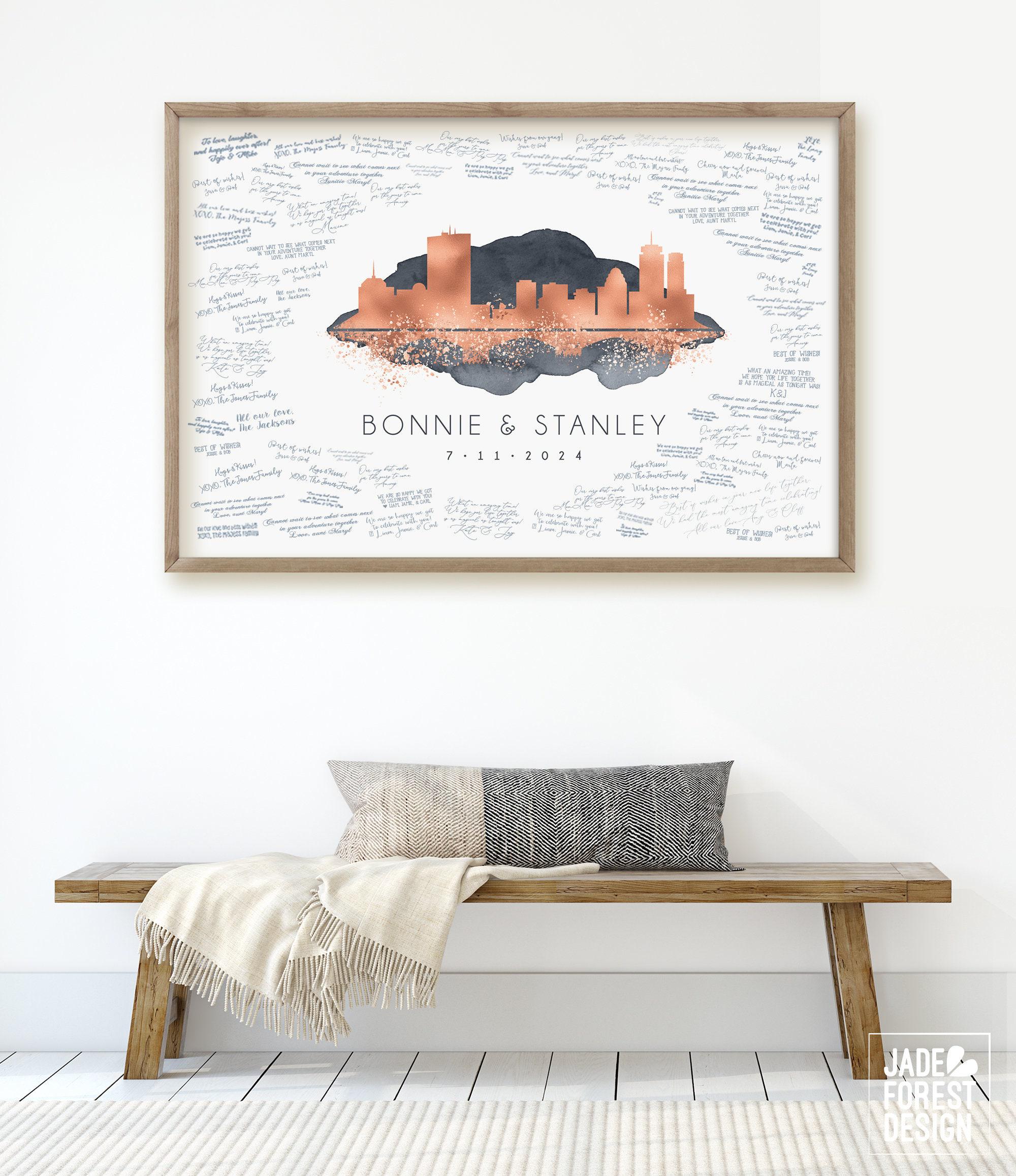 Are you in love with the city you're getting married in? With the one you're moving to? Or maybe where you're from? Celebrate your love affair with our CUSTOM SKYLINE GUEST BOOK. It features your city skyline in a stunning faux metallic, enveloped with romantic watercolor. The artwork will be personalized with your names and wedding date, your choice of colors, and skyline (see list in Photos for available cities).