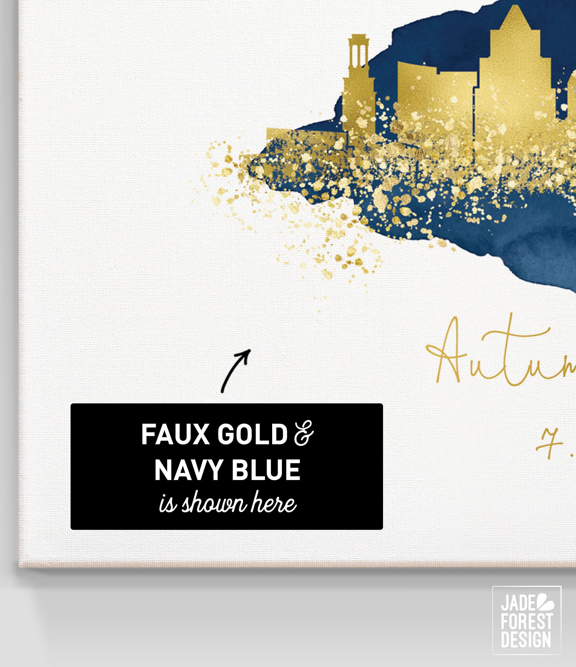 - ✅ Personalized with your names, wedding date, and choice of colors for the watercolor background, and the faux metallic skyline