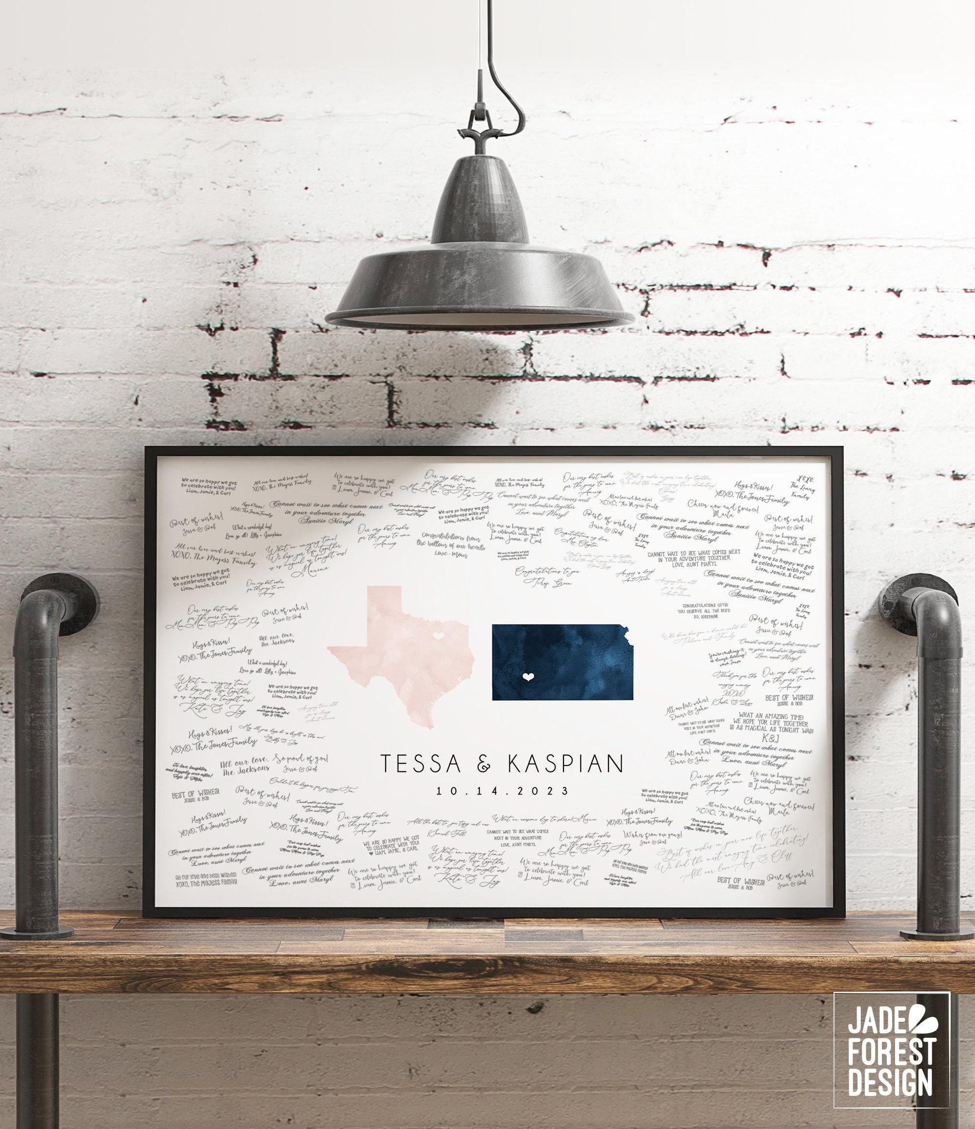 Celebrate your unique love story with this beautifully personalized wedding guest book alternative, designed as a custom love map that highlights your special connection between your two states or countries. This guestbook features a romantic watercolor texture, making it an elegant keepsake after guests sign around the artwork of your chosen locations. Crafted to be both meaningful and visually stunning, this guest book is perfect for couples looking for a distinctive way to capture memories.