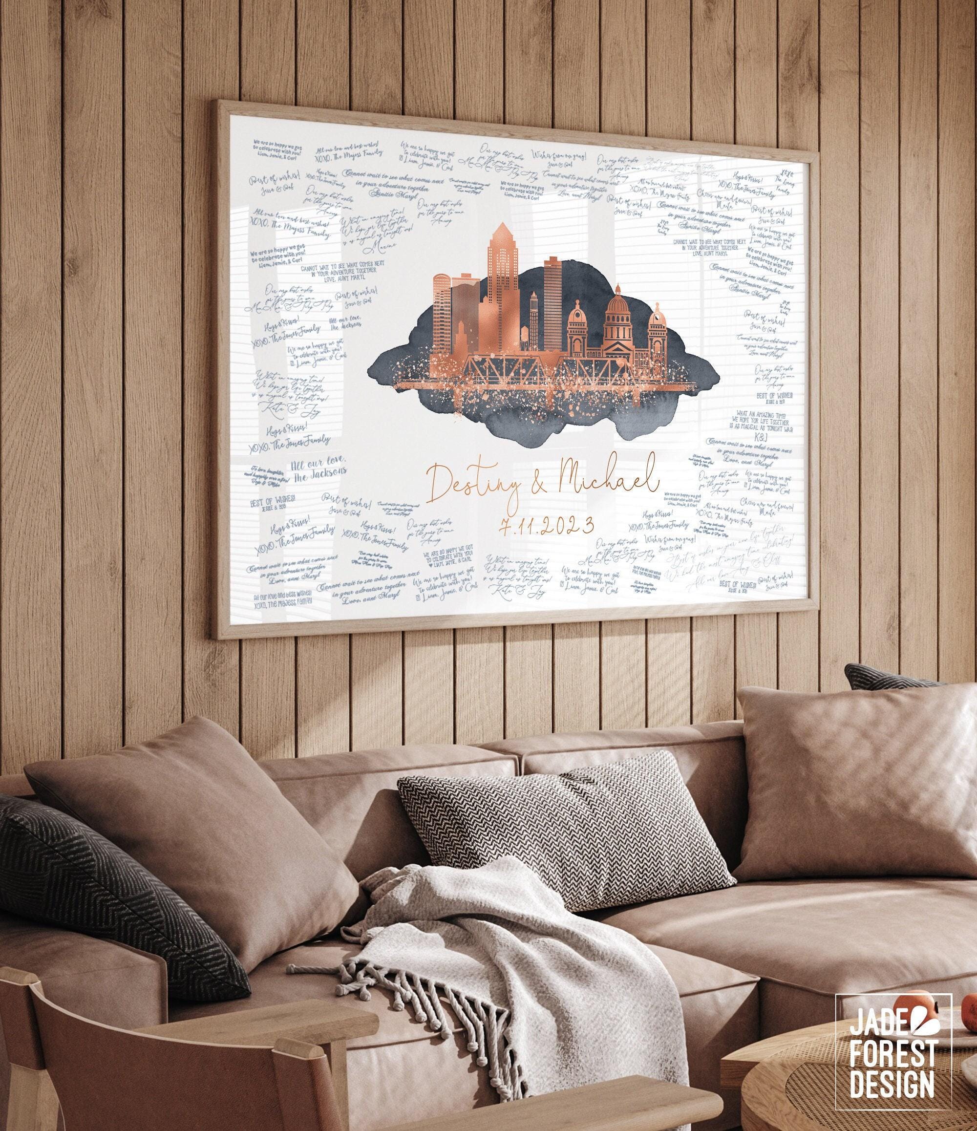 Celebrate your wedding day with a bespoke guestbook that beautifully captures the Des Moines skyline in elegant rose gold watercolor and dark gray tones. This custom wedding guest piece blends a faux metallic design with romantic watercolor hues, creating a timeless keepsake for your special celebration. Perfect as a wedding keepsake art, it invites guests to leave heartfelt messages around a stunning city skyline print.