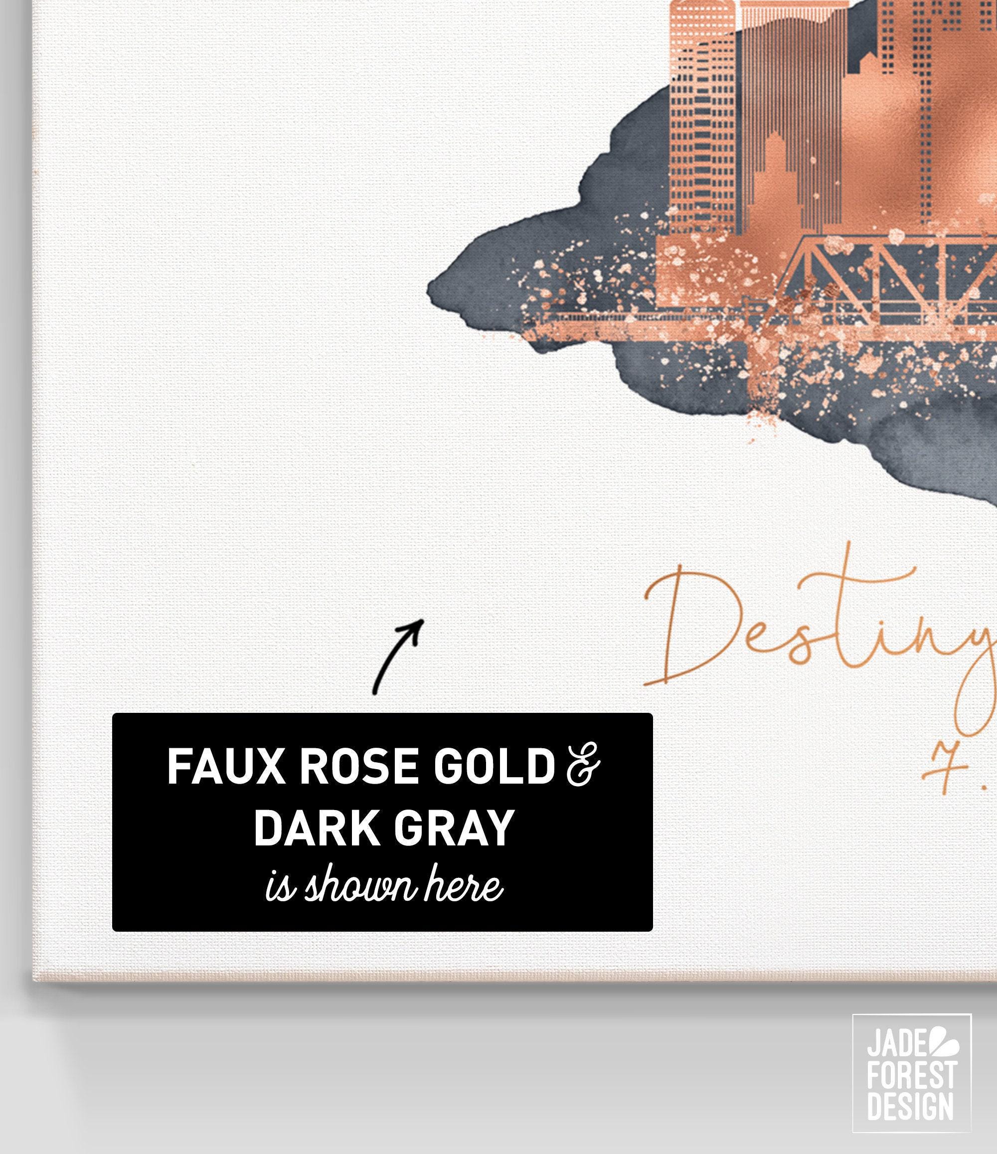 - ✅ Personalized with your names, wedding date, and choice of colors for the watercolor background, and the faux metallic skyline