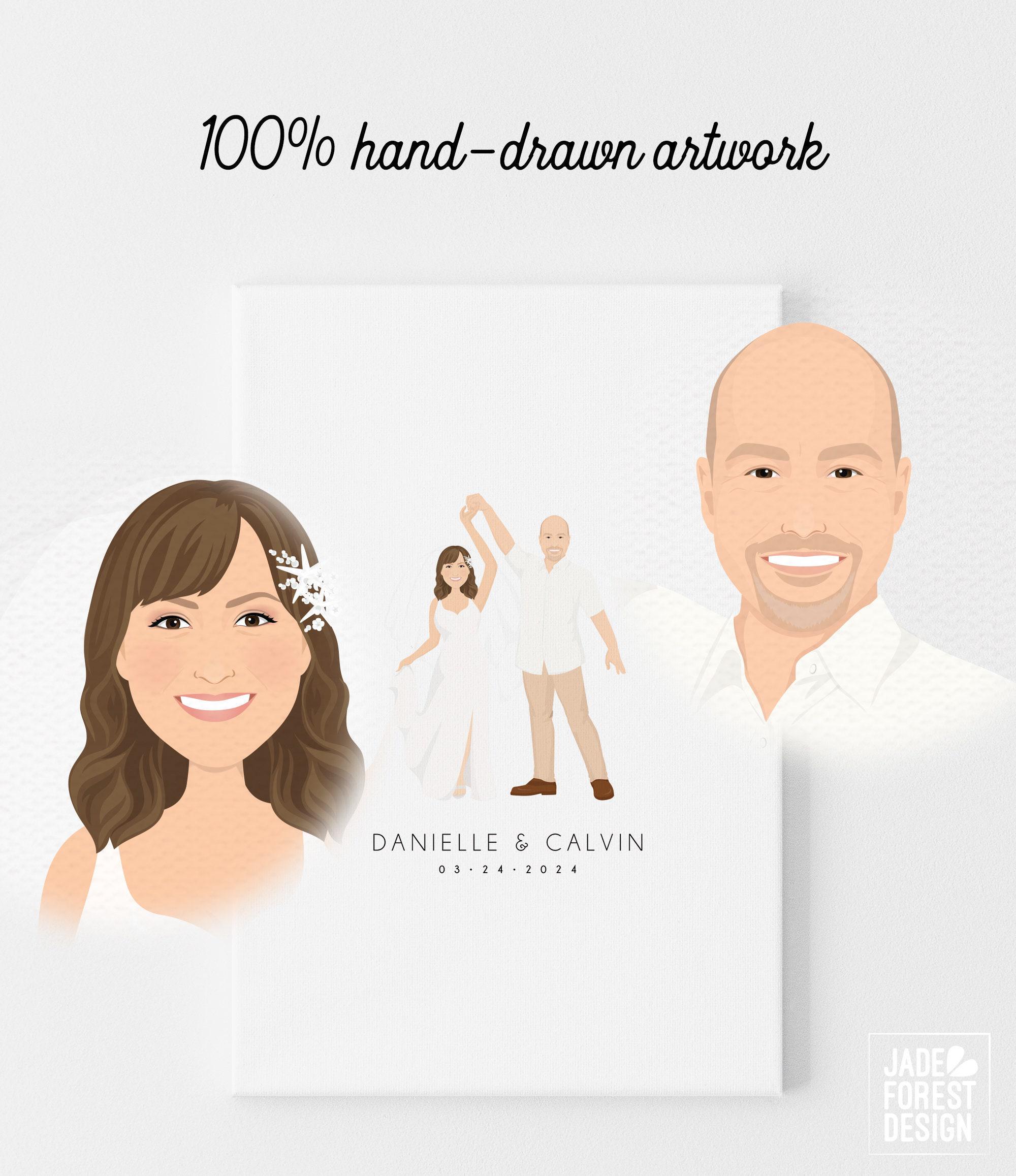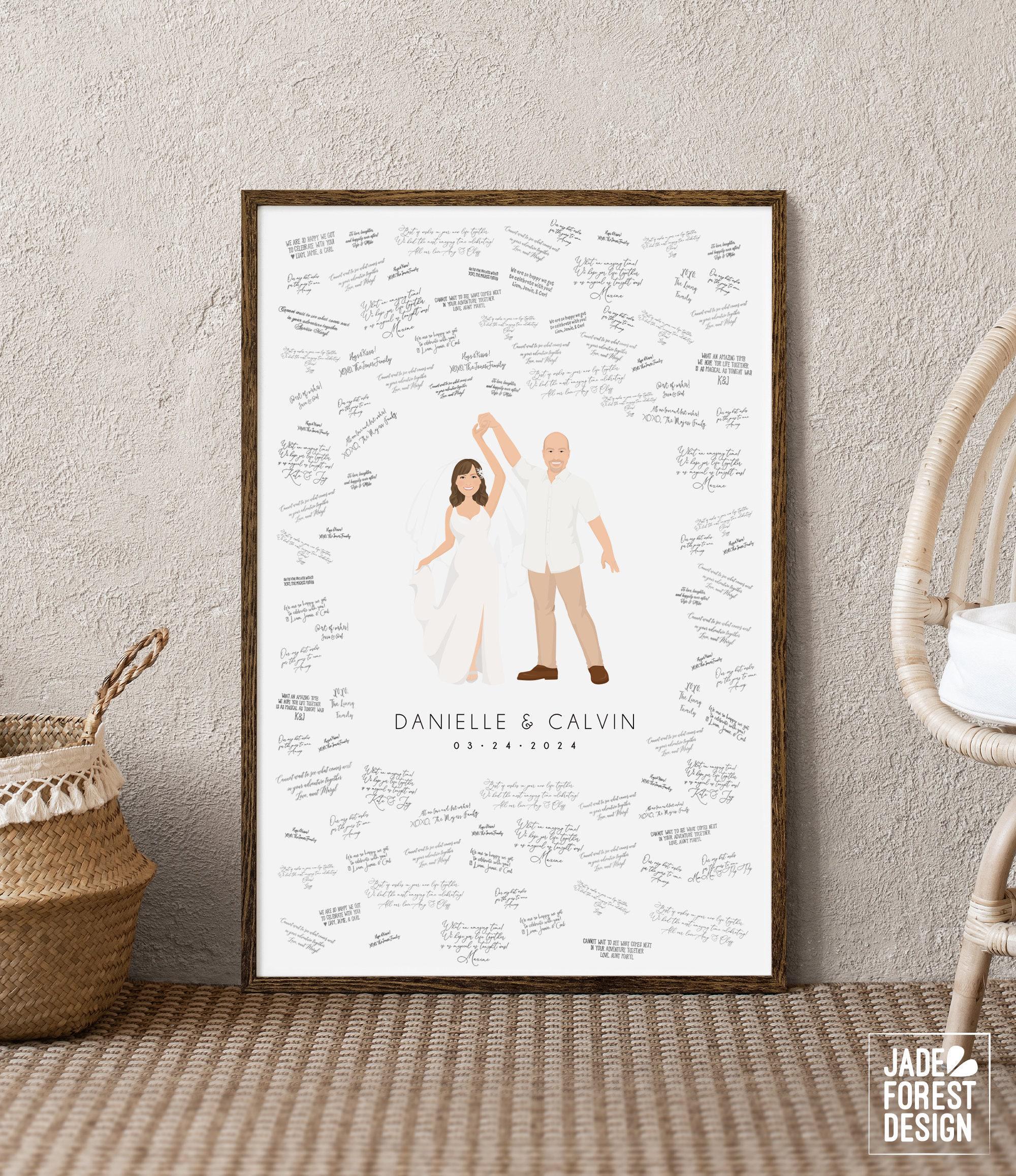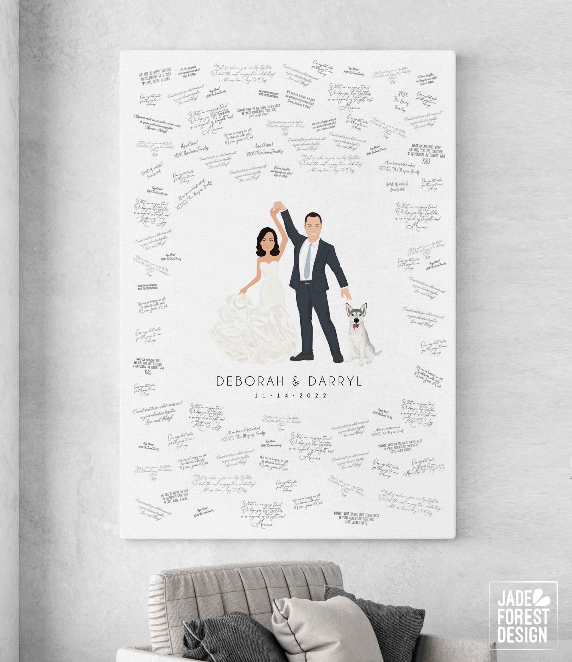 Celebrate your special day with a unique wedding guest book alternative that your guests will truly enjoy signing. This custom portrait guest book canvas features a charming cartoon illustration of the happy couple, personalized to include your likeness, pets, and favorite details. Designed as a whimsical keepsake, this personalized couple dancing art turns your memories into a joyful work of art that will brighten your home for years.