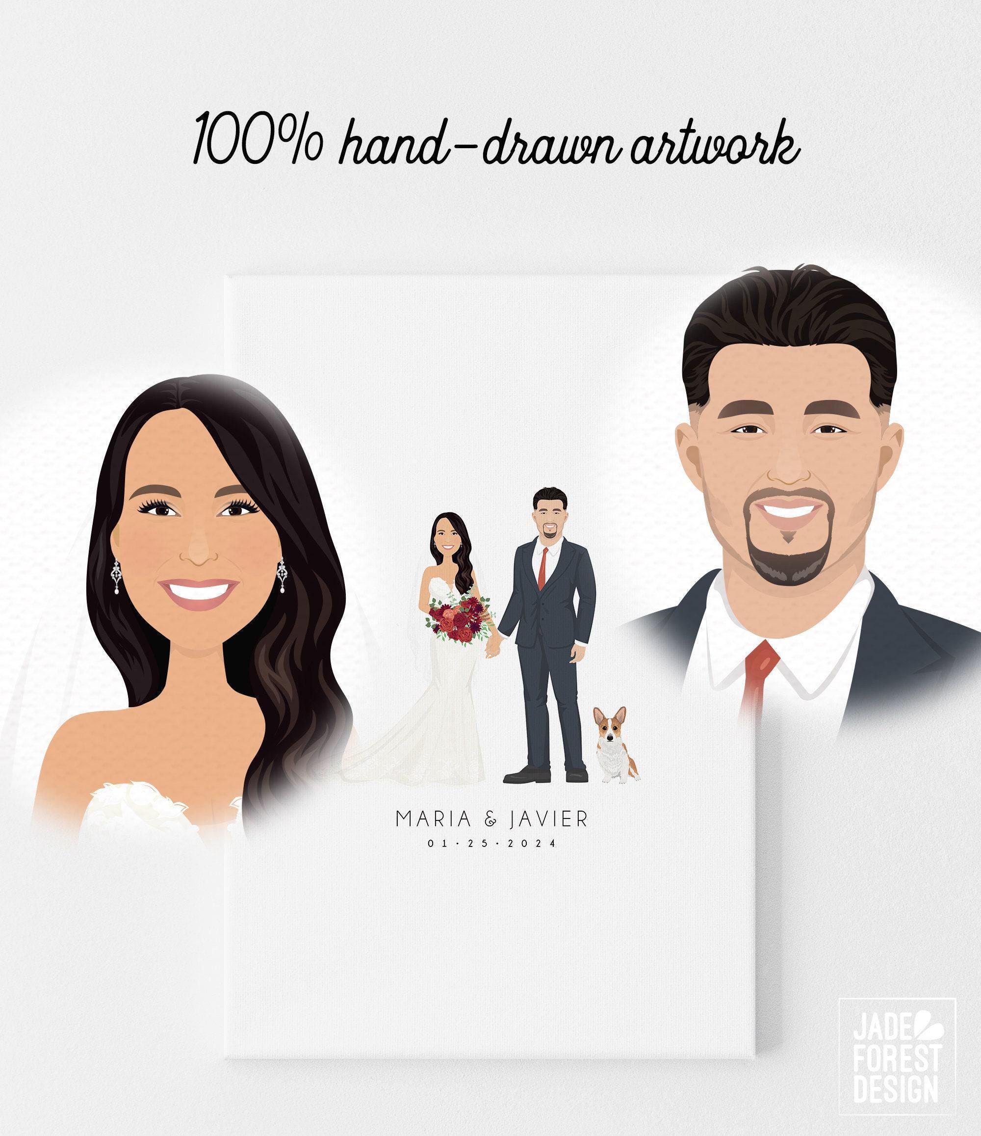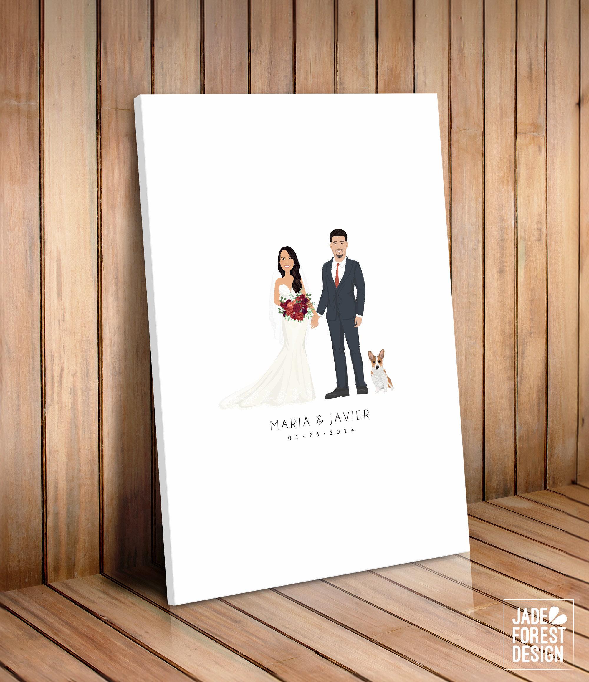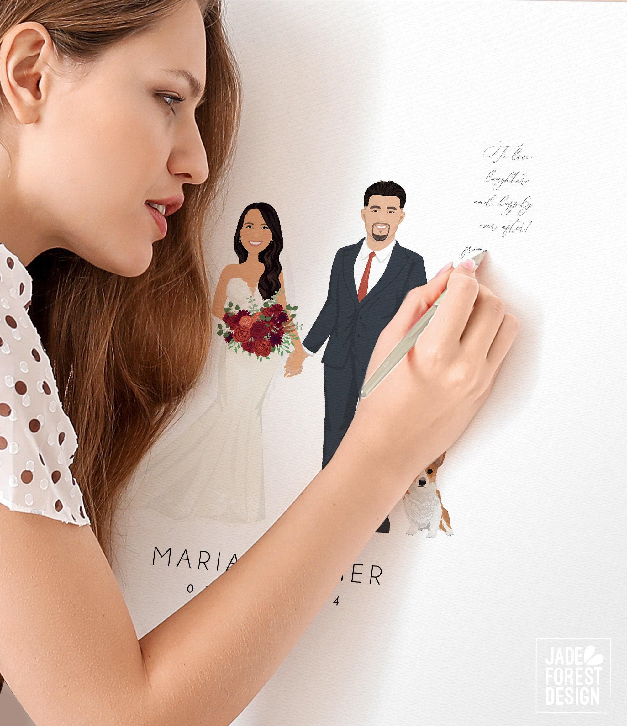Celebrate your special day with a unique wedding guest book alternative that your guests will truly enjoy signing. This custom portrait guest book canvas features a charming cartoon illustration of the happy couple, personalized to include your likeness, pets, and favorite details. Designed as a whimsical keepsake, this personalized couple dancing art turns your memories into a joyful work of art that will brighten your home for years.