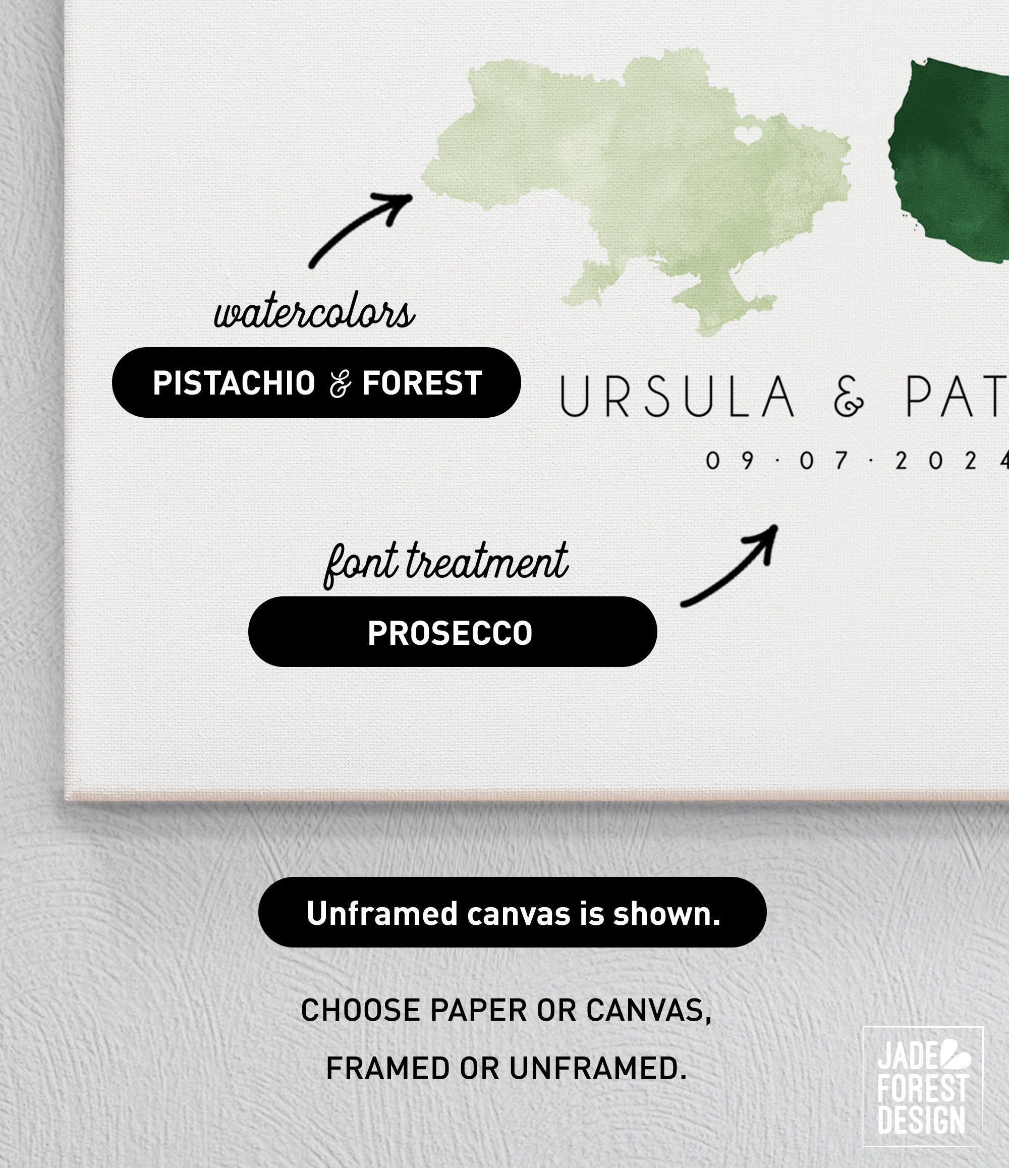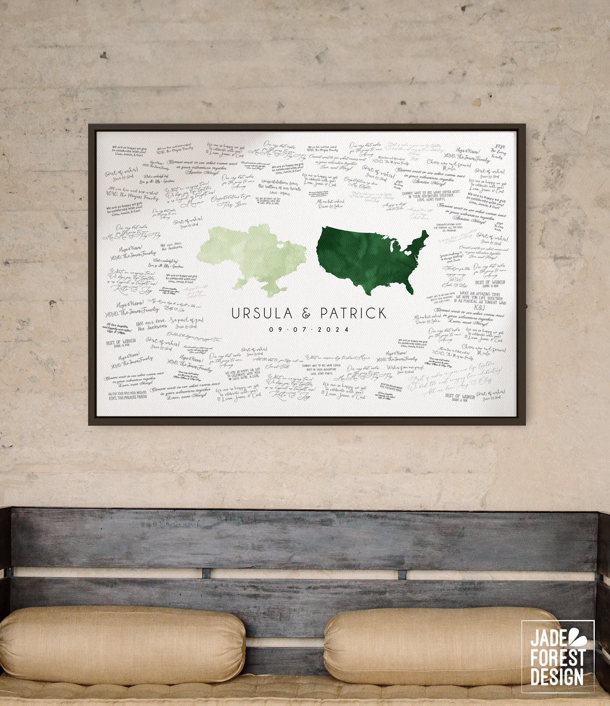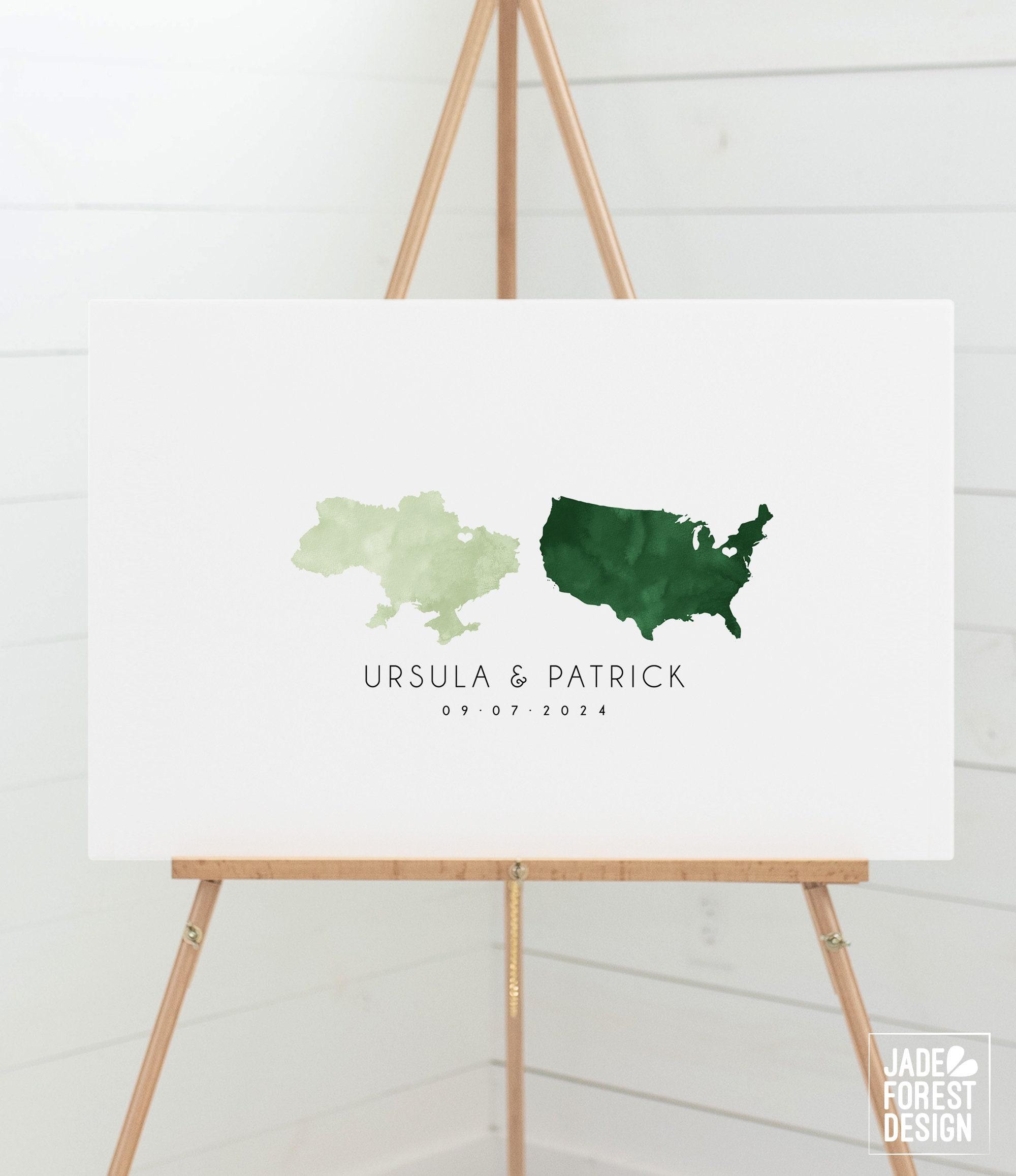 Celebrate your unique love story with this beautifully personalized wedding guest book alternative, designed as a custom love map that highlights your special connection between your two states or countries. This guestbook features a romantic watercolor texture, making it an elegant keepsake after guests sign around the artwork of your chosen locations. Crafted to be both meaningful and visually stunning, this guest book is perfect for couples looking for a distinctive way to capture memories.