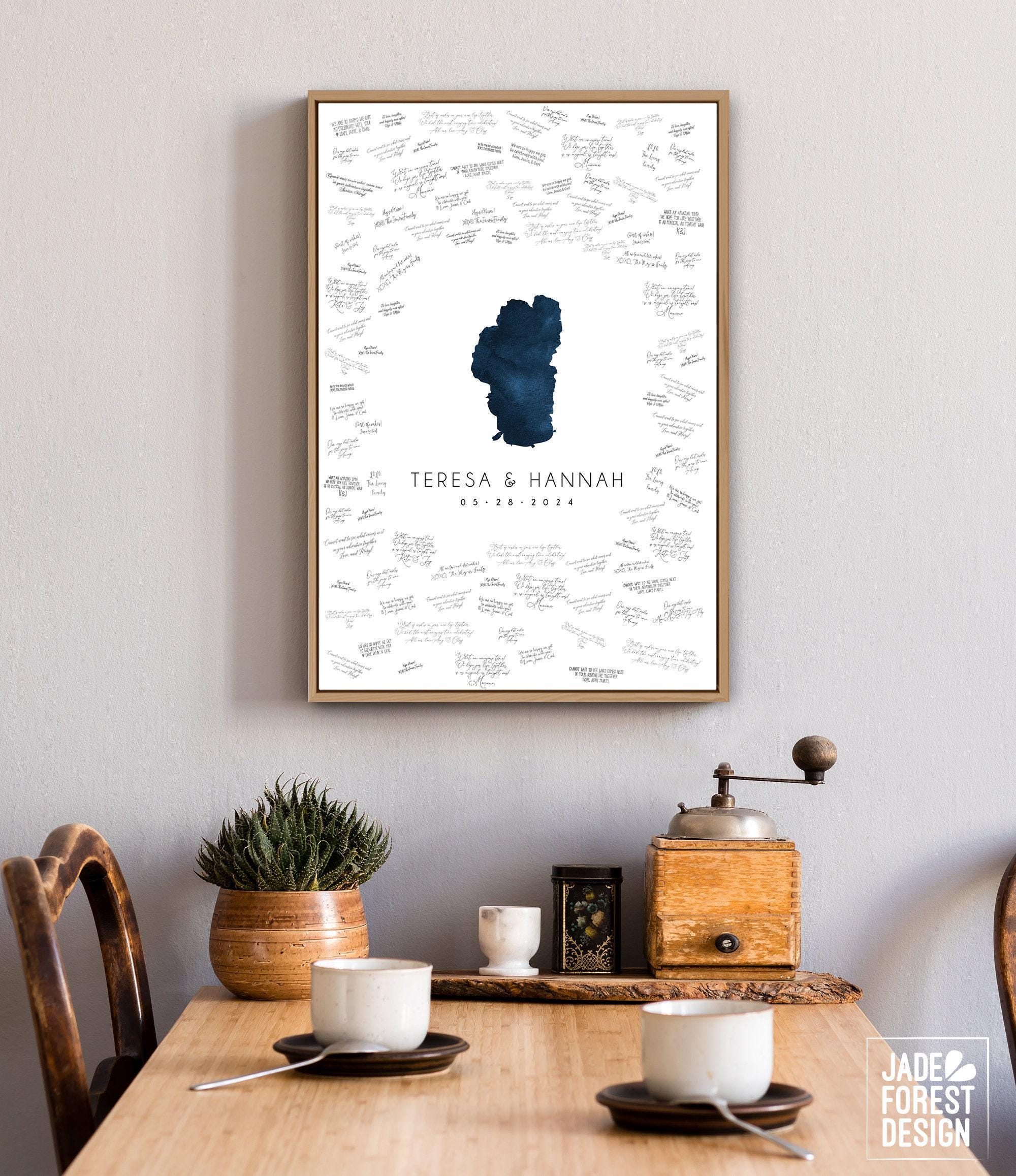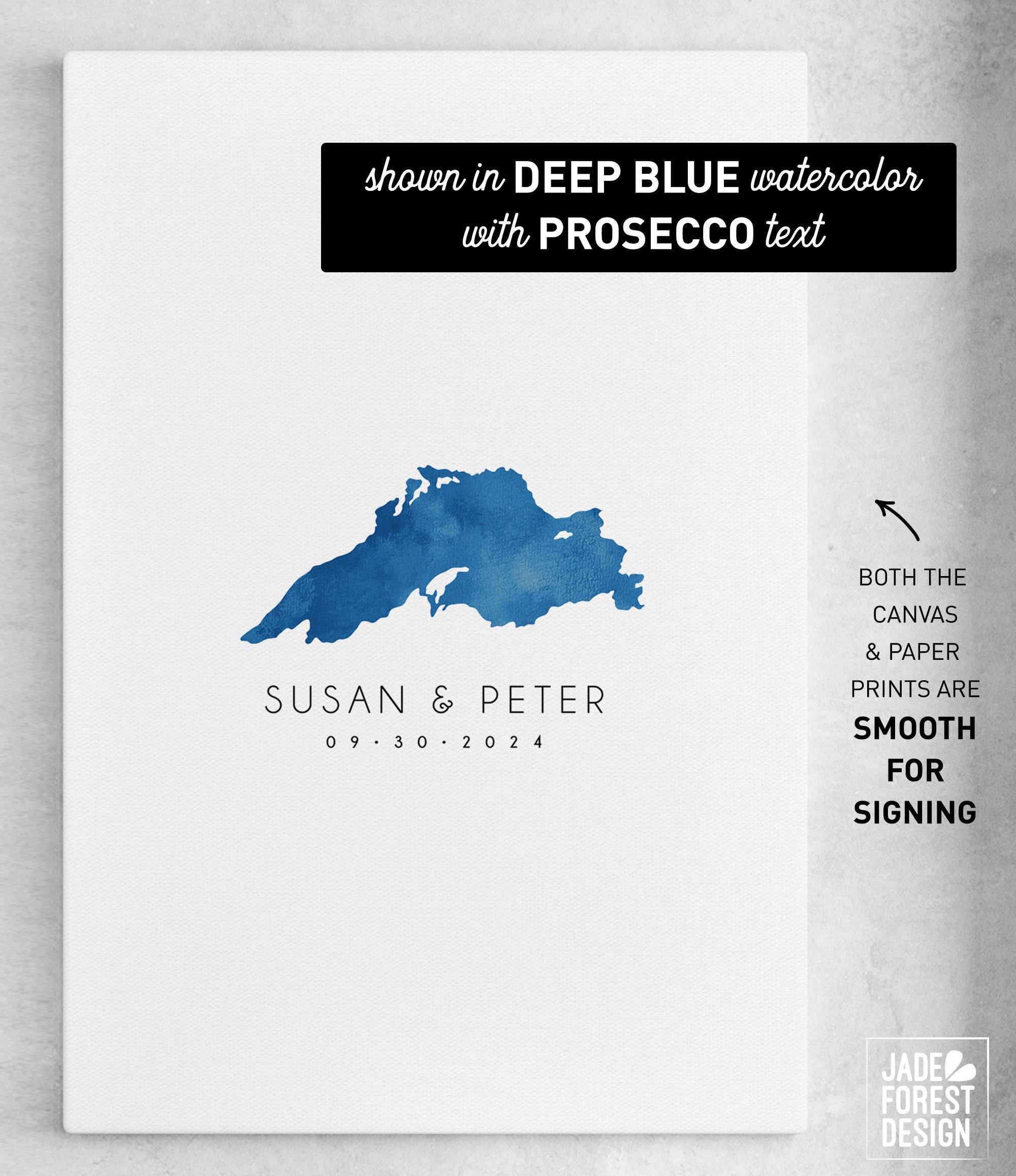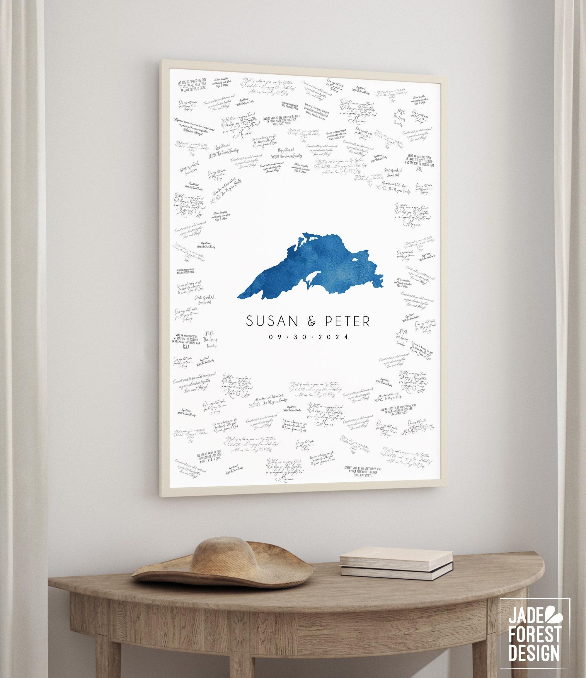 Celebrate your special day with a unique wedding guest book alternative that captures the beauty of your favorite lake in deep blue watercolor art. This custom lake shape design transforms your guest book into a personalized keepsake, perfect for Lake Superior weddings or any Great Lakes celebration. Crafted with care, this bespoke wedding guest book blends artistry and sentiment, making your event truly unforgettable.