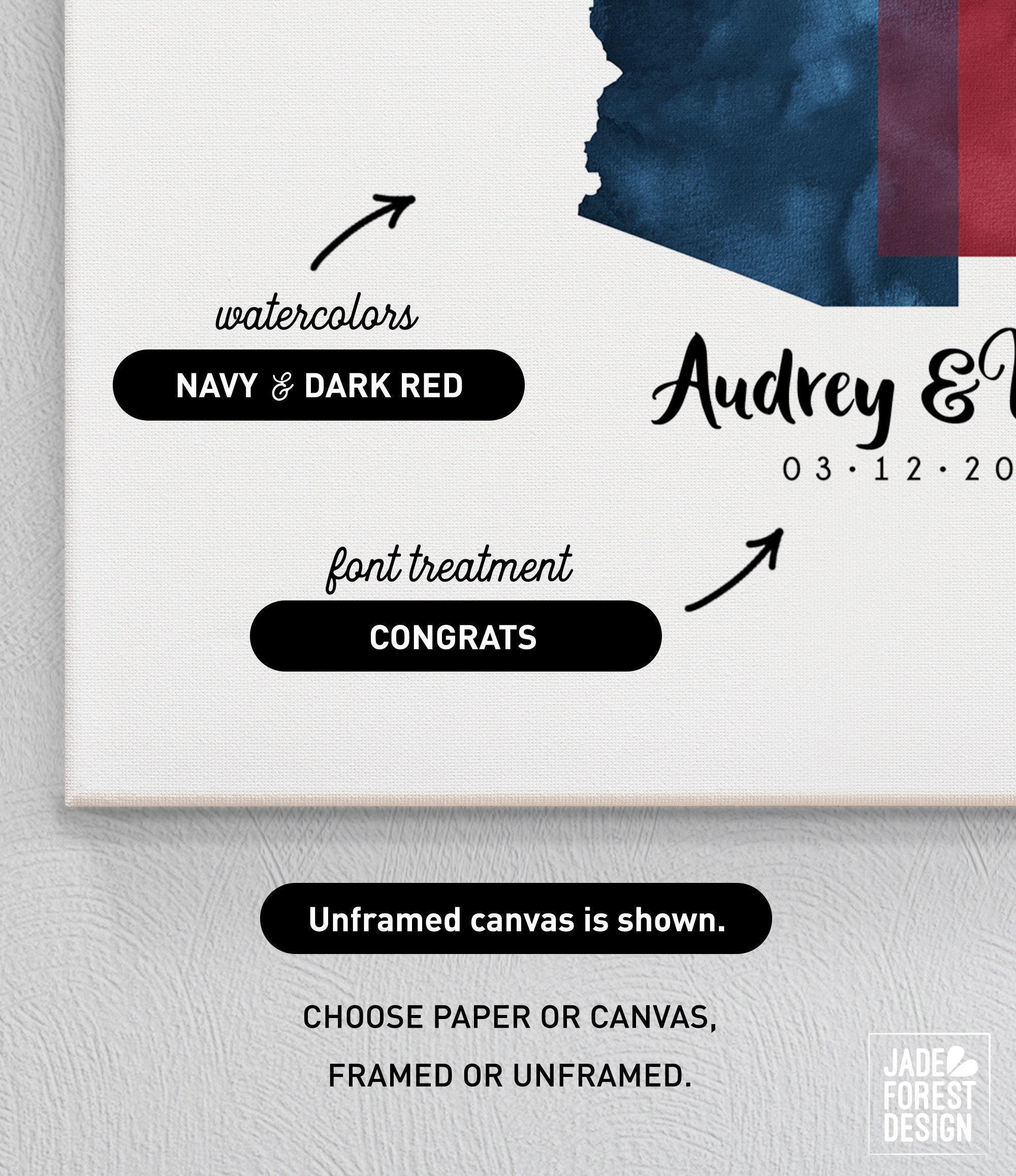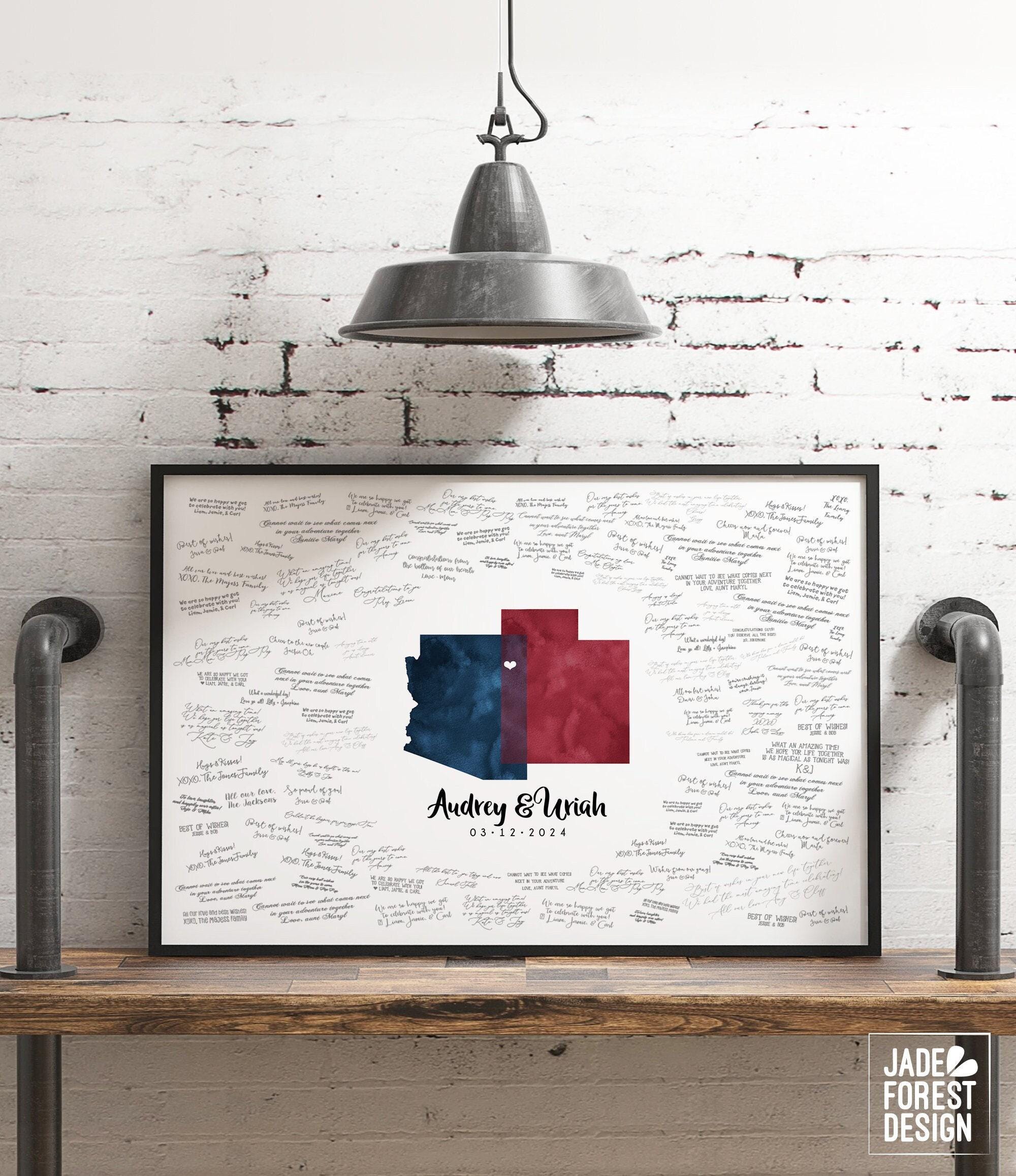 Celebrate your unique love story with a beautifully crafted watercolor guestbook map that blends your home states into a stunning wedding guest book alternative. This custom guestbook map captures the heartfelt intersection of Arizona and Utah, or any states or countries you choose, creating a meaningful keepsake for your special day. Guests sign around the artwork, making it a treasured piece of art to display and remember for years to come.