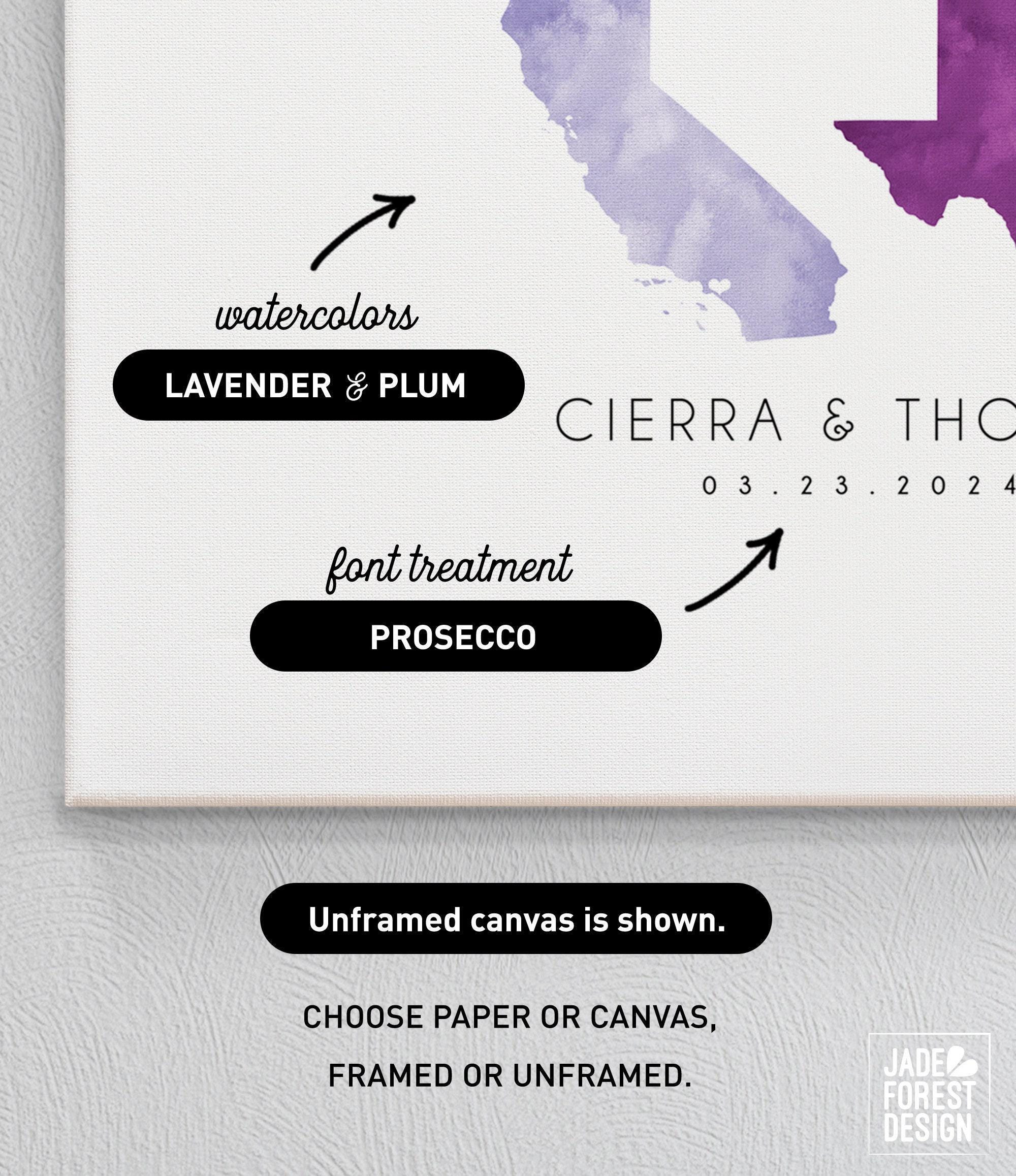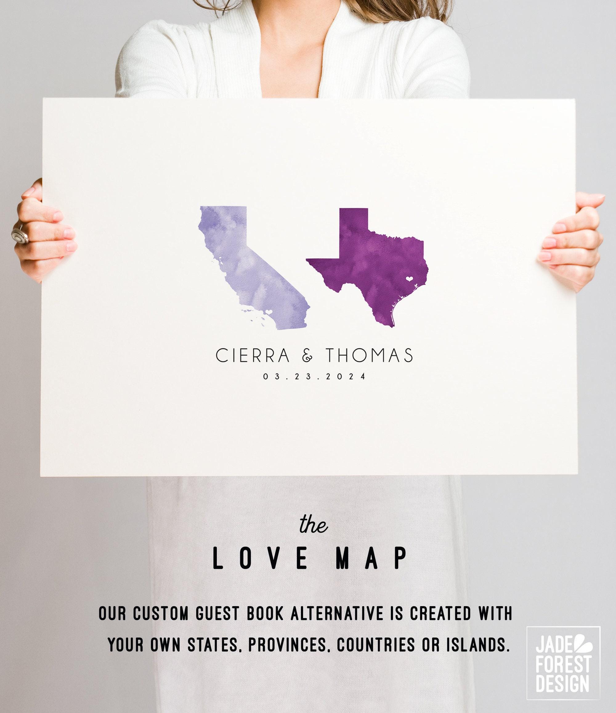Celebrate your unique love story with this beautifully personalized wedding guest book alternative, designed as a custom love map that highlights your special connection between your two states or countries. This guestbook features a romantic watercolor texture, making it an elegant keepsake after guests sign around the artwork of your chosen locations. Crafted to be both meaningful and visually stunning, this guest book is perfect for couples looking for a distinctive way to capture memories.