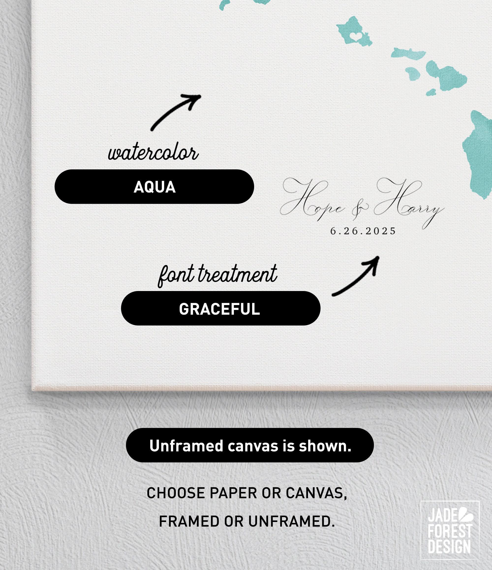 Celebrate your special day with a custom love map art piece that beautifully captures the essence of your journey. This unique Hawaii wedding decor features an aqua watercolor effect, perfect for adding a rustic touch to your guest book or wedding sign. Whether you choose canvas, paper, or digital format, this personalized keepsake highlights up to two meaningful cities with hearts marking your story.
