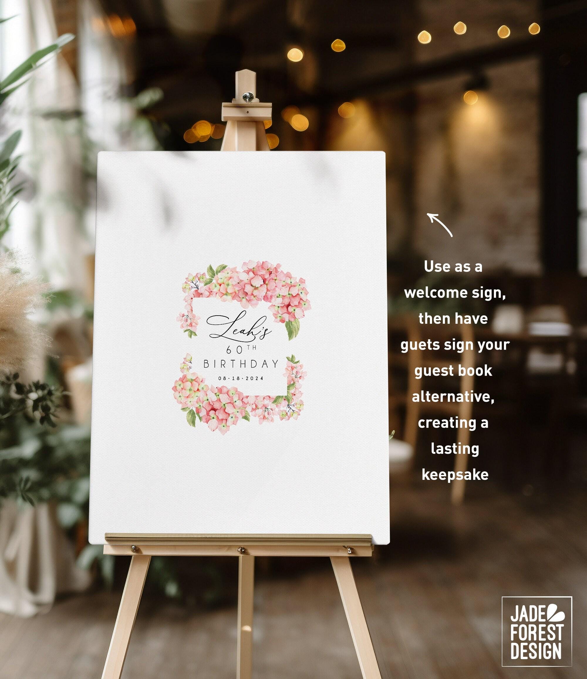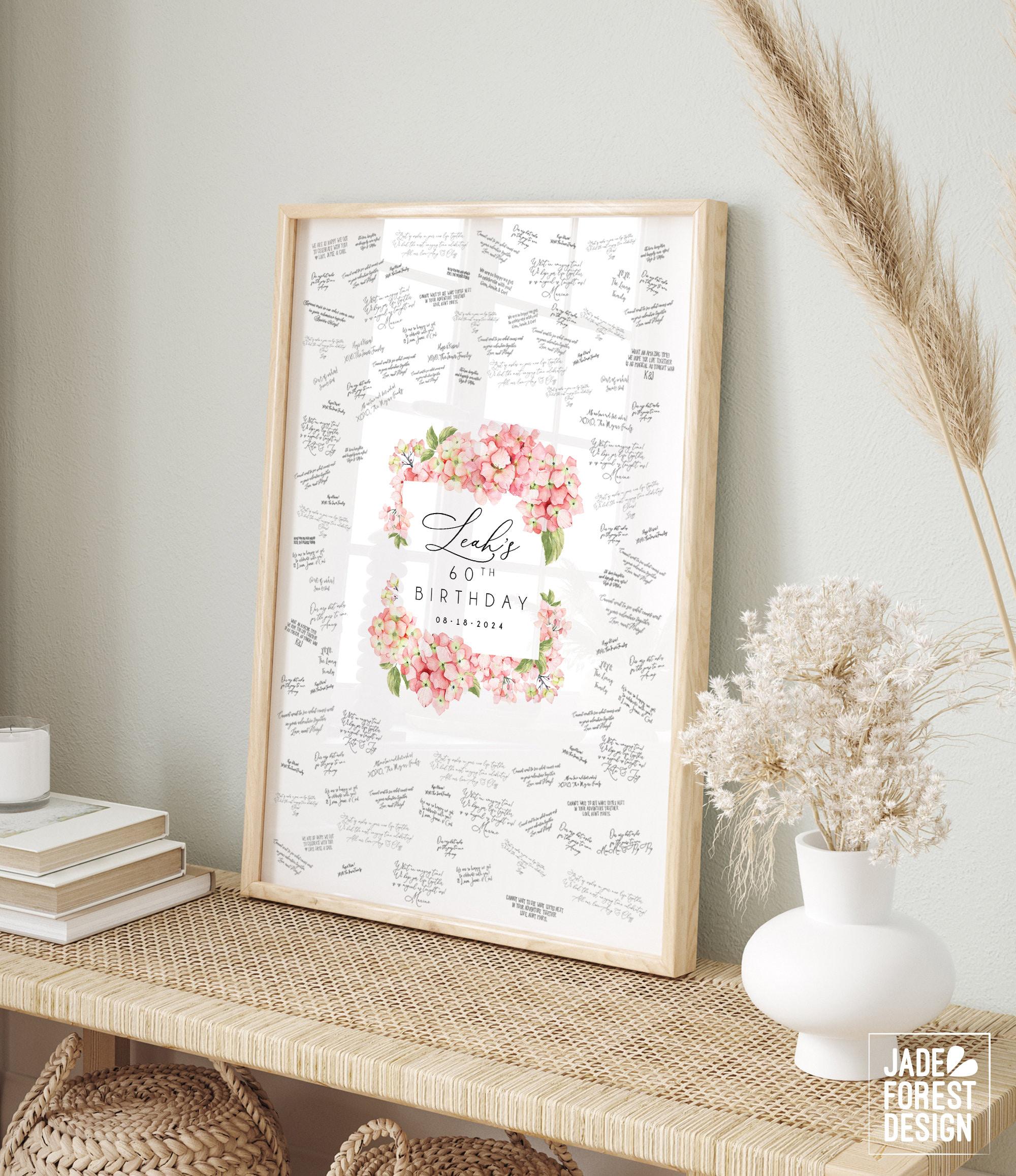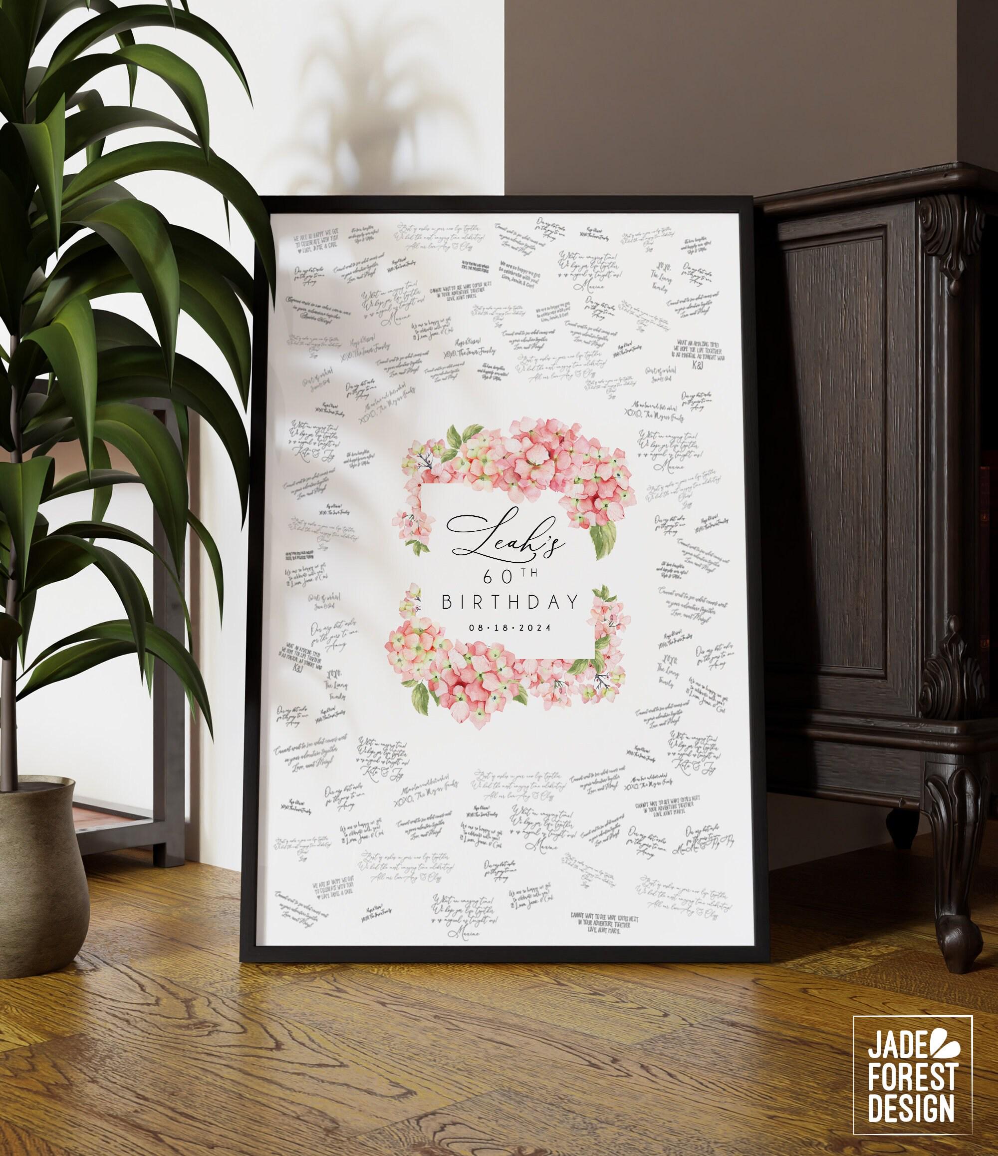 Celebrate your special occasion with our charming hydrangea guestbook, designed to add a touch of elegance and warmth to any 60th birthday party. Featuring a delicate pink green hydrangea motif, this signature guest book beautifully blends rustic wood frame accents with floral charm, making it a memorable keepsake for years to come. Crafted with care by Jade Forest Design, it’s perfect as a welcome sign decor that transforms into a treasured memento.