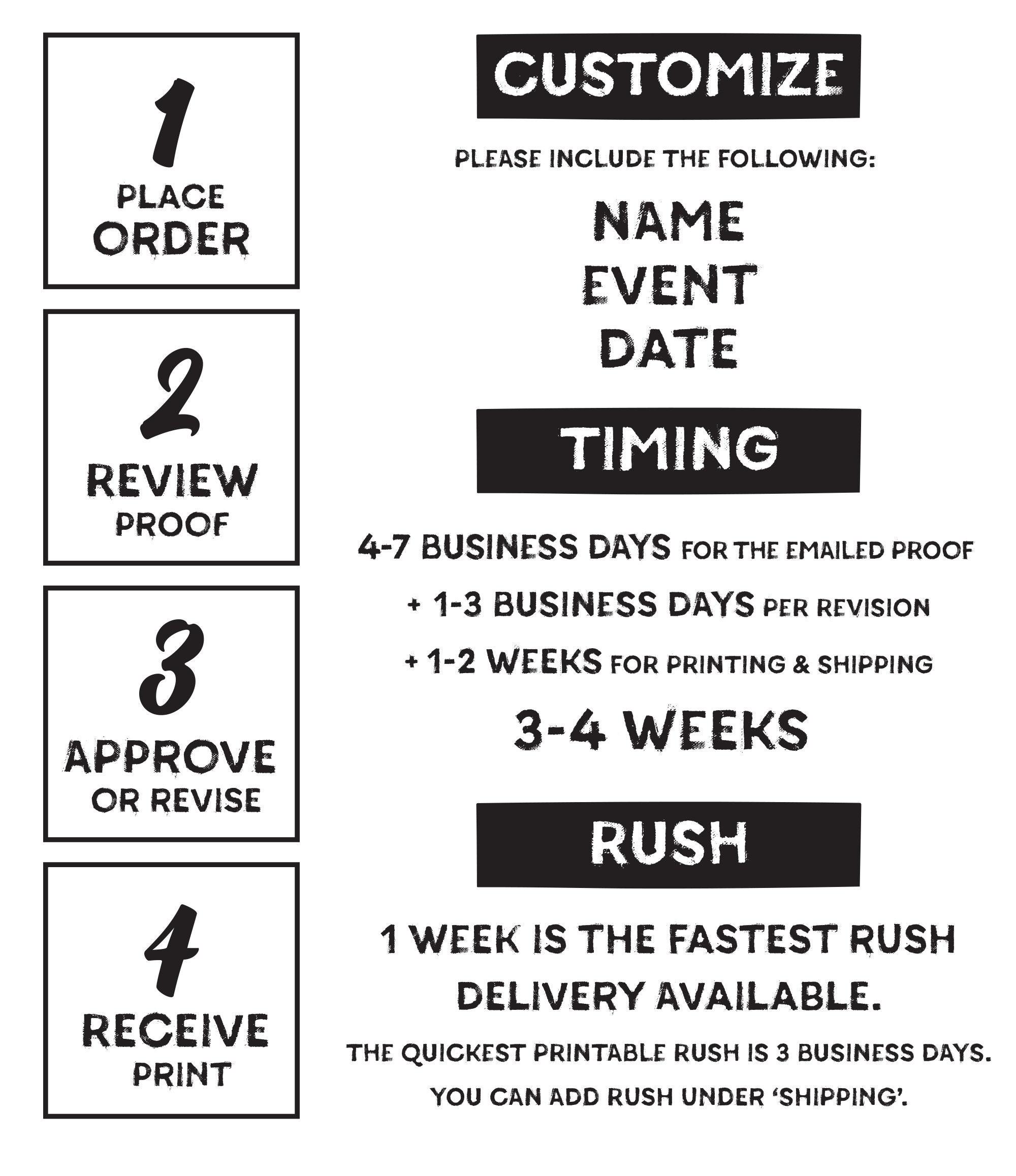 Printing and shipping takes approximately 2–3 weeks from proof approval. For PRINTABLE orders, you will be able to download and print as soon as you're happy with the emailed design.
