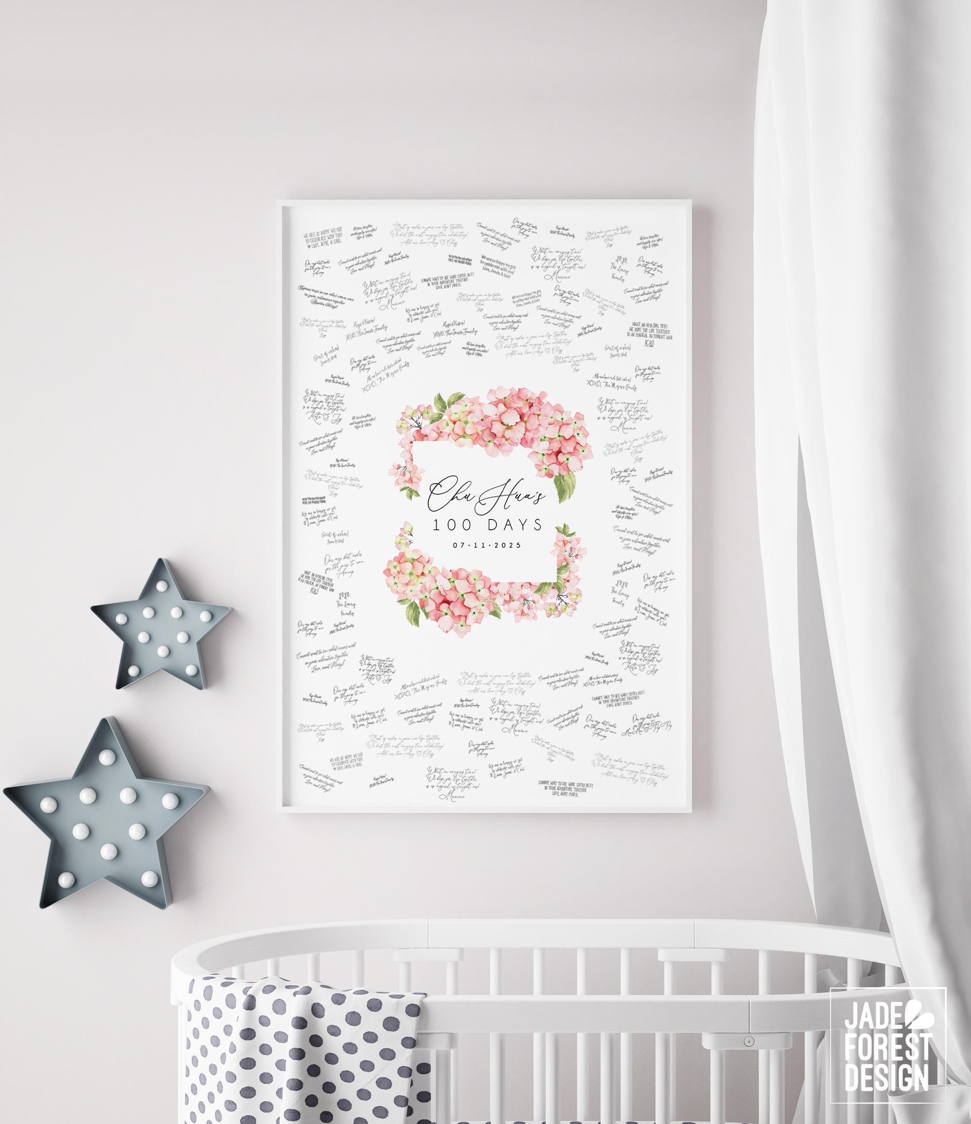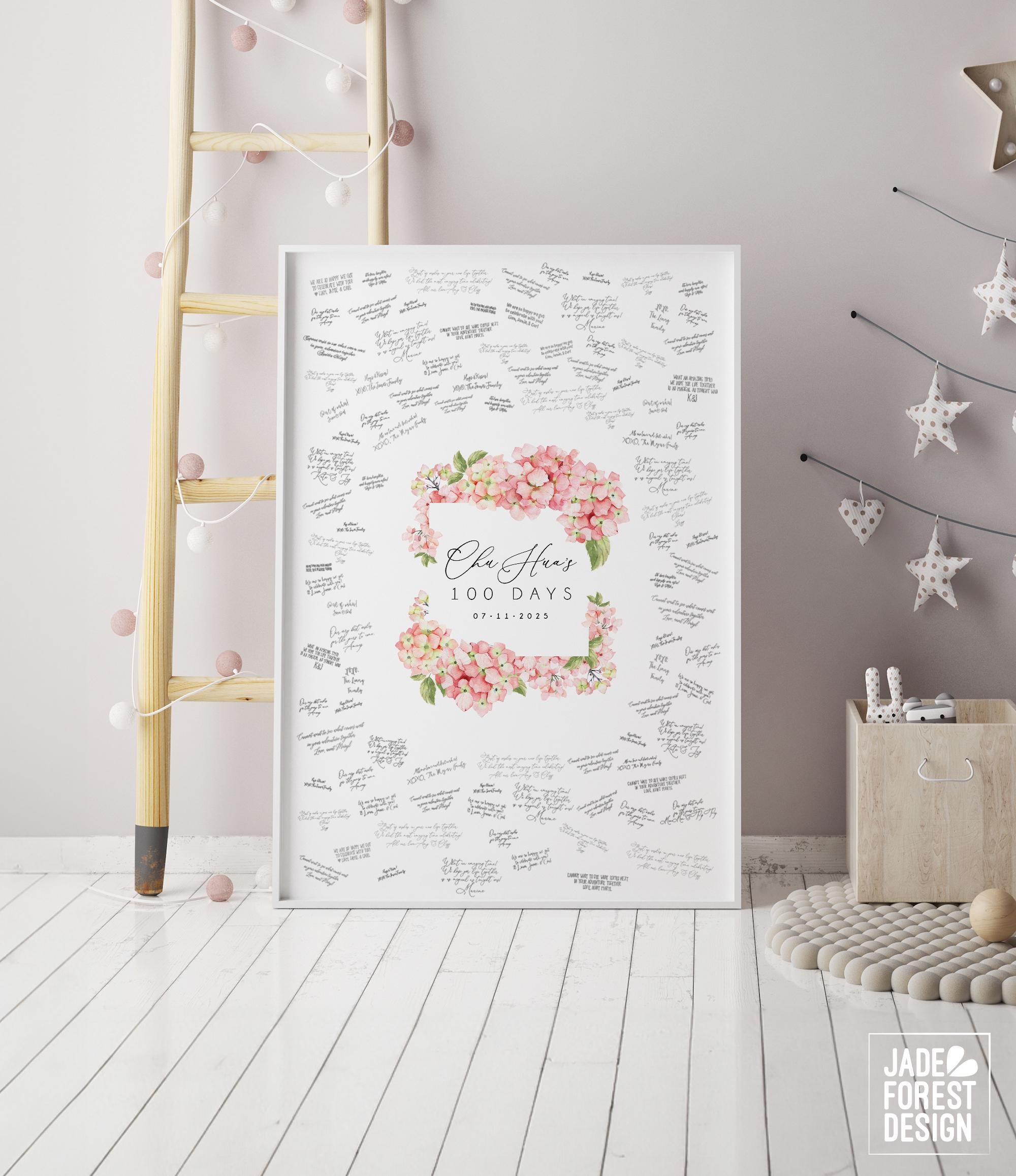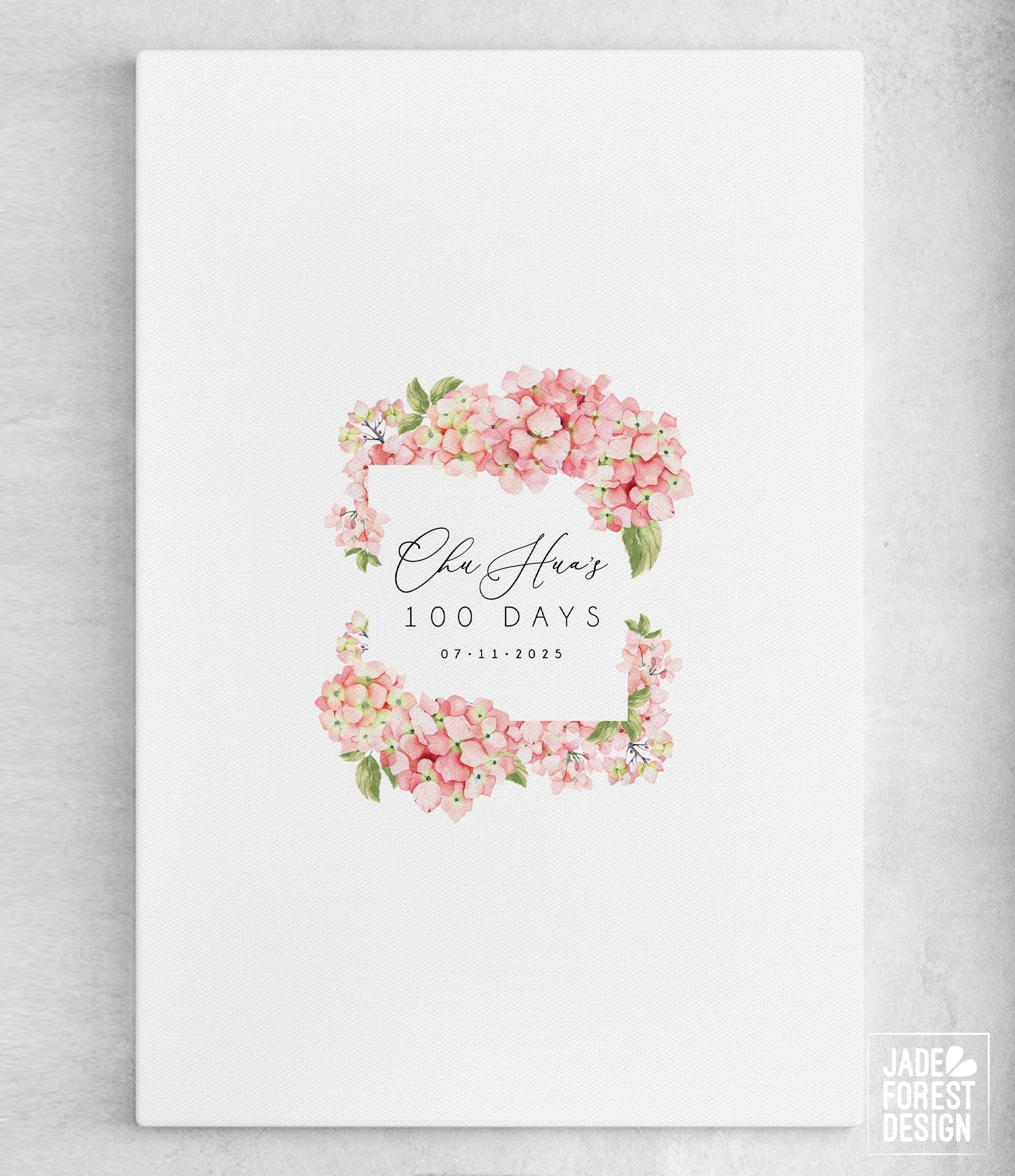 Celebrate your baby's milestone with a beautifully crafted hydrangea decor guestbook that doubles as a charming party guestbook and keepsake. This floral frame invites your guests to leave heartfelt messages around your personalized event details, creating a unique celebration sign for your 100 days decor. Designed with care, it transforms from an eye-catching welcome sign into a treasured memory to display for years.