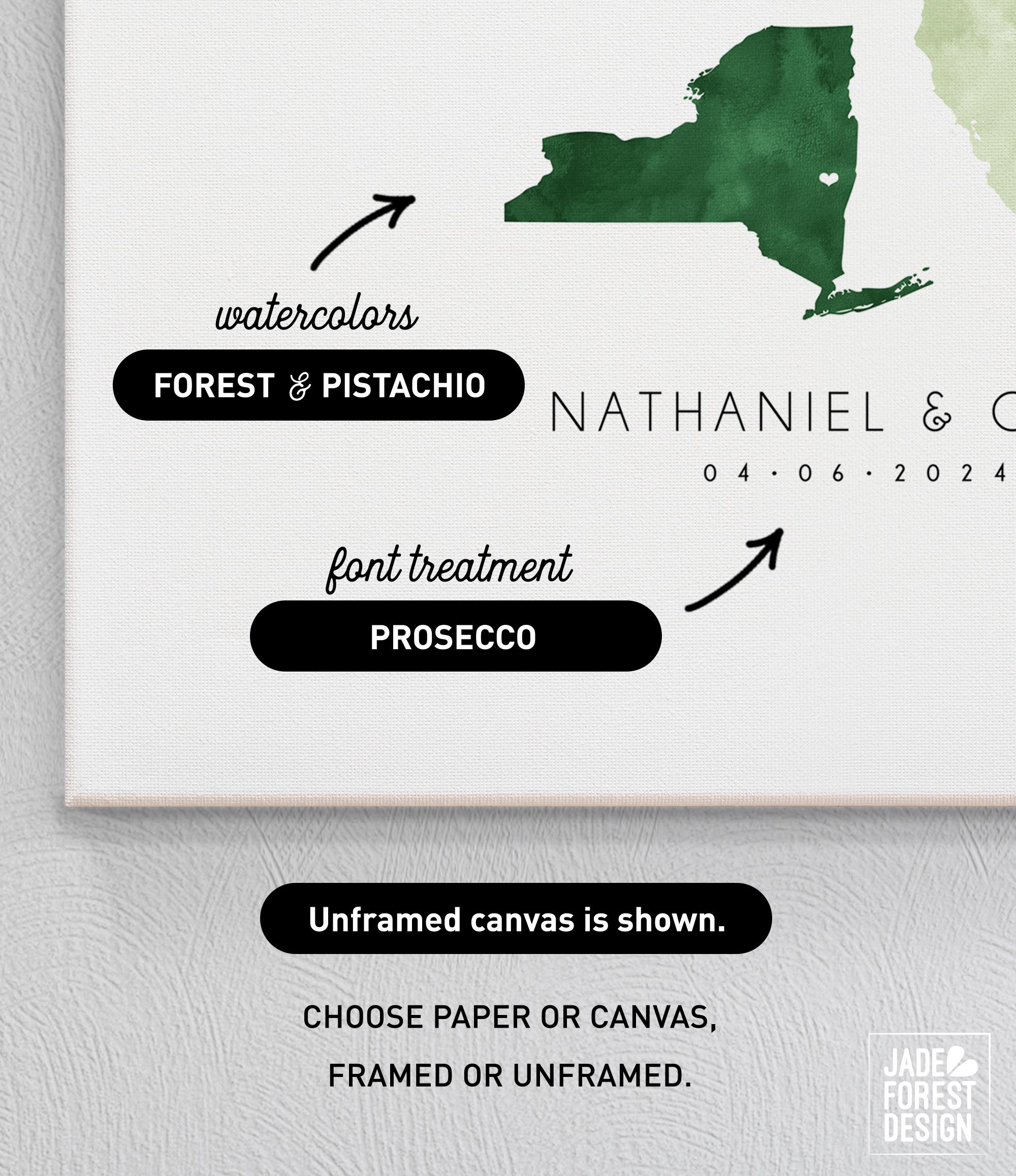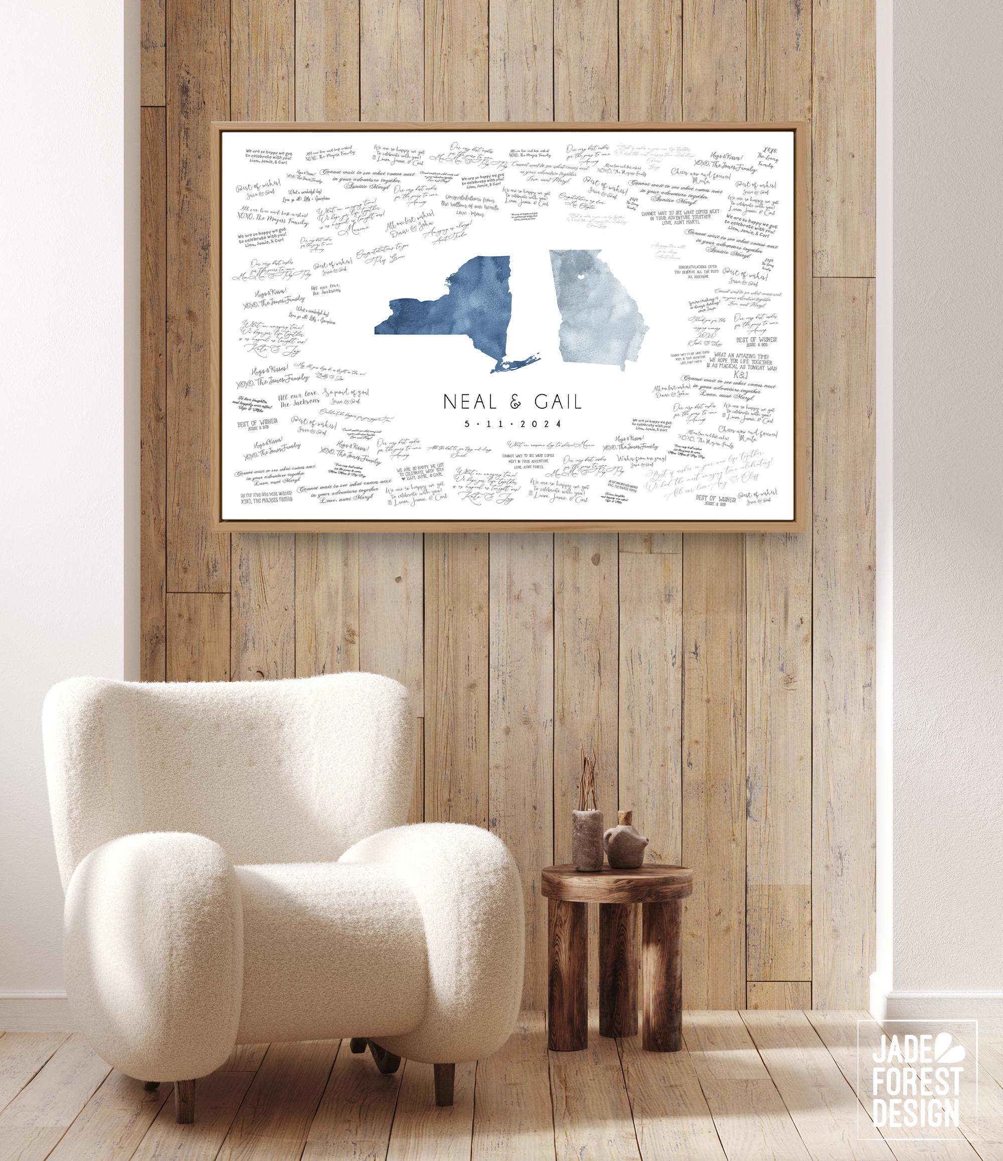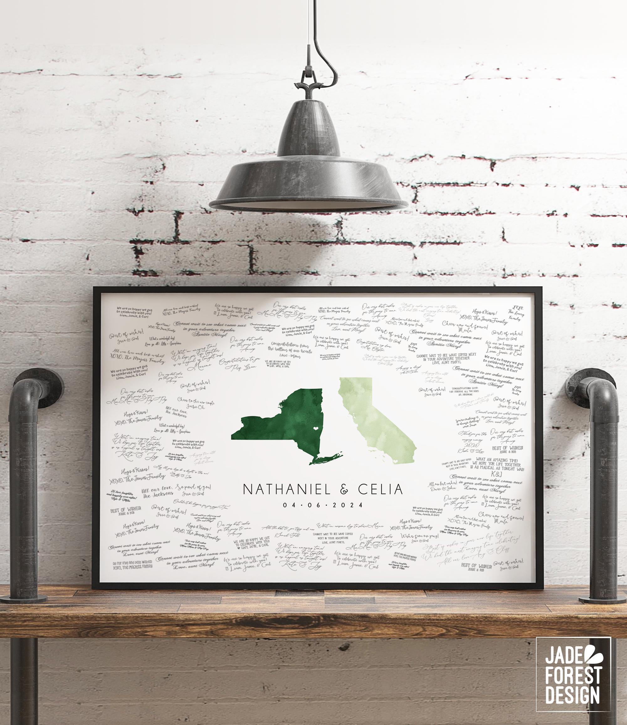 Celebrate your unique love story with a beautifully crafted guest book that doubles as a stunning piece of wedding entrance art. This custom watercolor state map guest book highlights your special locations with pistachio hues, making it a memorable keepsake for your California or New York wedding. Guests sign around the personalized artwork, creating an interactive and heartfelt memento that captures your journey together.
