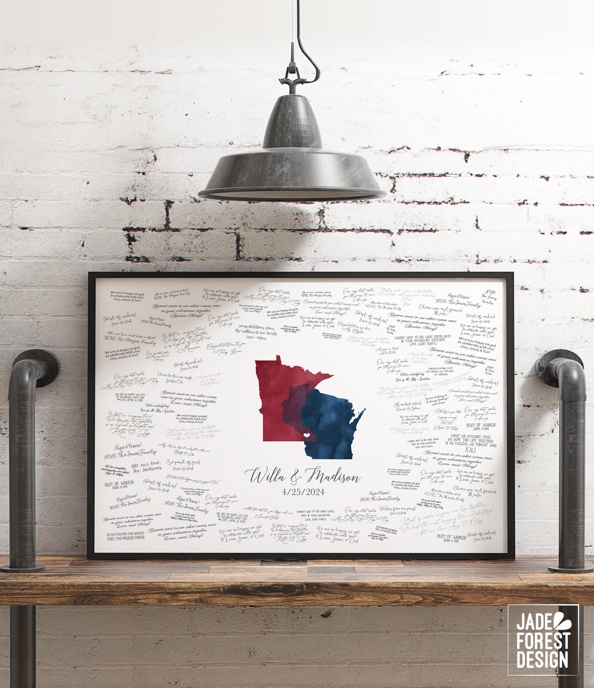 If you both come from different parts of the country, then our CUSTOM LOVE MAP guest book will tell your unique love story. It features your home states, done in a beautiful watercolor effect, overlapping and marked with a heart over an intersection of your cities. The artwork will be completely customized with your choice of states (or countries), cities, and colors.