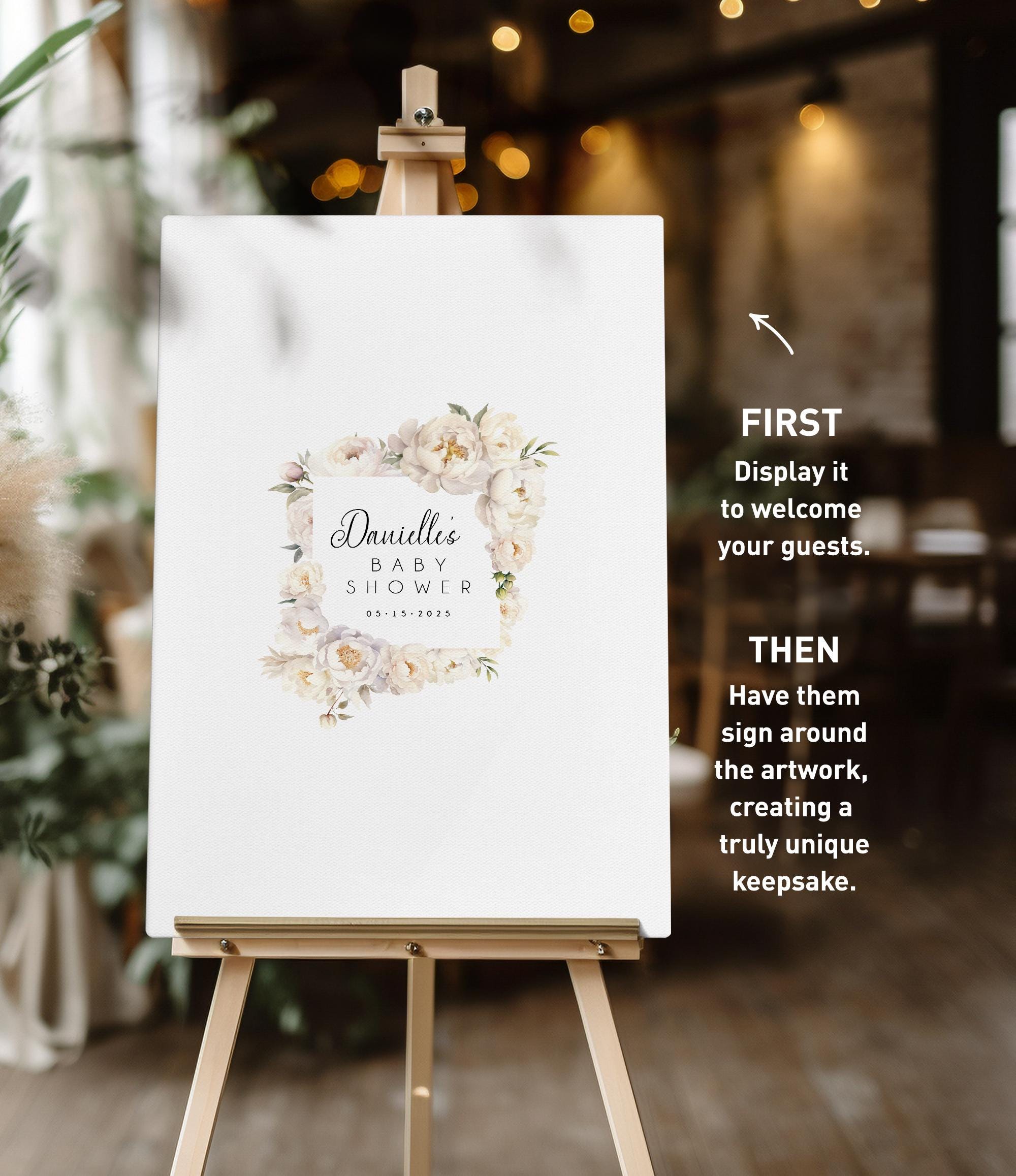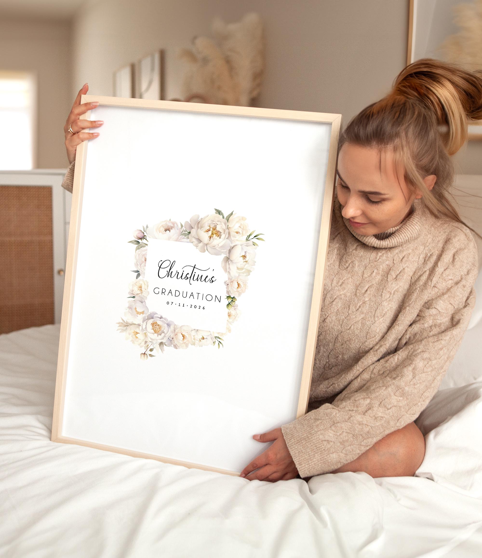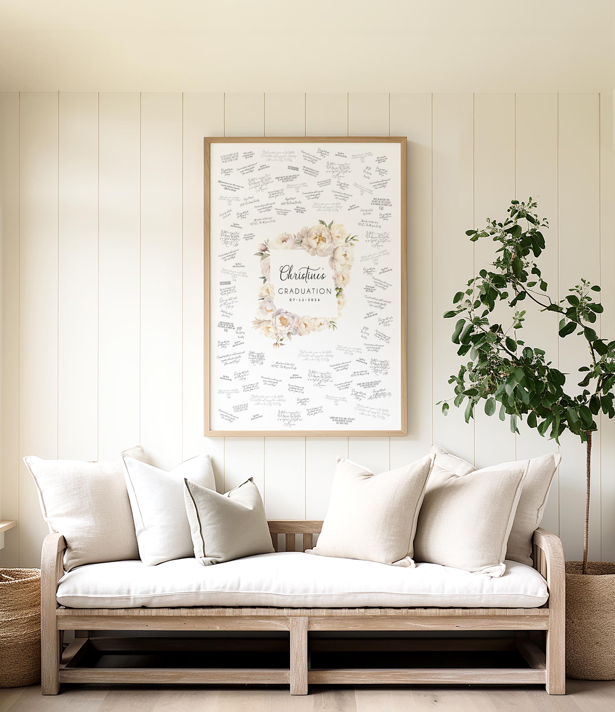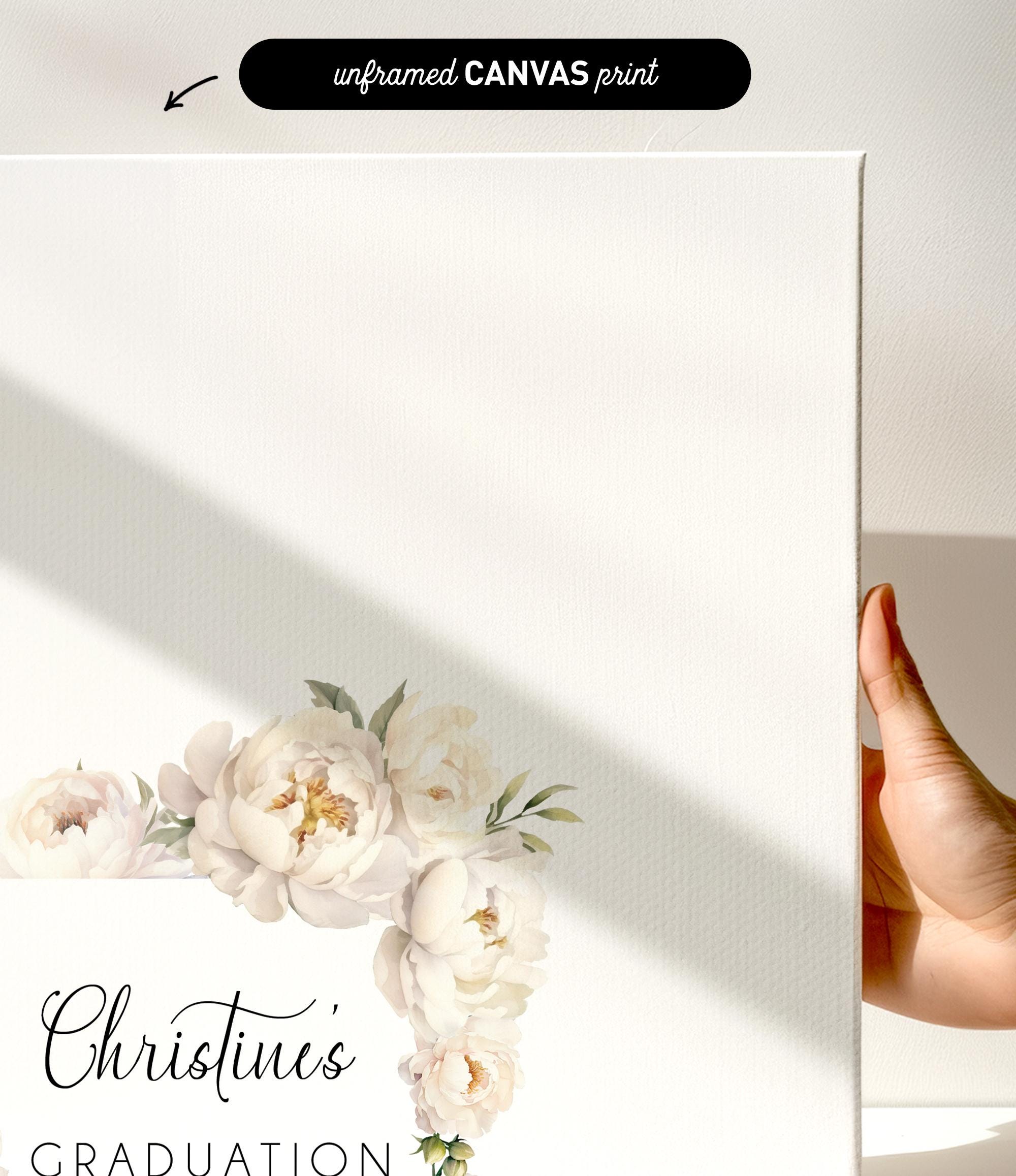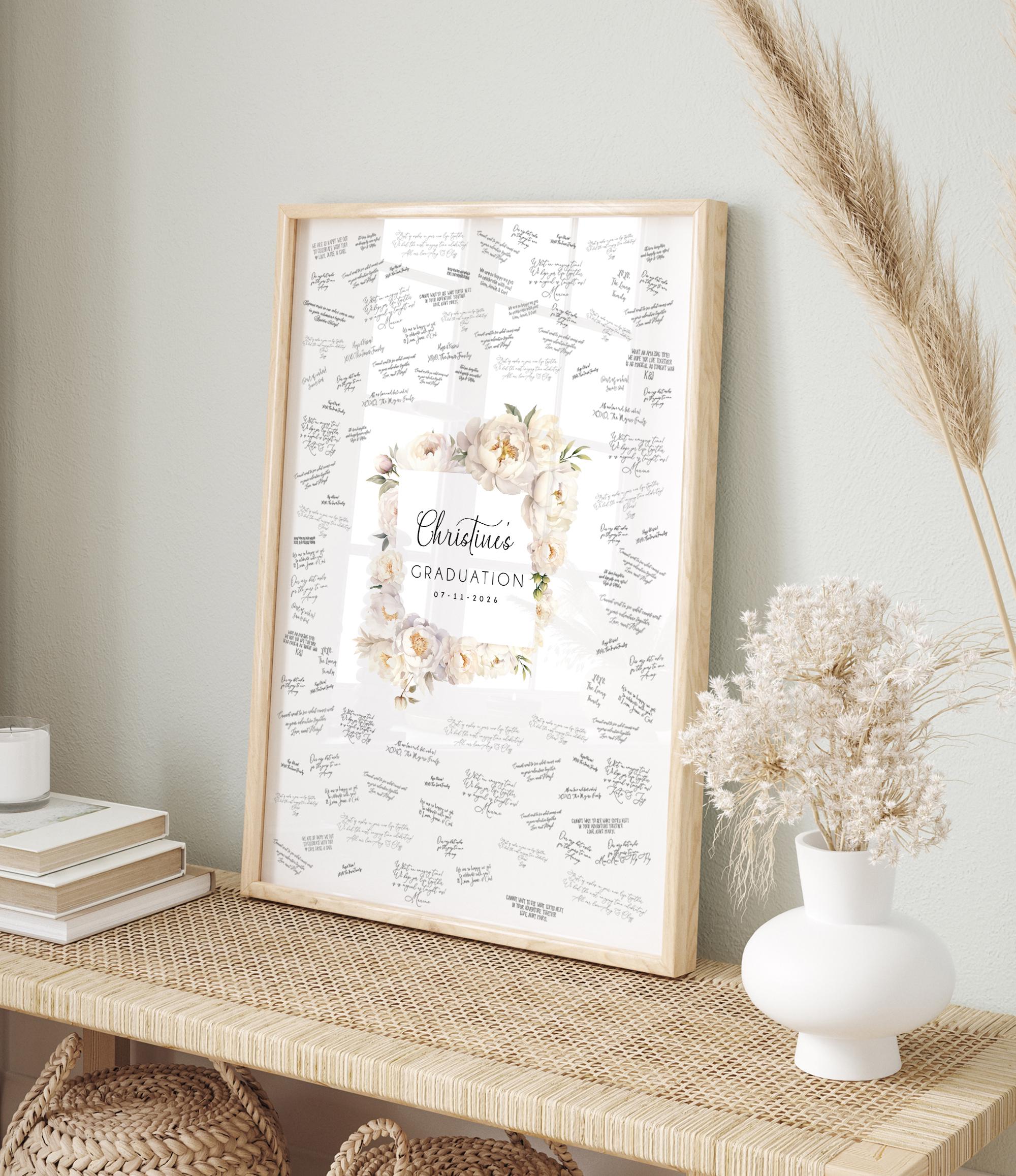Celebrate your special graduation day with a unique keepsake that doubles as a stunning piece of decor. This white peony guestbook alternative offers a charming floral frame perfect for guests to sign, creating a personalized memento that reflects your style and the joy of the occasion. Whether you choose canvas to sign, a framed guestbook, or a custom design, this piece blends elegance with meaningful memories.