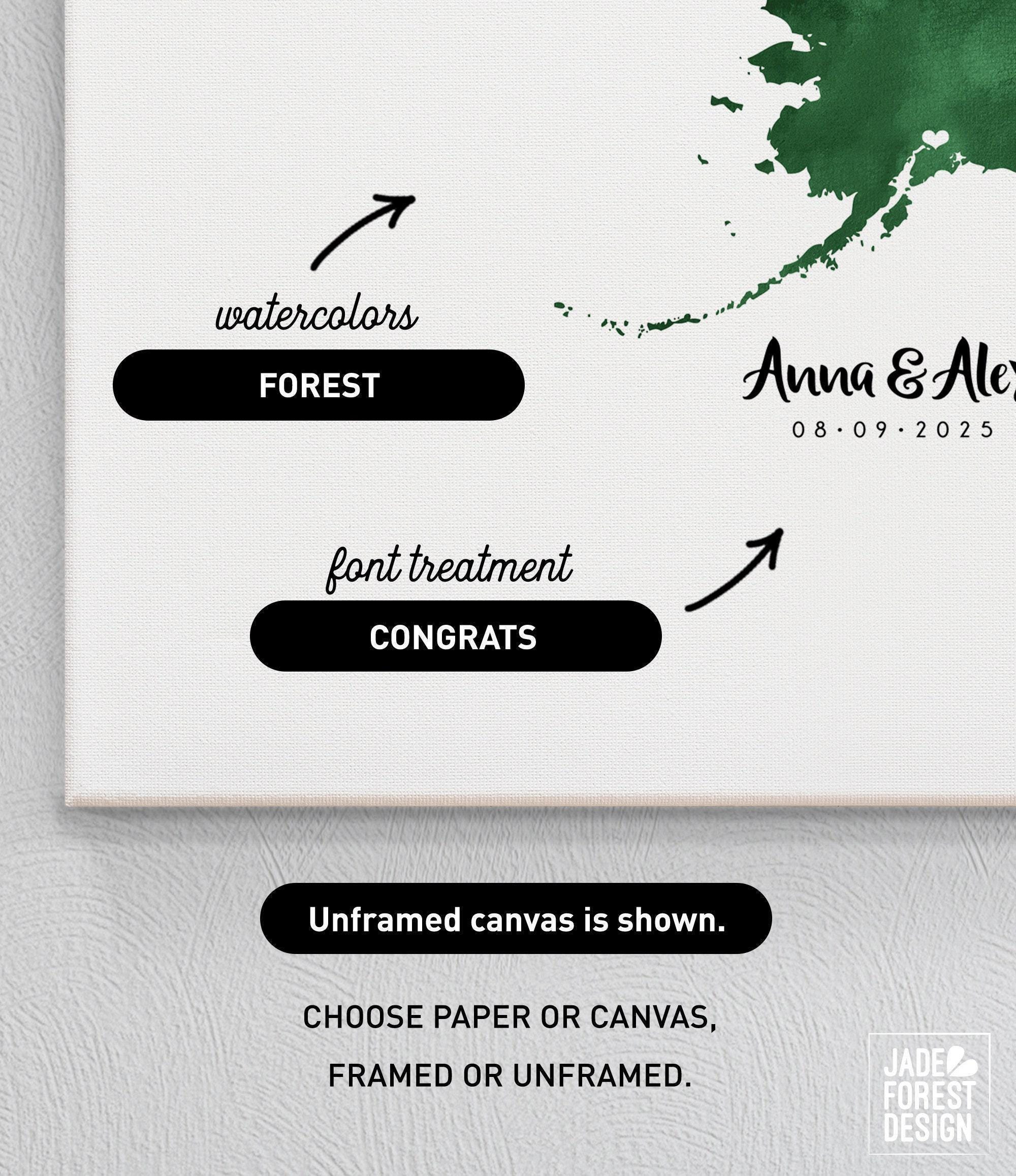 Celebrate your special day with a unique Alaska wedding art piece that captures the spirit of your celebration. This custom love map guestbook features a stunning forest green watercolor map design, beautifully highlighting your home state and city with heartfelt details. Perfect for Alaskan celebrations, it offers a meaningful alternative guestbook that guests will cherish.