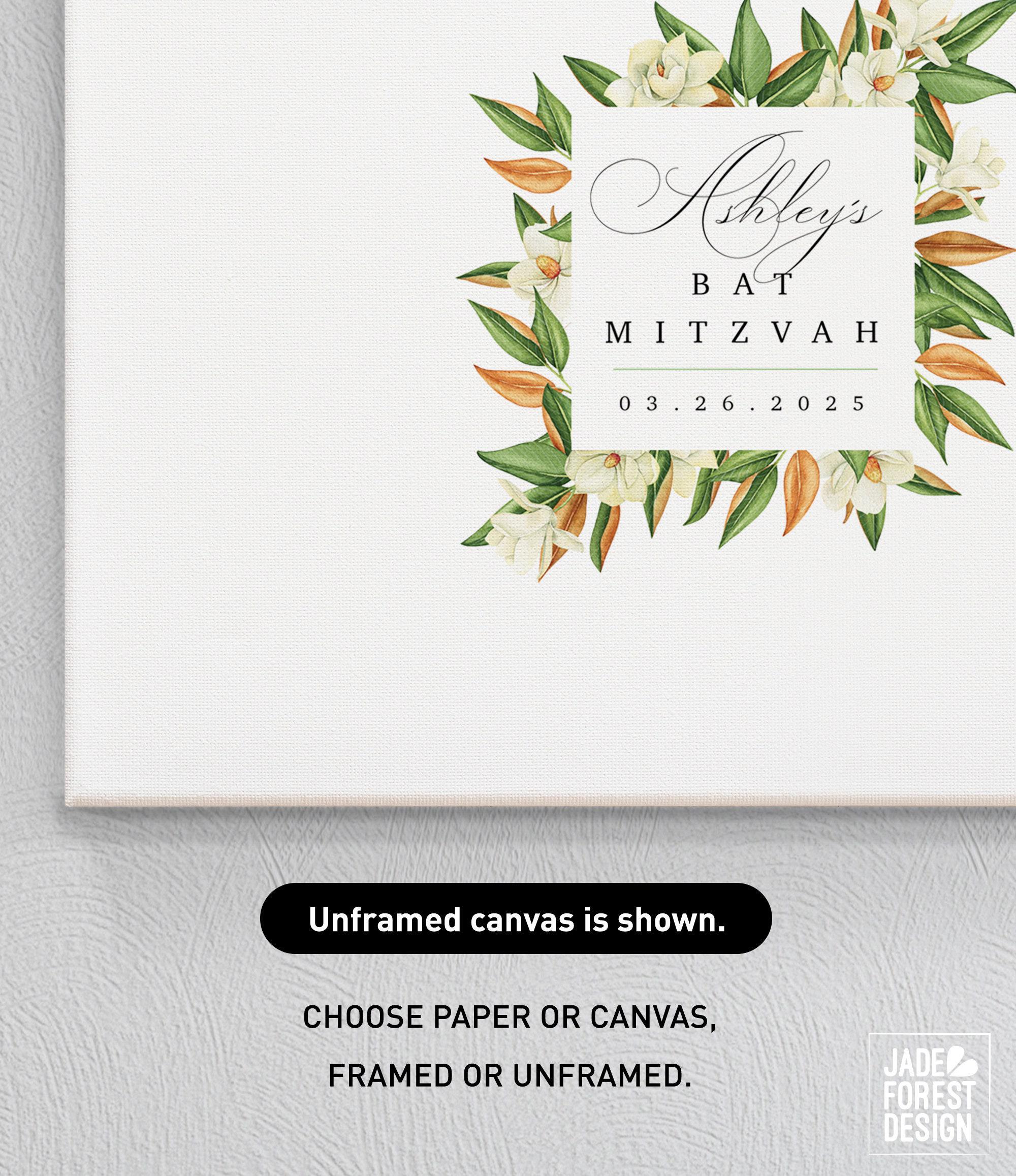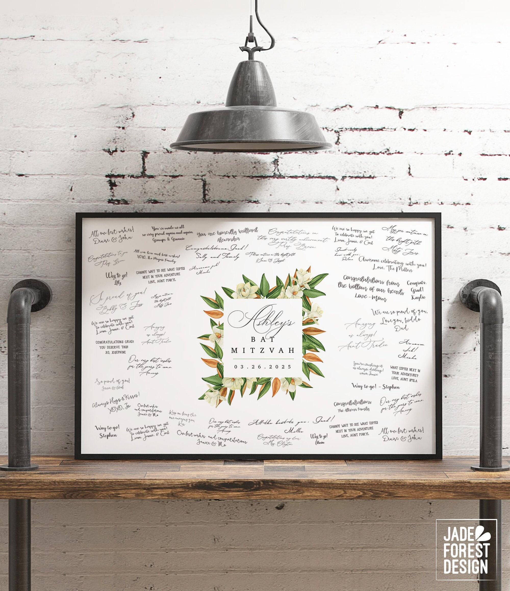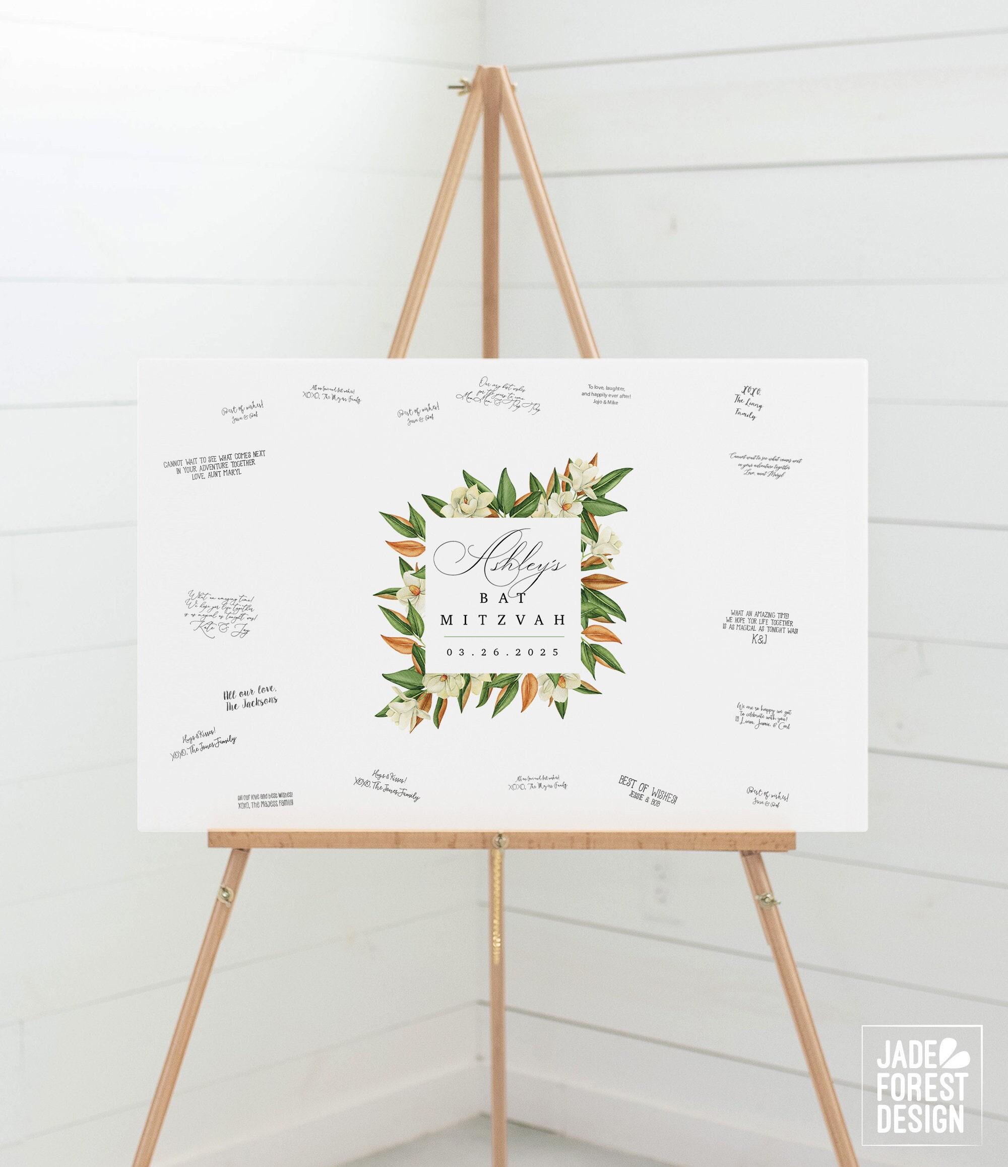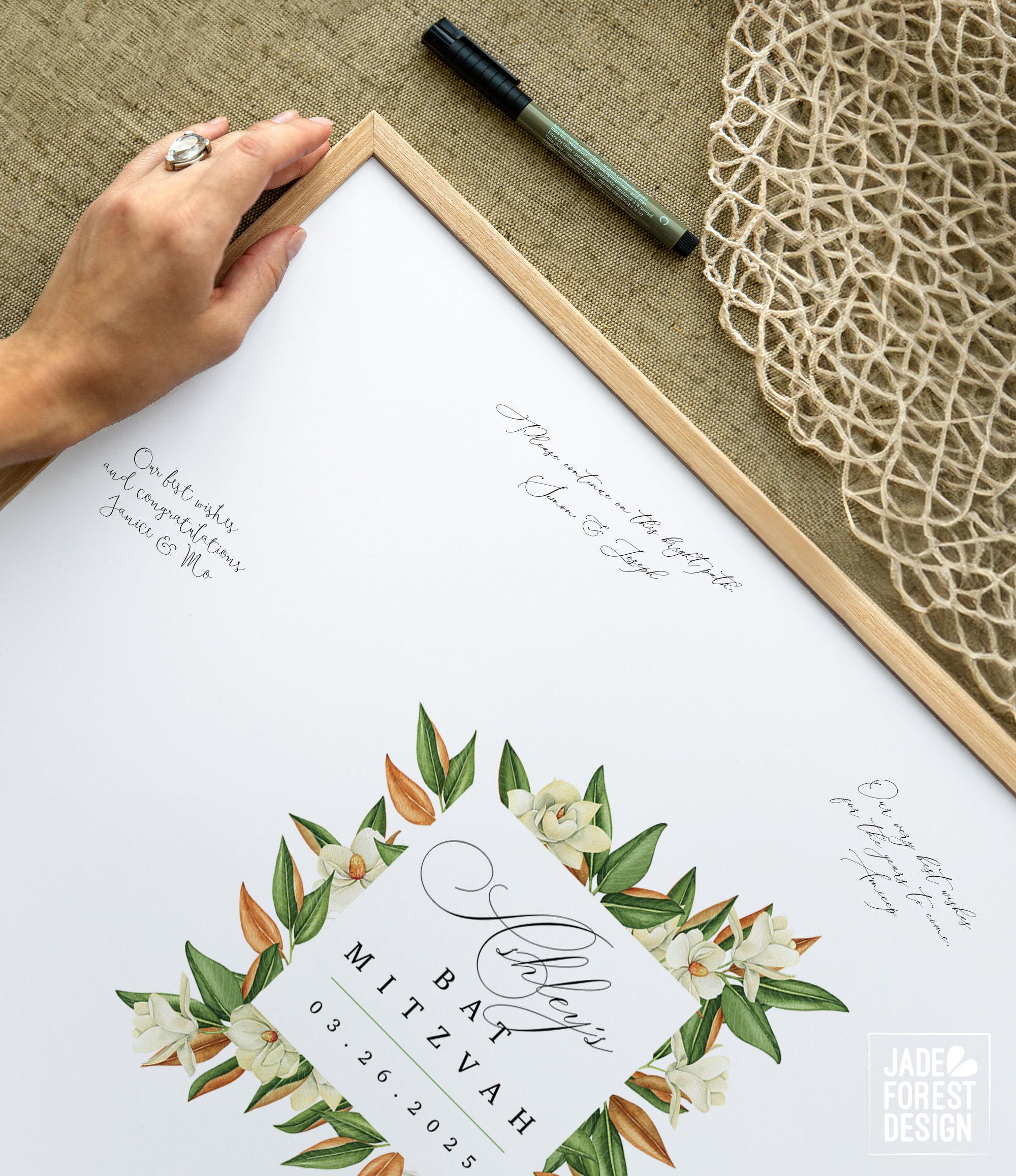 Celebrate your special occasion with a personalized guestbook that doubles as stunning floral party decor. This unique keepsake gift invites guests to leave heartfelt messages on a beautifully crafted magnolia guest book, designed as a canvas to sign and cherish for years to come. Perfect for bat mitzvahs and other milestone events, this signature sign board adds elegance and meaning to your celebration.