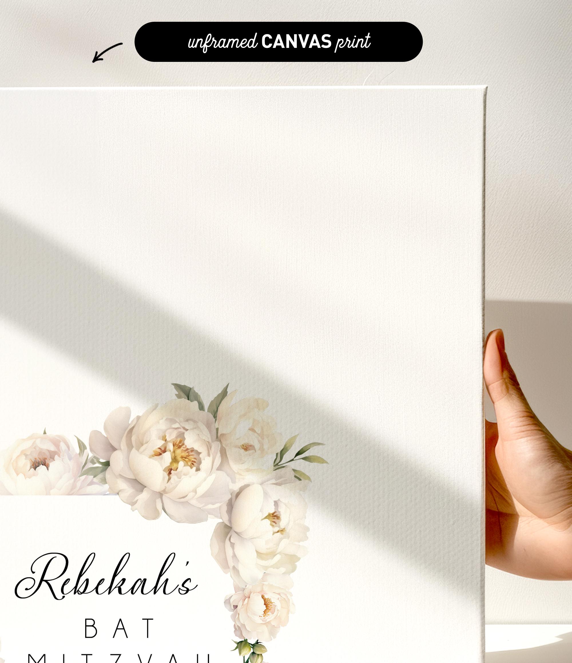 Celebrate your special occasion with a custom floral guest book that doubles as an elegant sign in board and a unique Jewish gift. Inspired by the timeless beauty of white peonies, this canvas guest book features a delicate floral frame that beautifully surrounds your personalized event details. Perfect for bat mitzvahs and other meaningful Jewish celebrations, it transforms from a warm welcome at your event into a cherished keepsake to display for years.