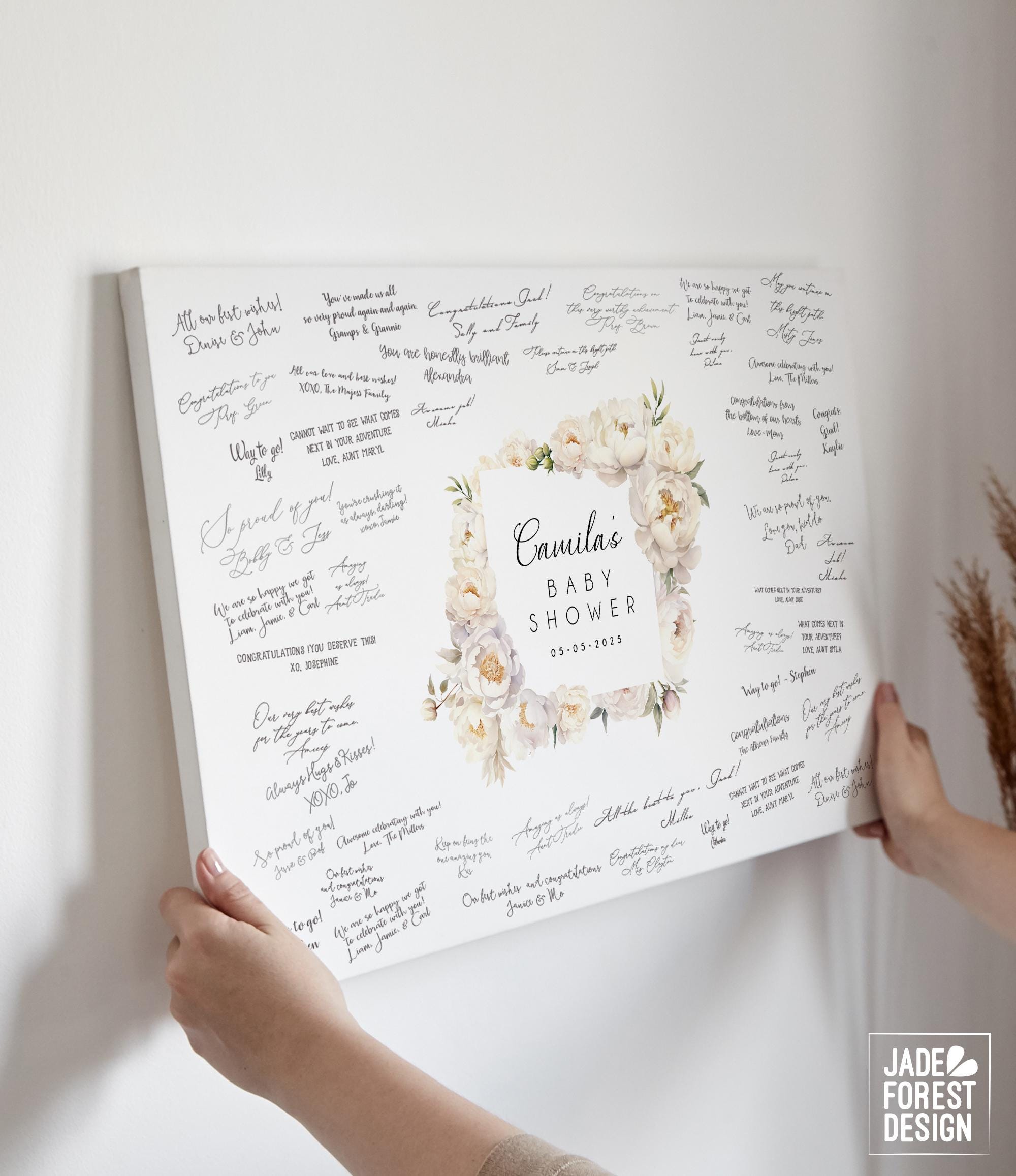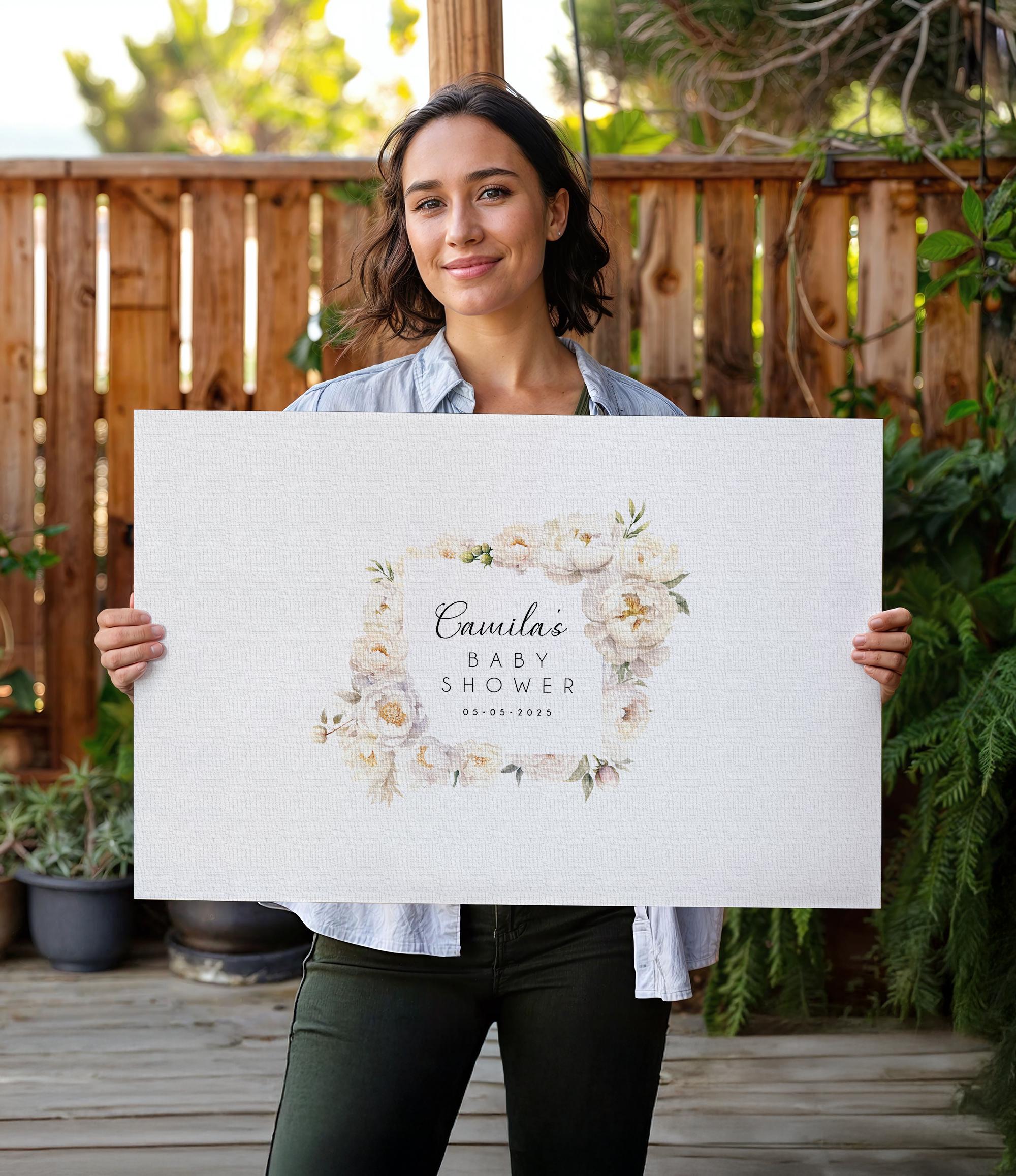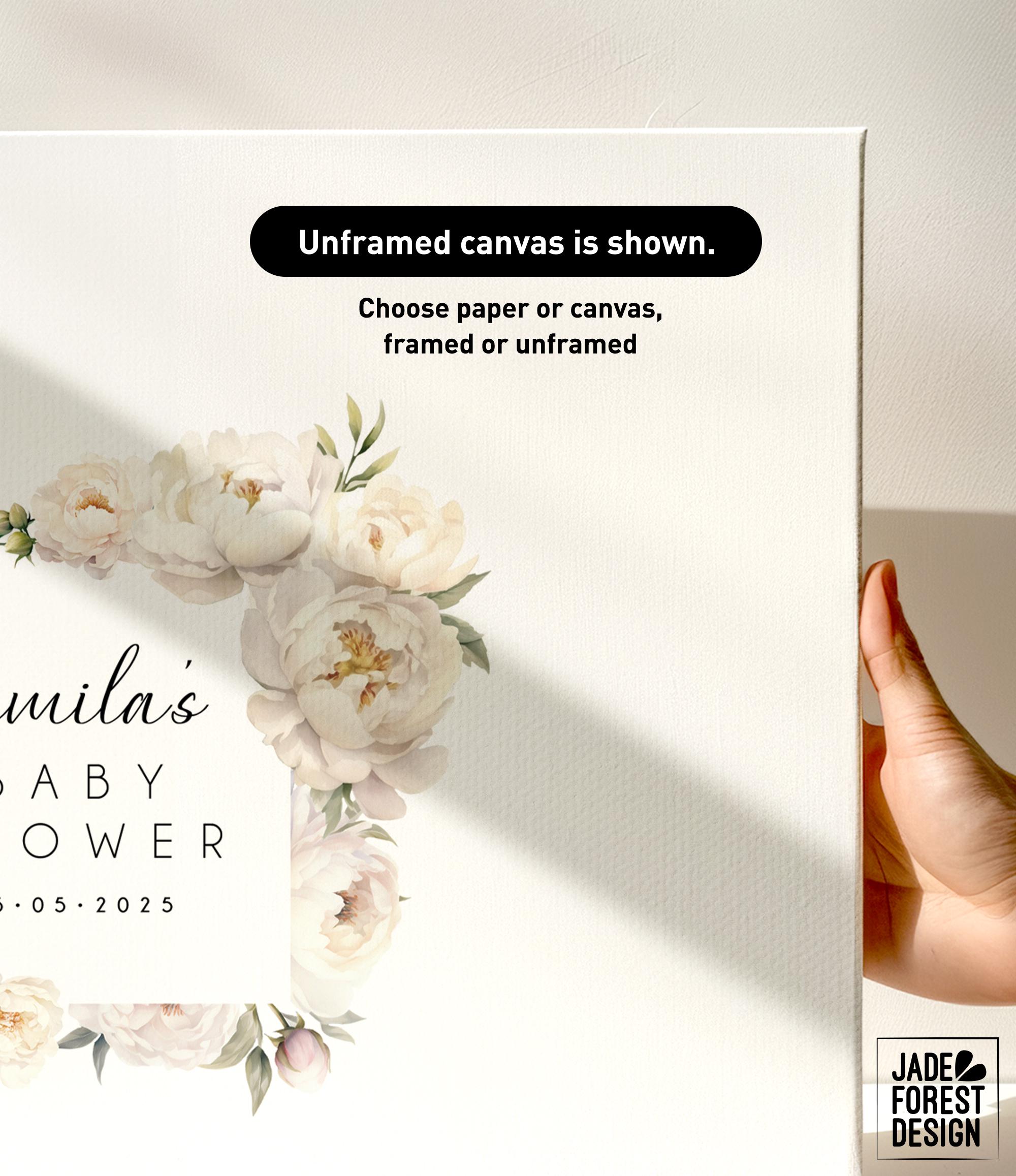 Celebrate your special event with a stunning white peony canvas that beautifully frames your personalized name, event, and date. This shower sign in piece transforms from a warm welcome at your celebration into a cherished signature keepsake, perfect for displaying in your home. Crafted with care and designed as a custom baby sign, it blends elegance and function seamlessly.