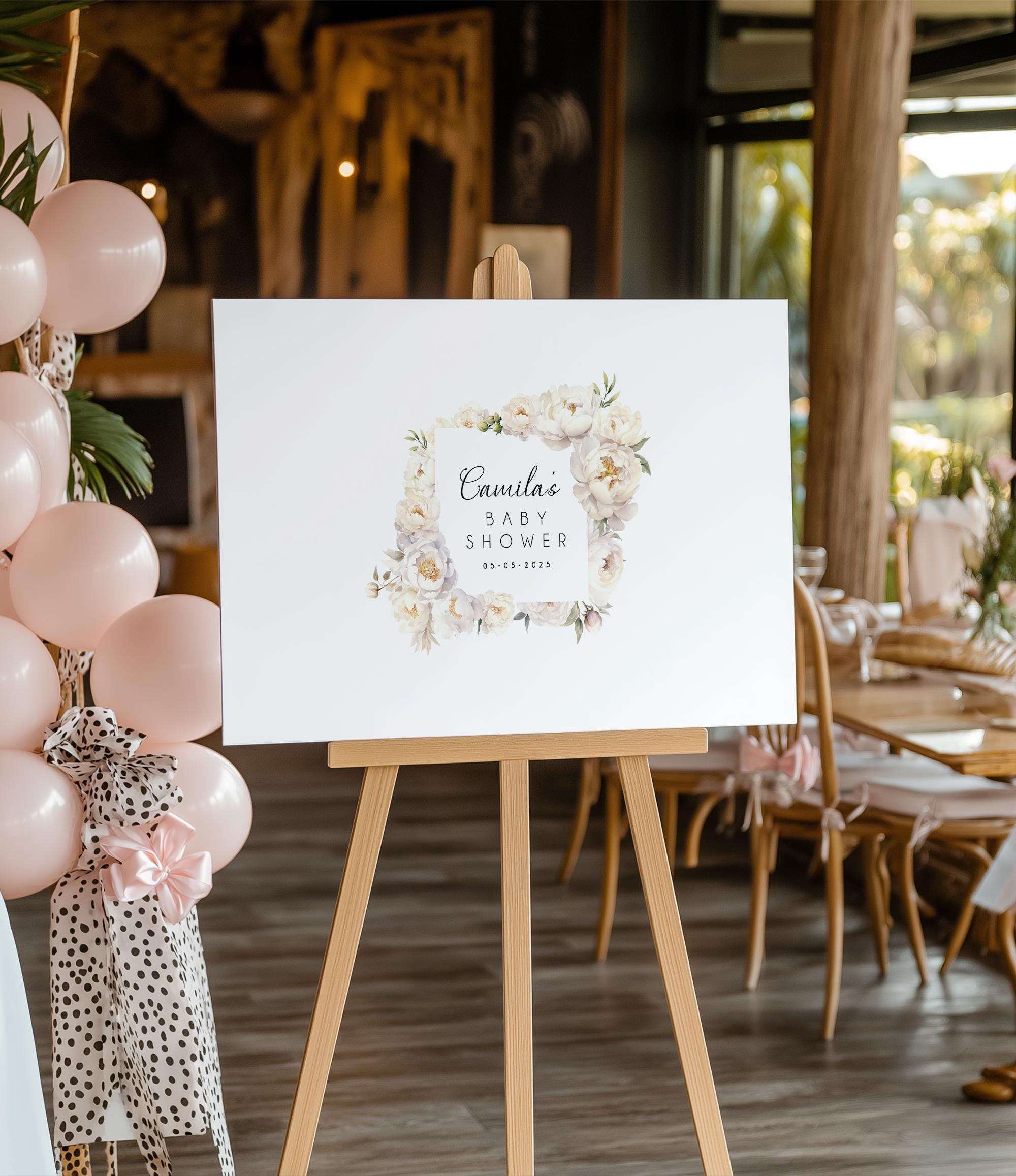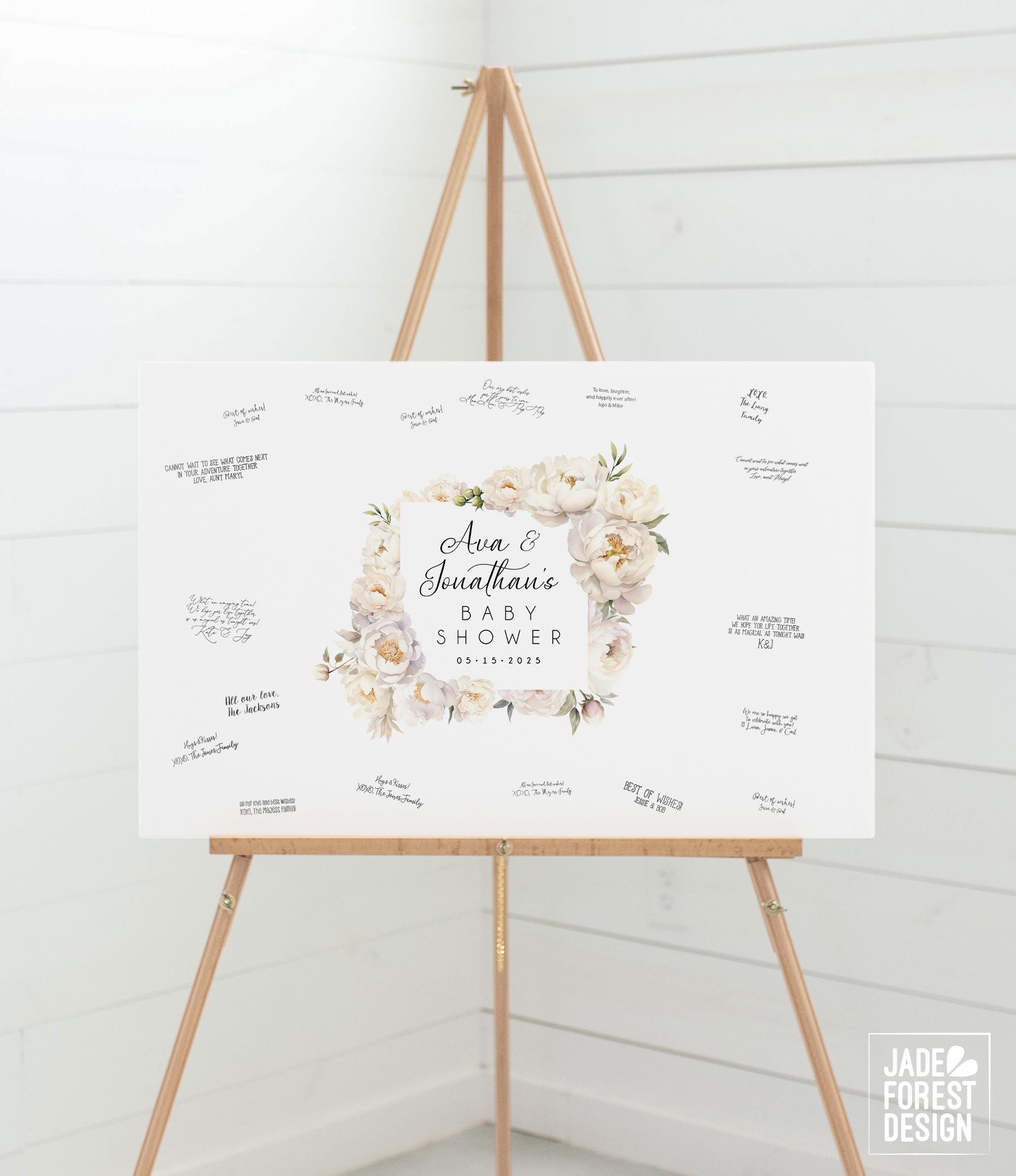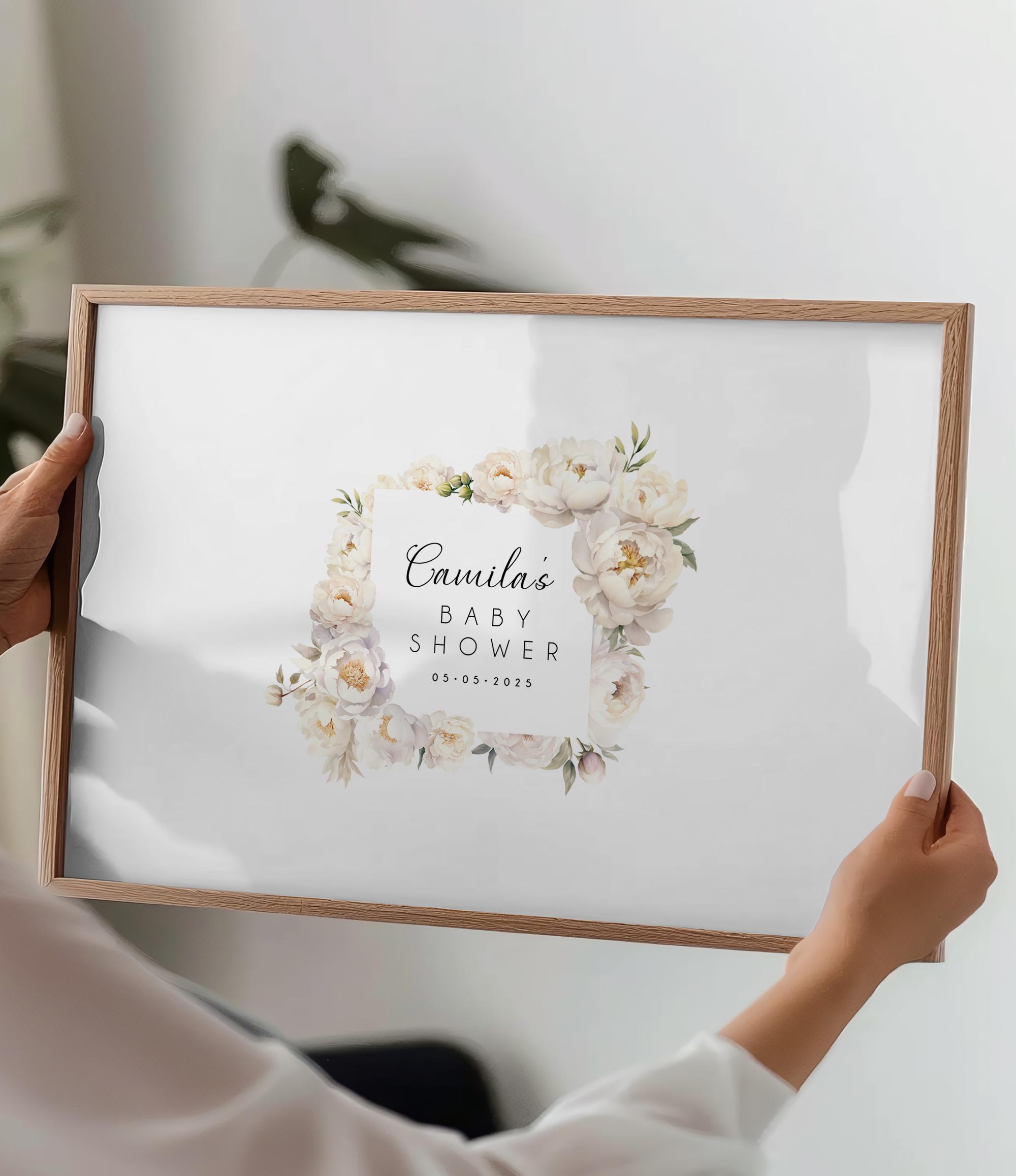Celebrate your special event with a stunning white peony canvas that beautifully frames your personalized name, event, and date. This shower sign in piece transforms from a warm welcome at your celebration into a cherished signature keepsake, perfect for displaying in your home. Crafted with care and designed as a custom baby sign, it blends elegance and function seamlessly.