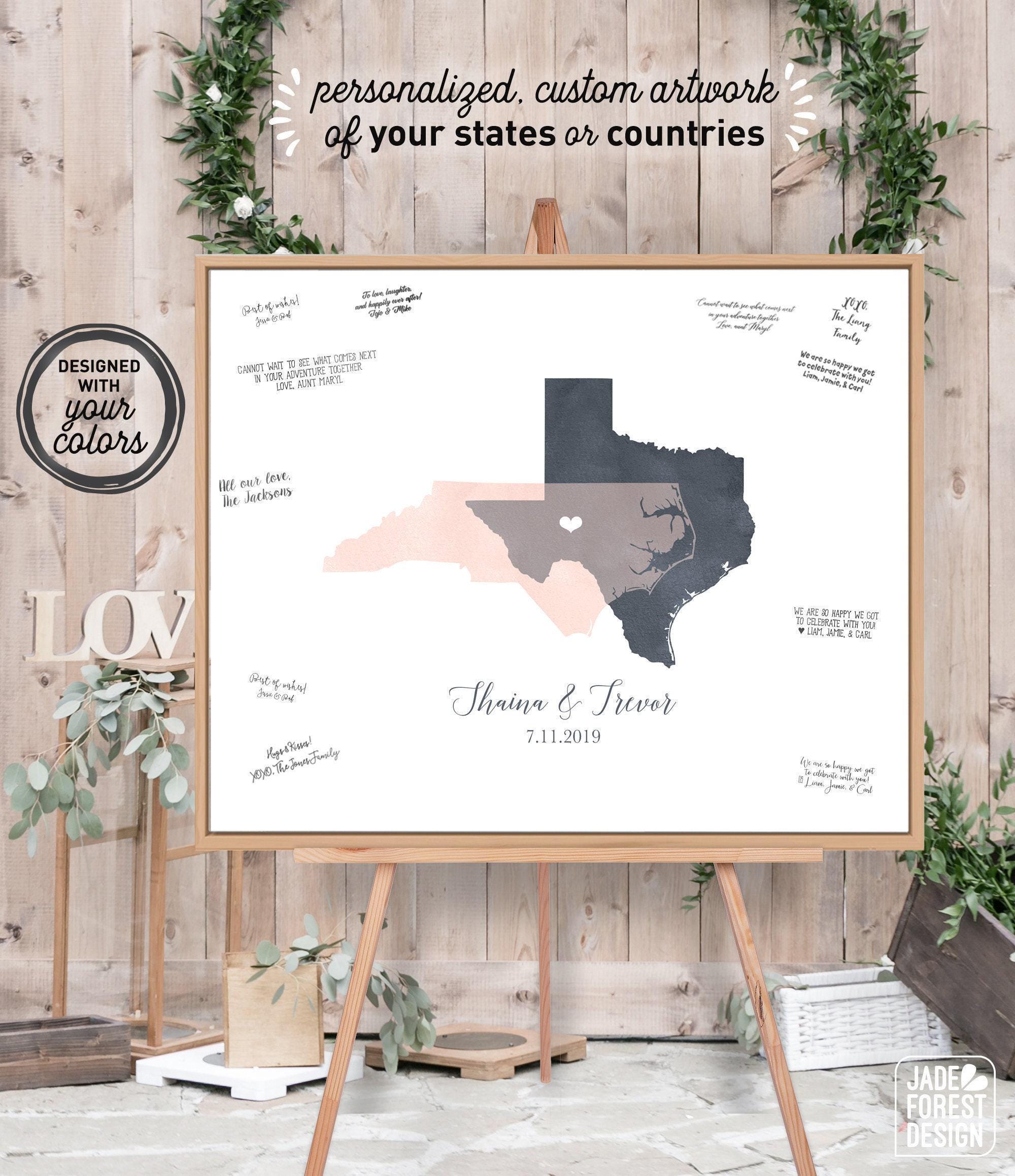 Celebrate your unique love story with this beautifully crafted wedding guest book, a perfect alternative art piece that doubles as a personalized map art keepsake. Featuring a delicate watercolor states design, this canvas guestbook invites your guests to leave heartfelt messages around the overlapping home states marked by a charming heart. This XL framed decor not only captures your journey together but also becomes a treasured heirloom for years to come.