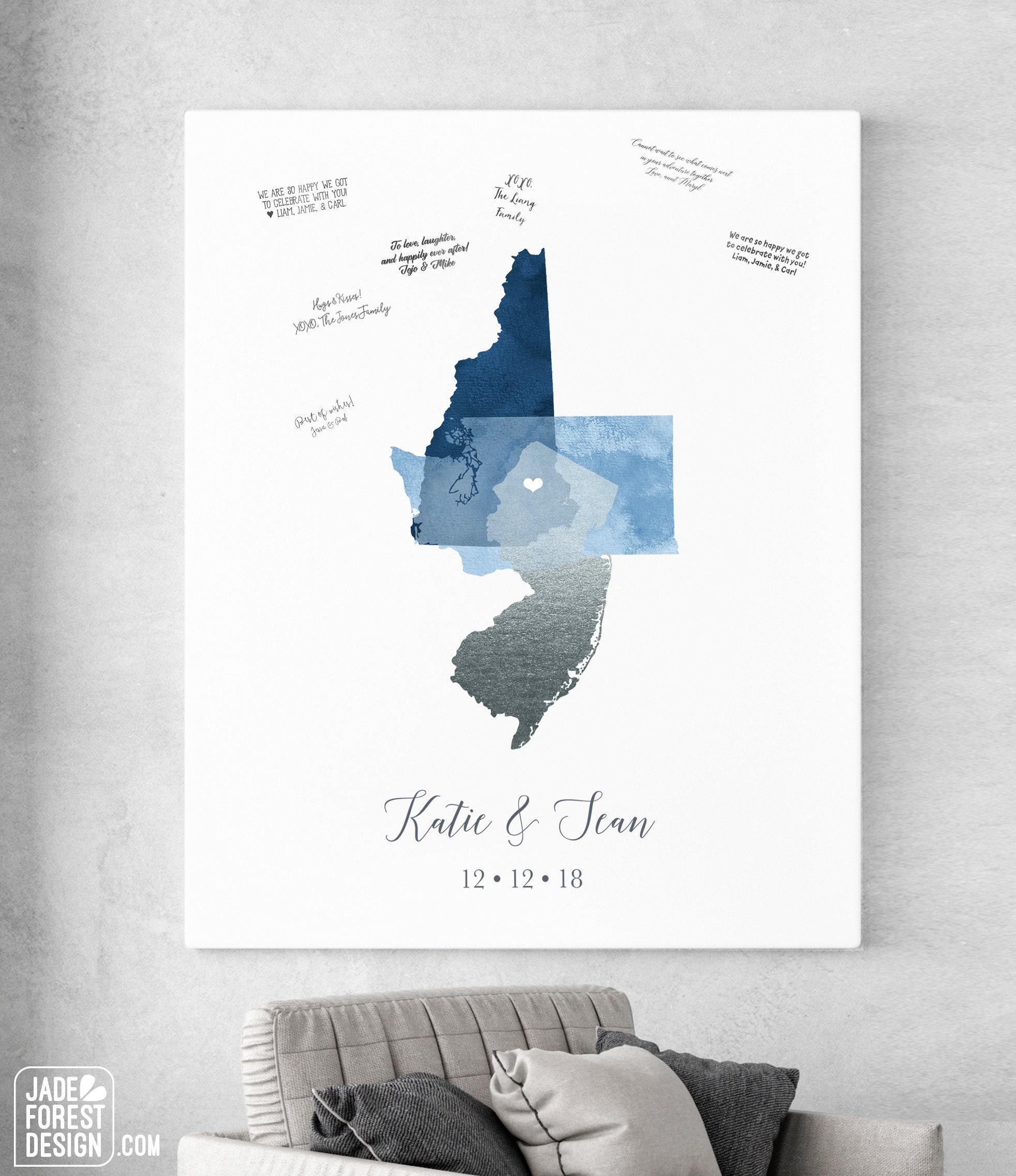 Our CUSTOM LOVE MAP guest book will tell your unique love story. It features your choice of states or countries, done in a beautiful watercolor effect, overlapping and marked with a heart over the intersection of the three cities. The artwork will be completely customized with your locations and colors.