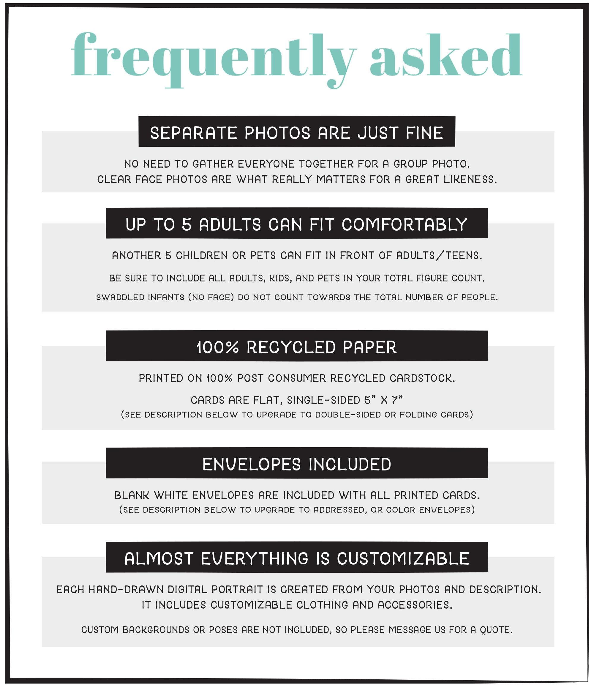 β PHOTOS β€ There's no need for everyone to be together in the photo for this design, separate photos for each person are just fine. Quality face photos are what matters for a good likeness.