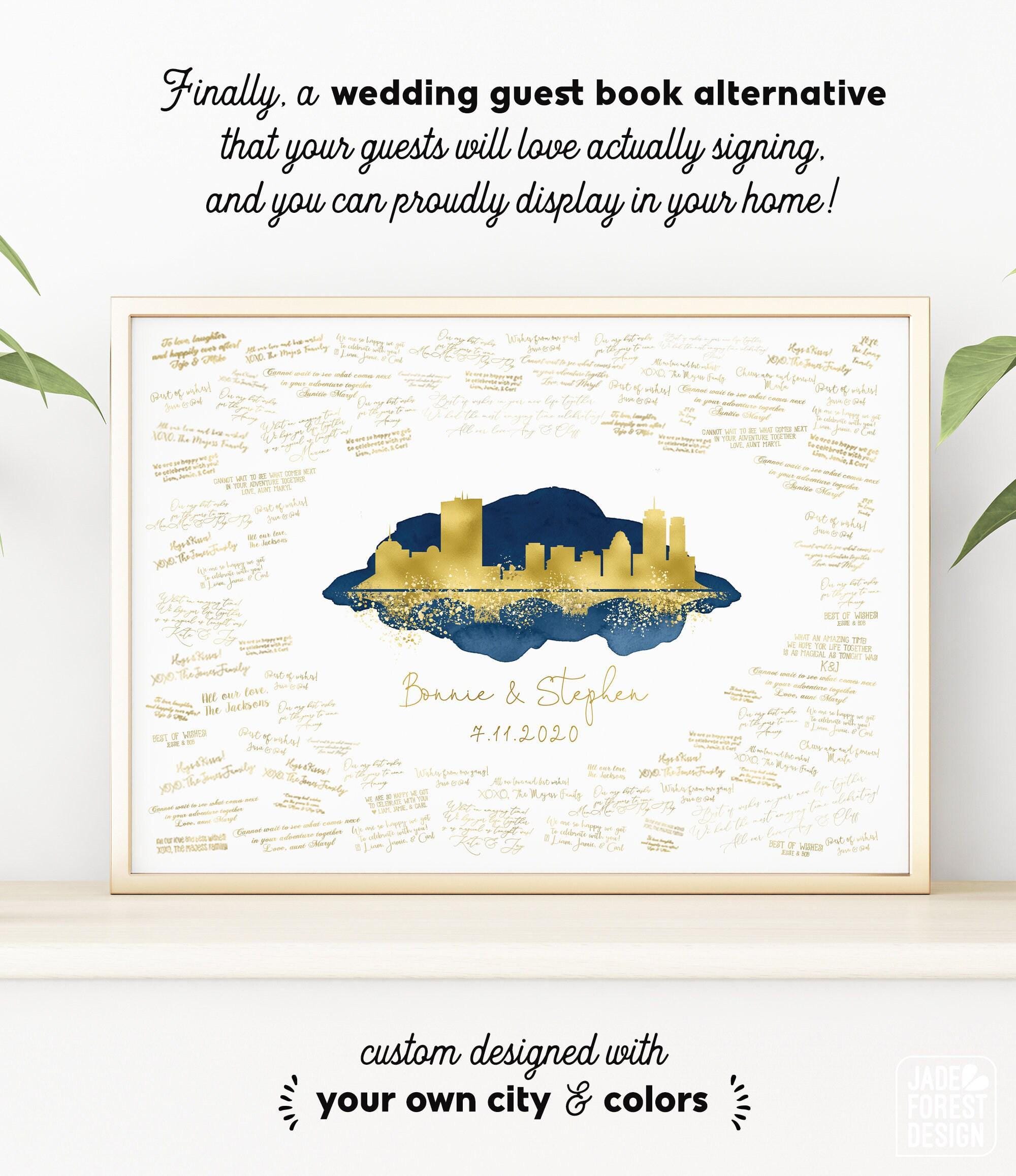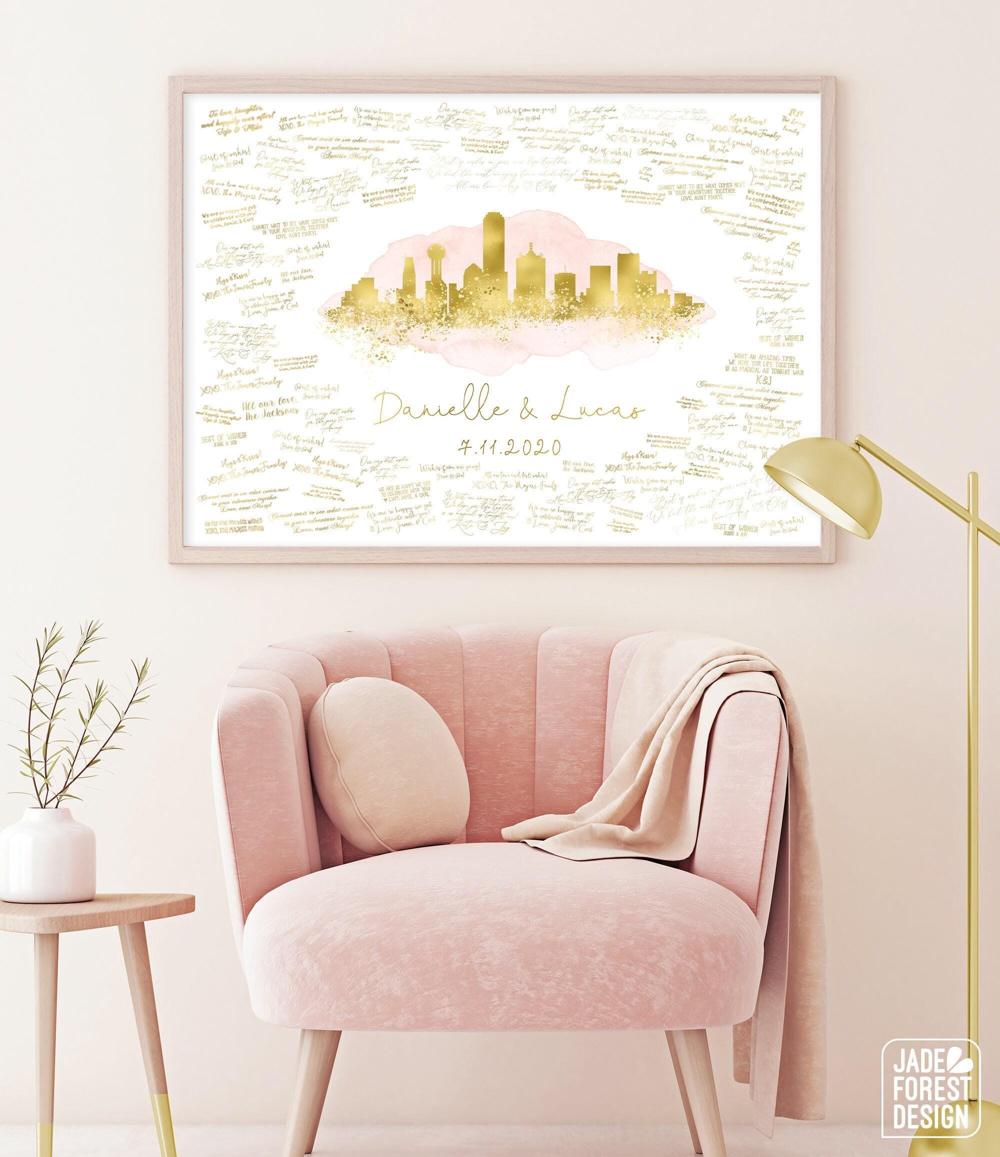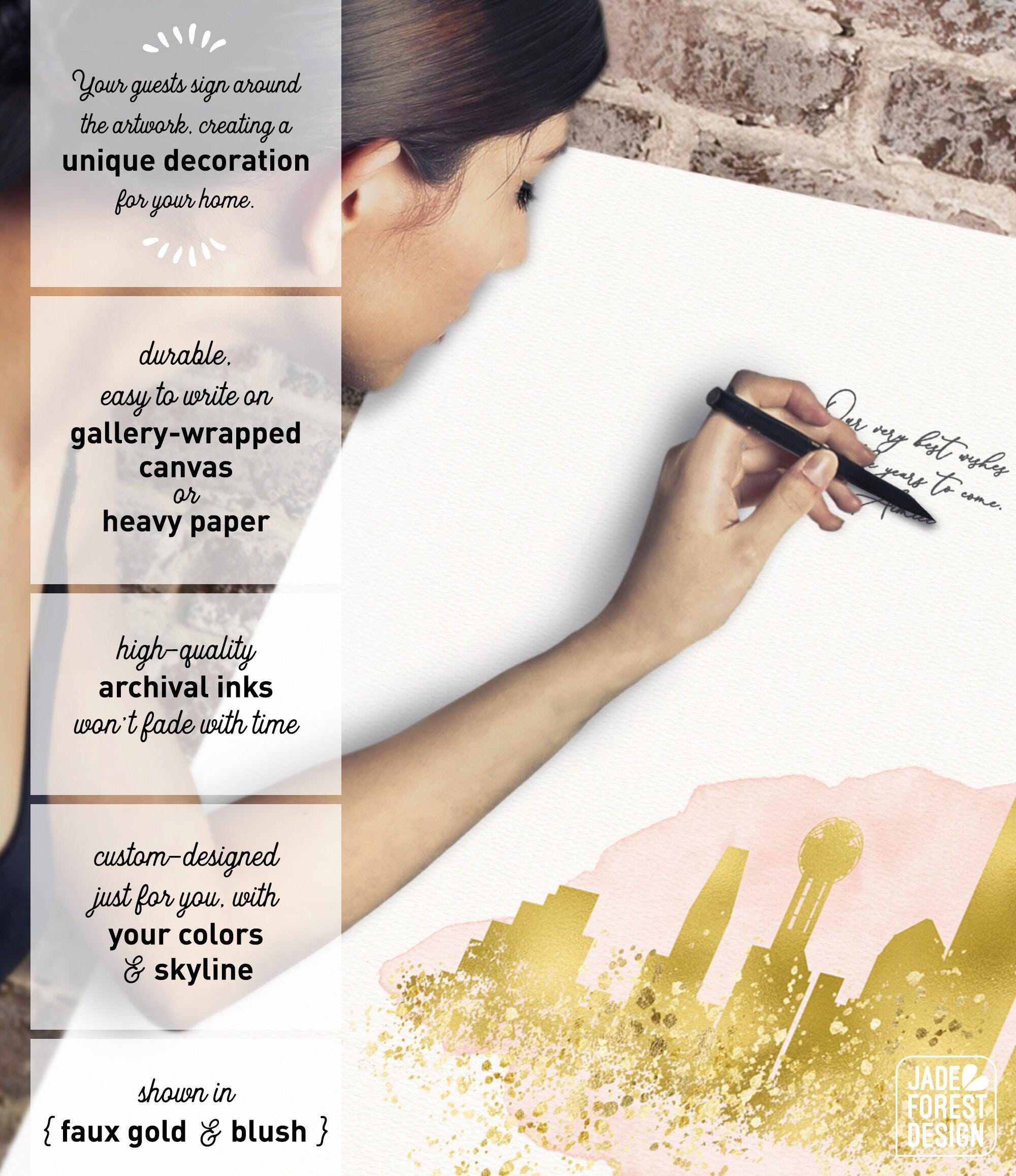 Celebrate your special day with a beautifully personalized guest book that captures the essence of your city in stunning blush watercolor art and faux gold metallic accents. This Dallas skyline art creates a romantic wedding keepsake that your guests will cherish as they sign around the custom skyline print. Designed with archival ink print techniques, this guest book blends elegance and sentimentality for a truly unique memento.