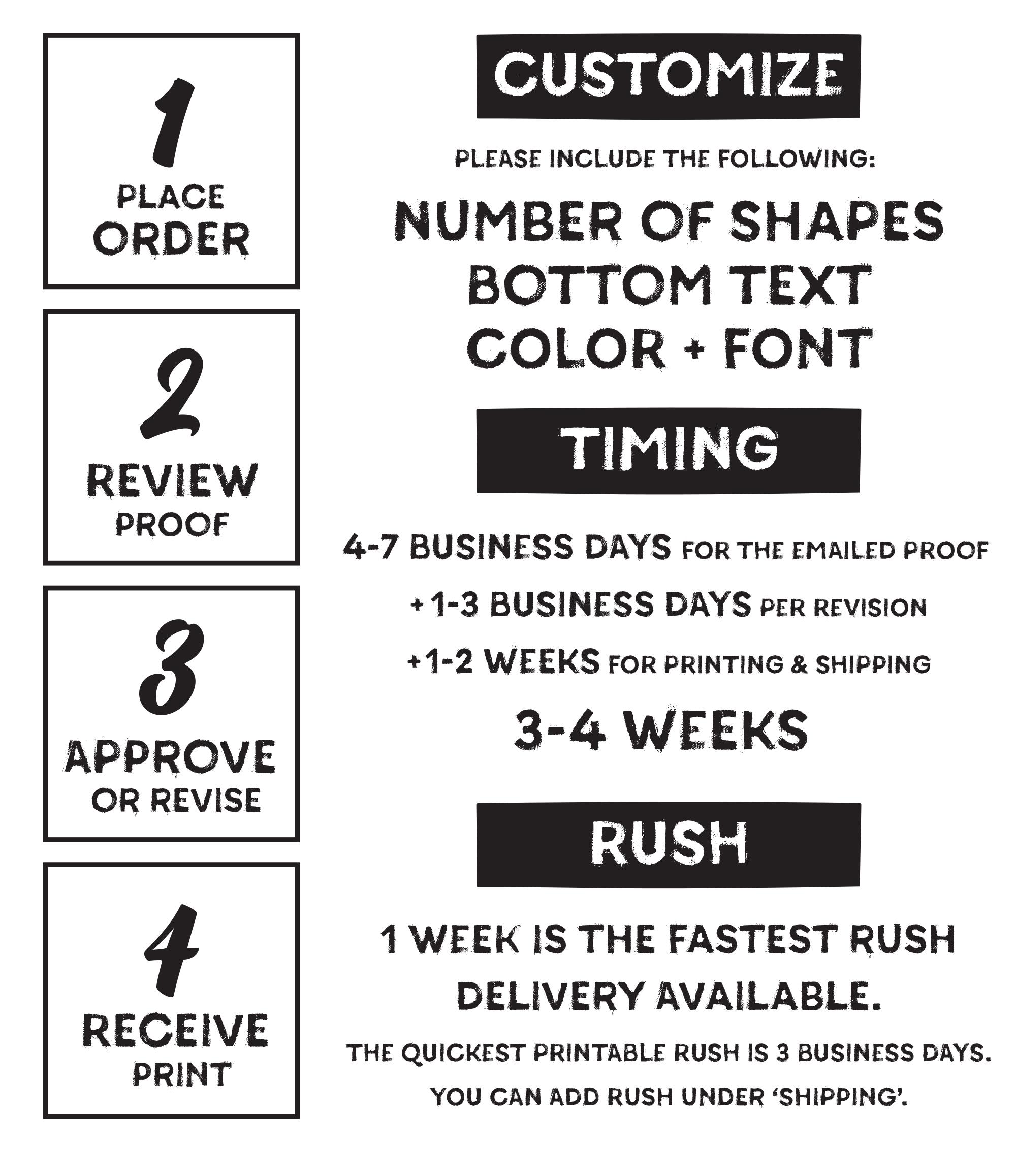 Most items in our shop have the option to choose a "printable", or "email file only", if you prefer to print locally. While we highly recommend the professional printing services offered via the shop, choosing this option means you'll receive personalized, high-resolution, printer-ready (printable) files via email. Please see "CURRENT TIMING" above for how soon to expect the emailed designs.