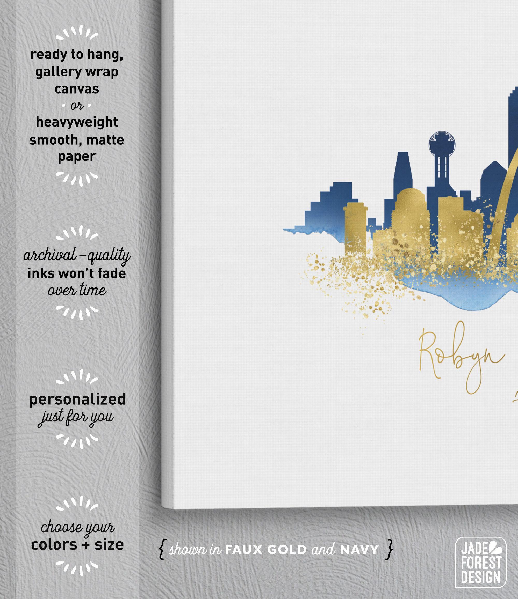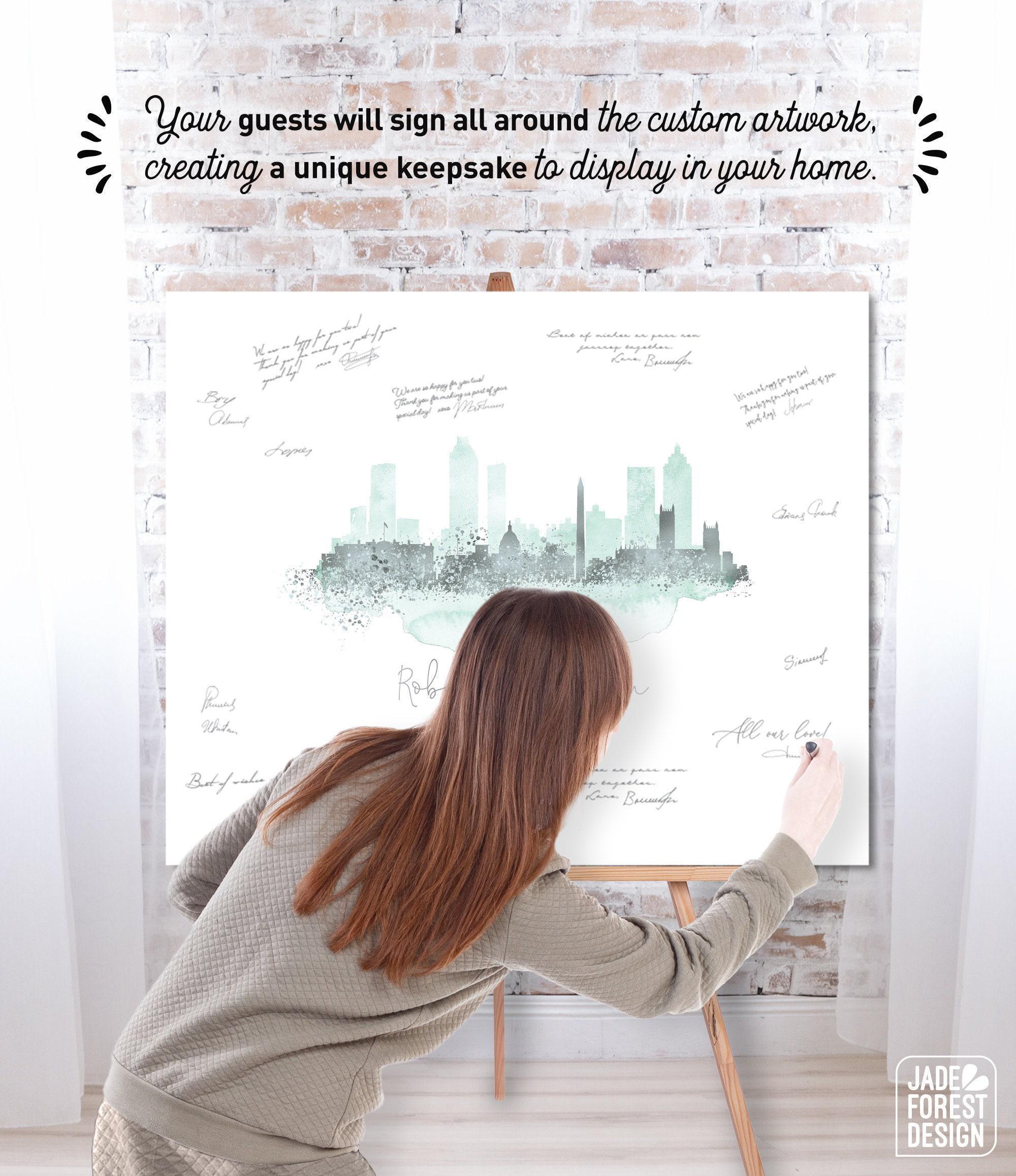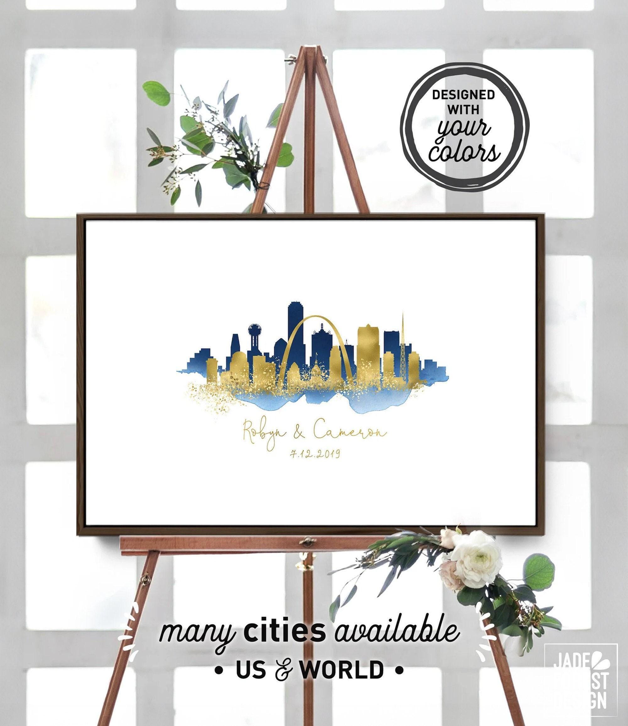 Celebrate your love story with a unique keepsake that beautifully blends art and memory. This custom skyline guest book features your choice of two city skylines—one rendered in elegant watercolor and the other in stunning faux metallic—perfect for couples seeking a personalized wedding guest book. Crafted with archival quality ink on canvas and framed in natural wood, it transforms guest signatures into a treasured piece of navy and gold art.
