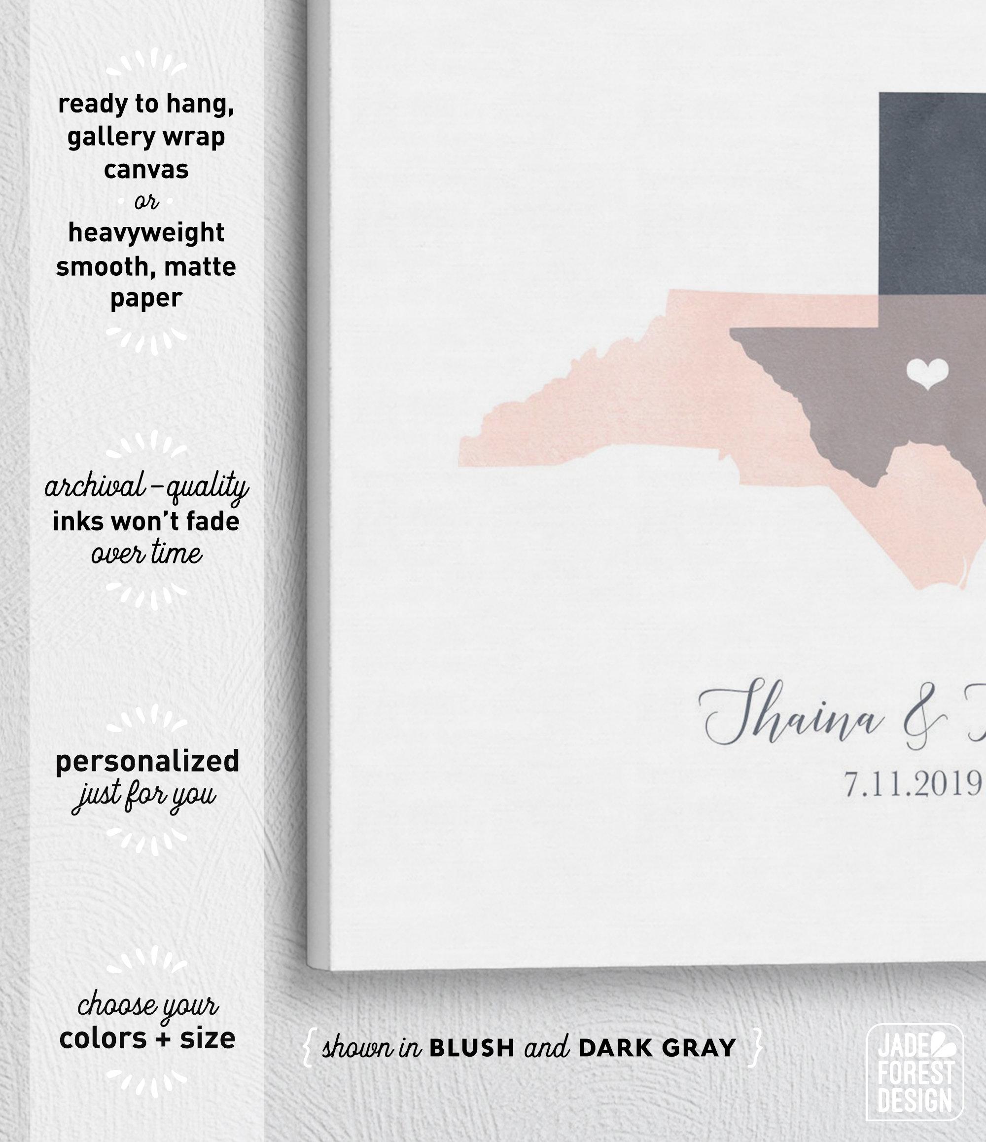 Celebrate your unique love story with a beautifully crafted guestbook that captures the essence of your journey. This custom love map guestbook features overlapping states rendered in a delicate watercolor effect, highlighted by a heart marking the intersection of your cities. Designed as a personalized canvas keepsake, it invites your guests to sign around the artwork, creating a timeless memento filled with heartfelt messages.