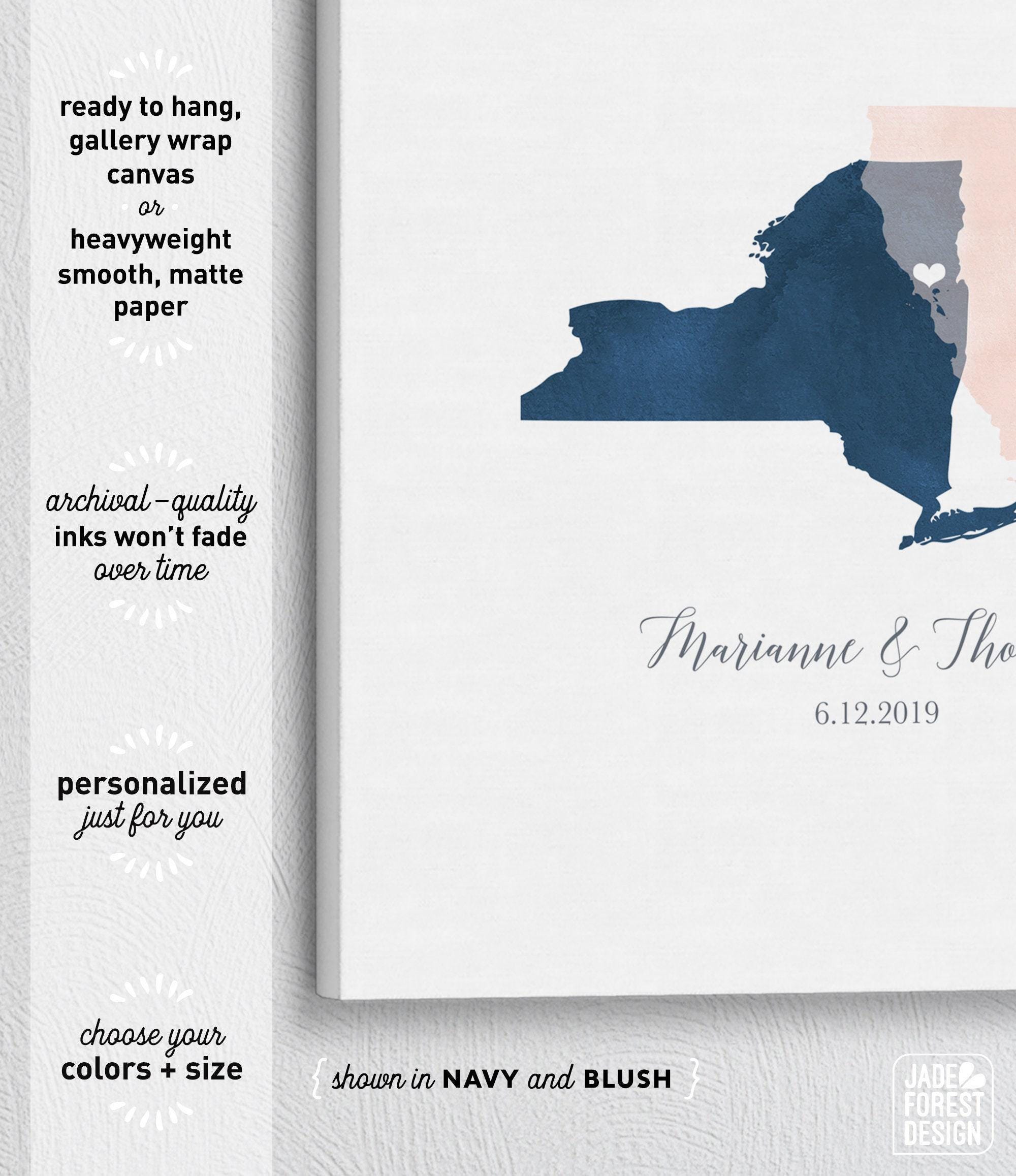 - ✅ Custom watercolor map featuring up to 2 states or countries with overlapping design and heart marking your cities