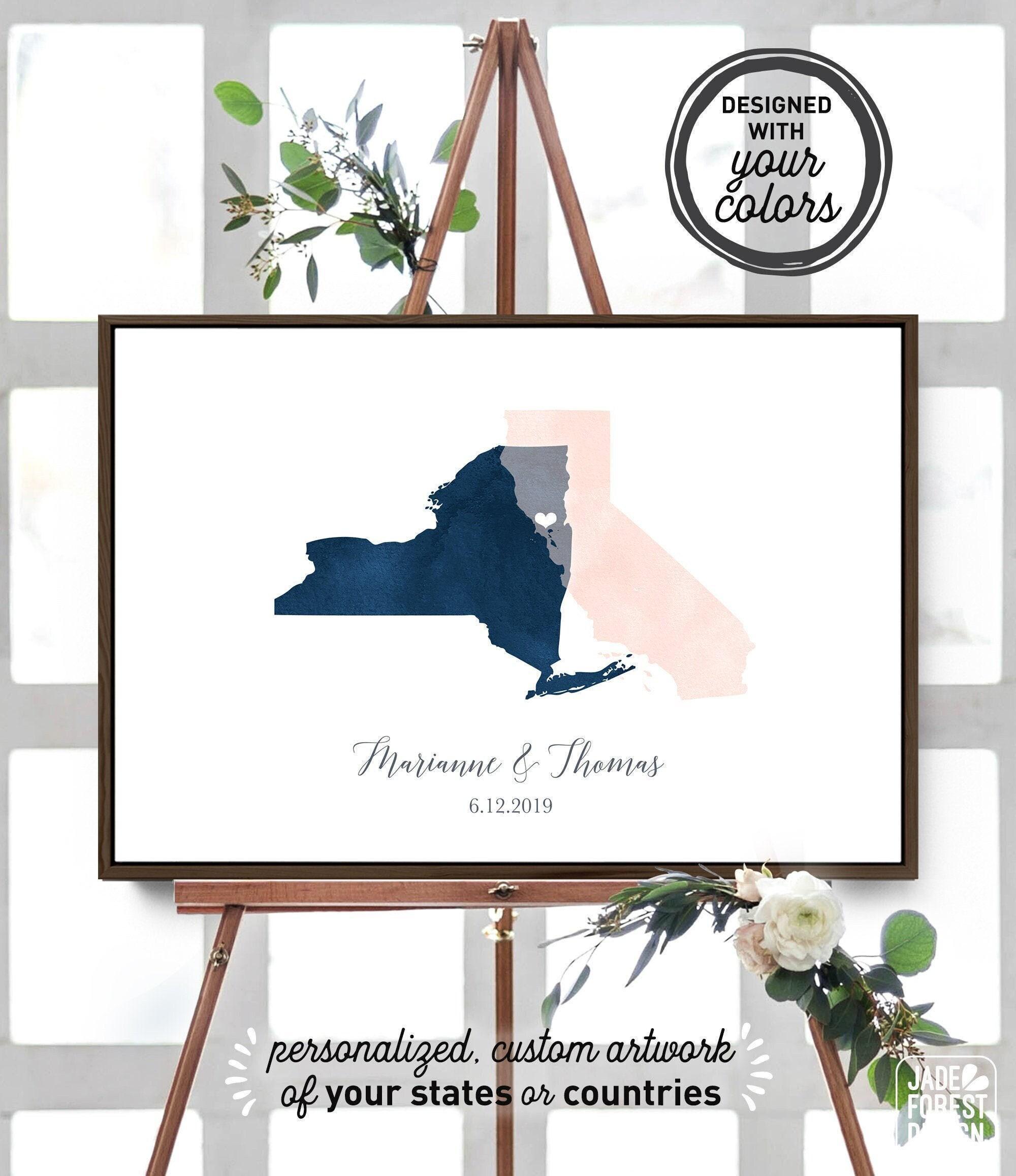 Celebrate your unique love story with a custom love map guest book that beautifully blends art and memory. This unique wedding gift features overlapping home states or countries in a delicate navy blush watercolor, marked with a heart where your cities meet. Guests sign around this stunning keepsake, creating a heartfelt memento to cherish for years.