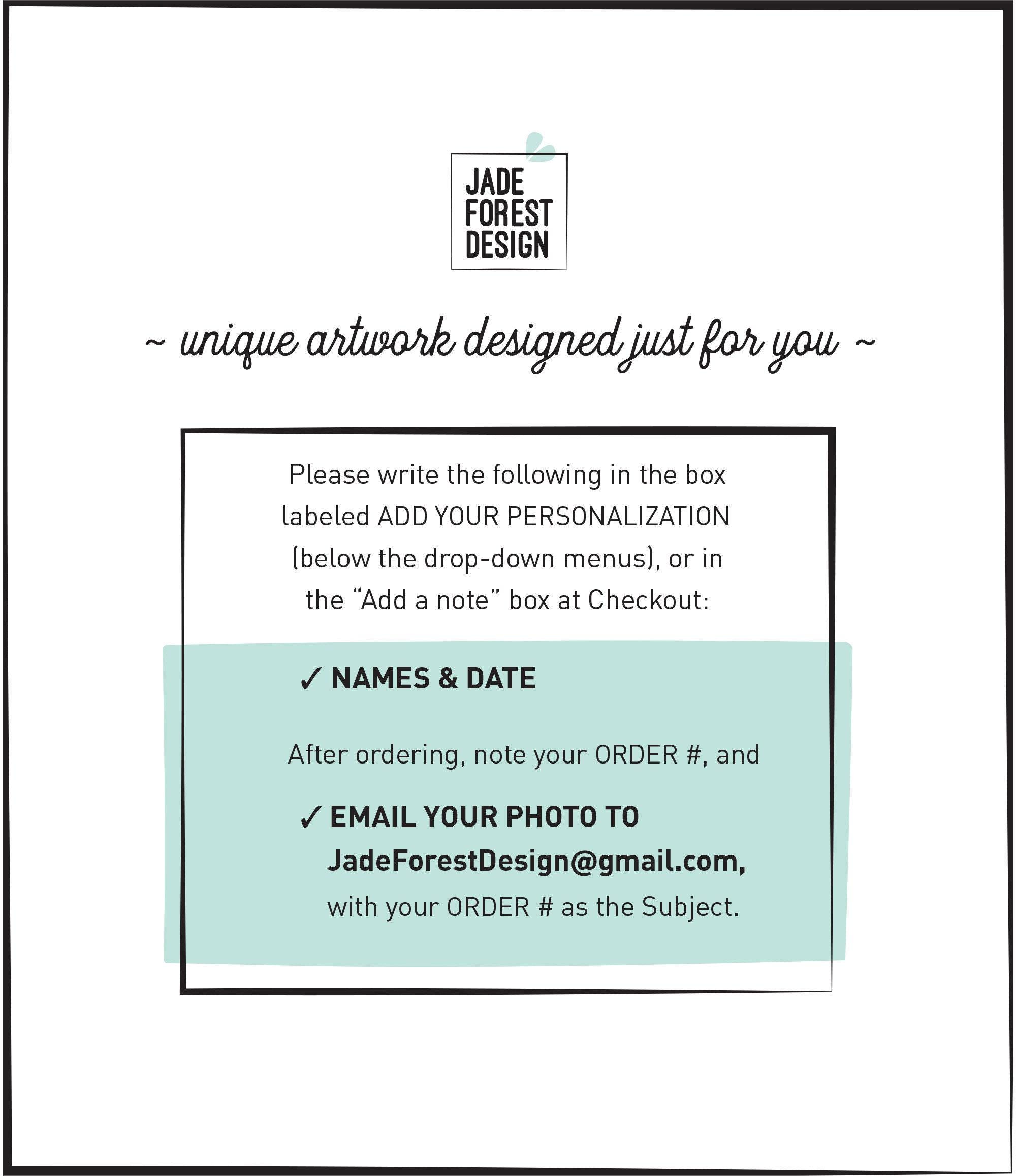 ✓ Email your photo to JadeForestDesign [!at] gmail.com, with you Order # as the Subject.