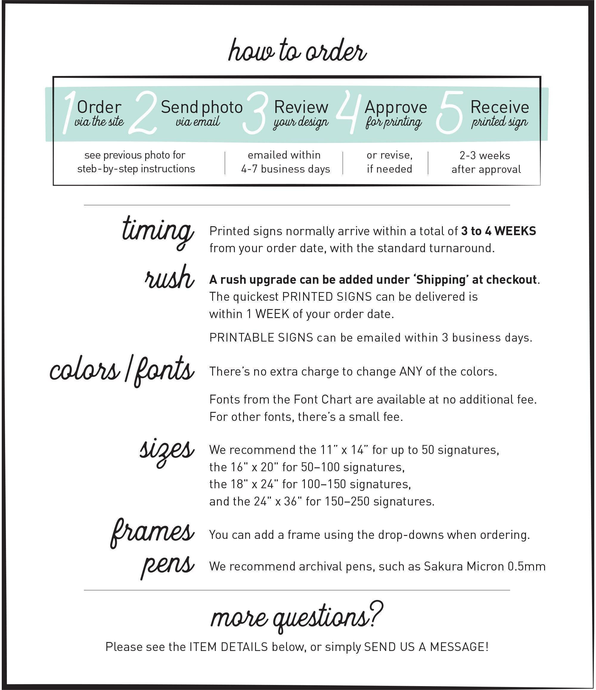 I recommend providing your guests with ARCHIVAL-quality pens (such as Sakura/Micron). You should be able to find those at a craft store such as Michael’s, or on Amazon. I do not recommend Sharpies, or any other non-archival pens, as they may fade over time.