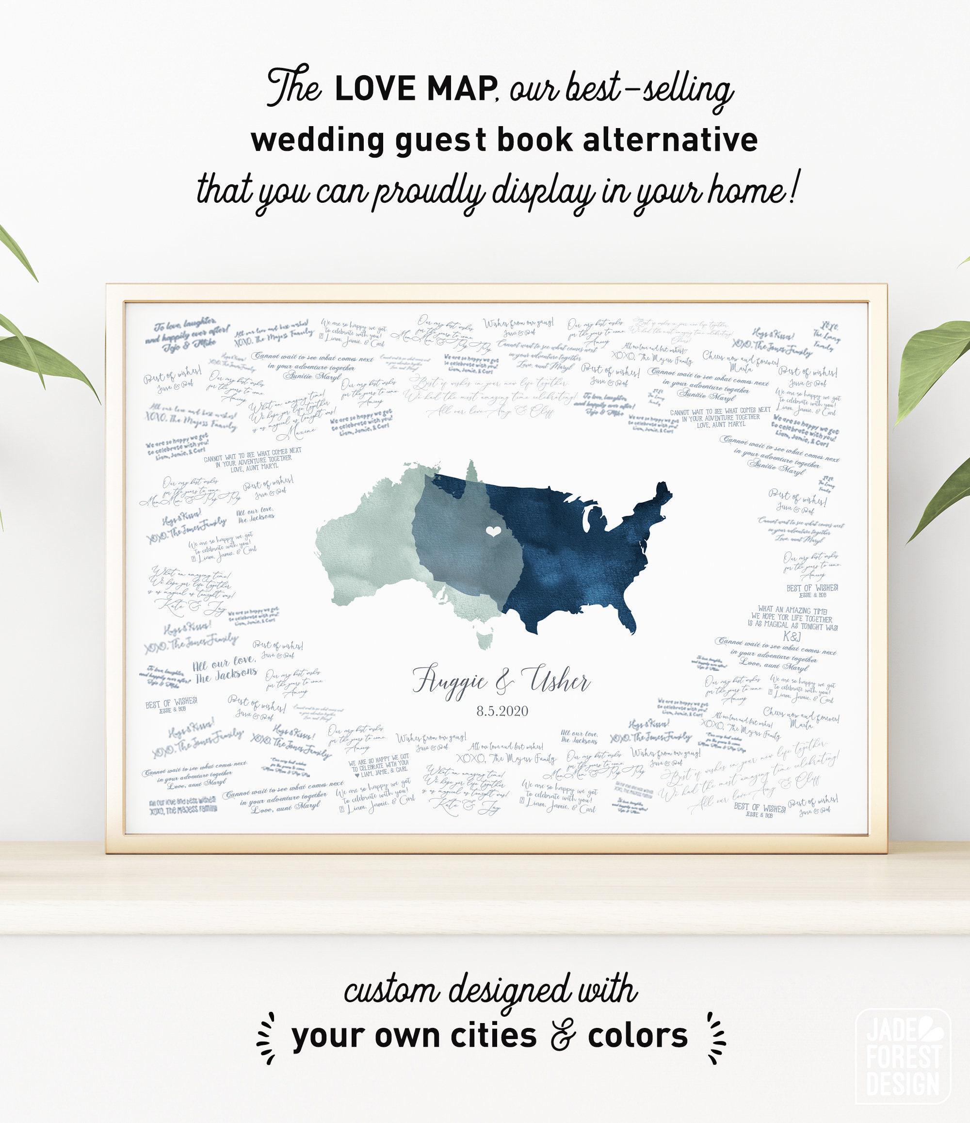 This personalized map guest book allows customization of colors, fonts, and text at no extra charge, ensuring a perfect reflection of your style.