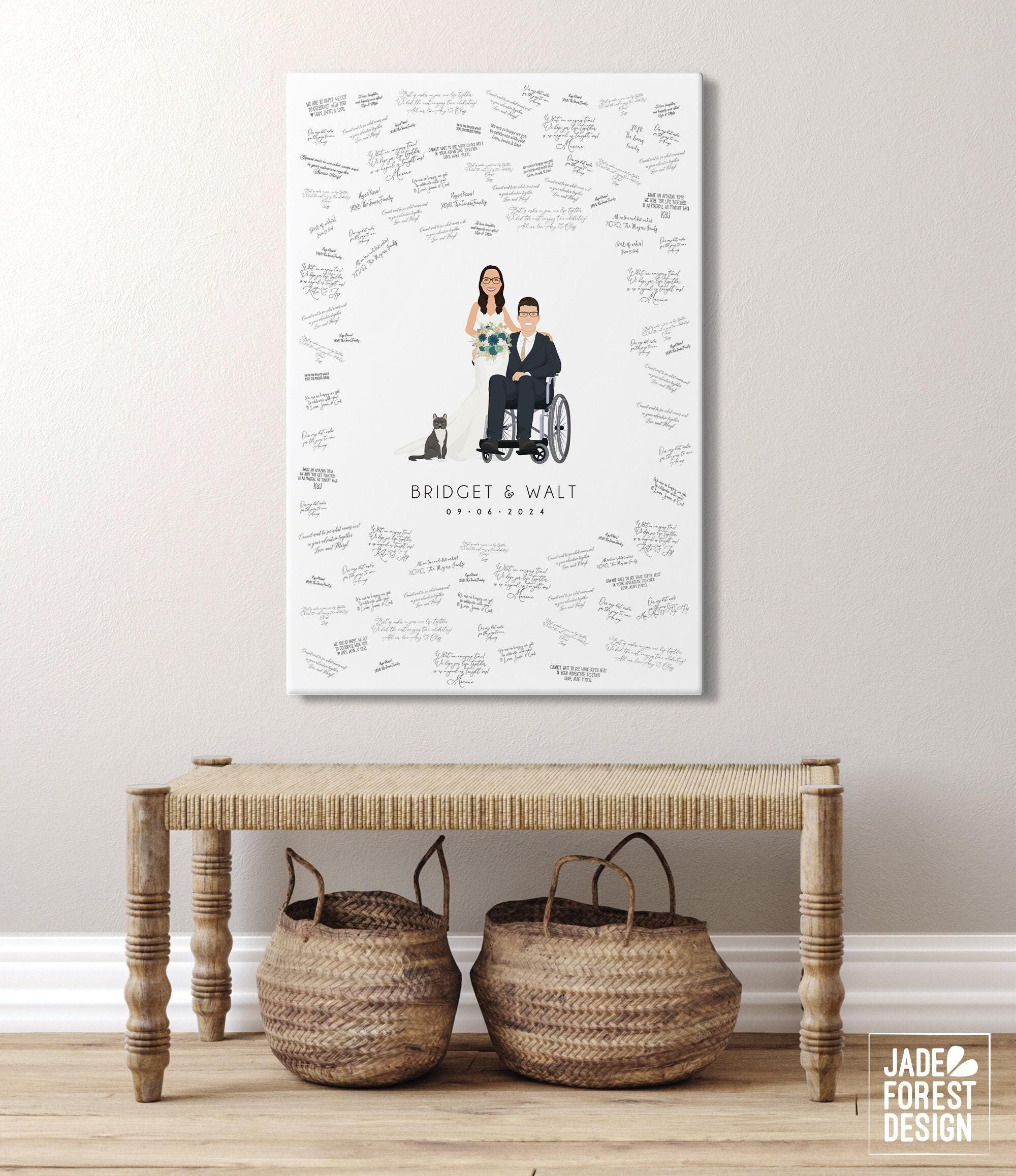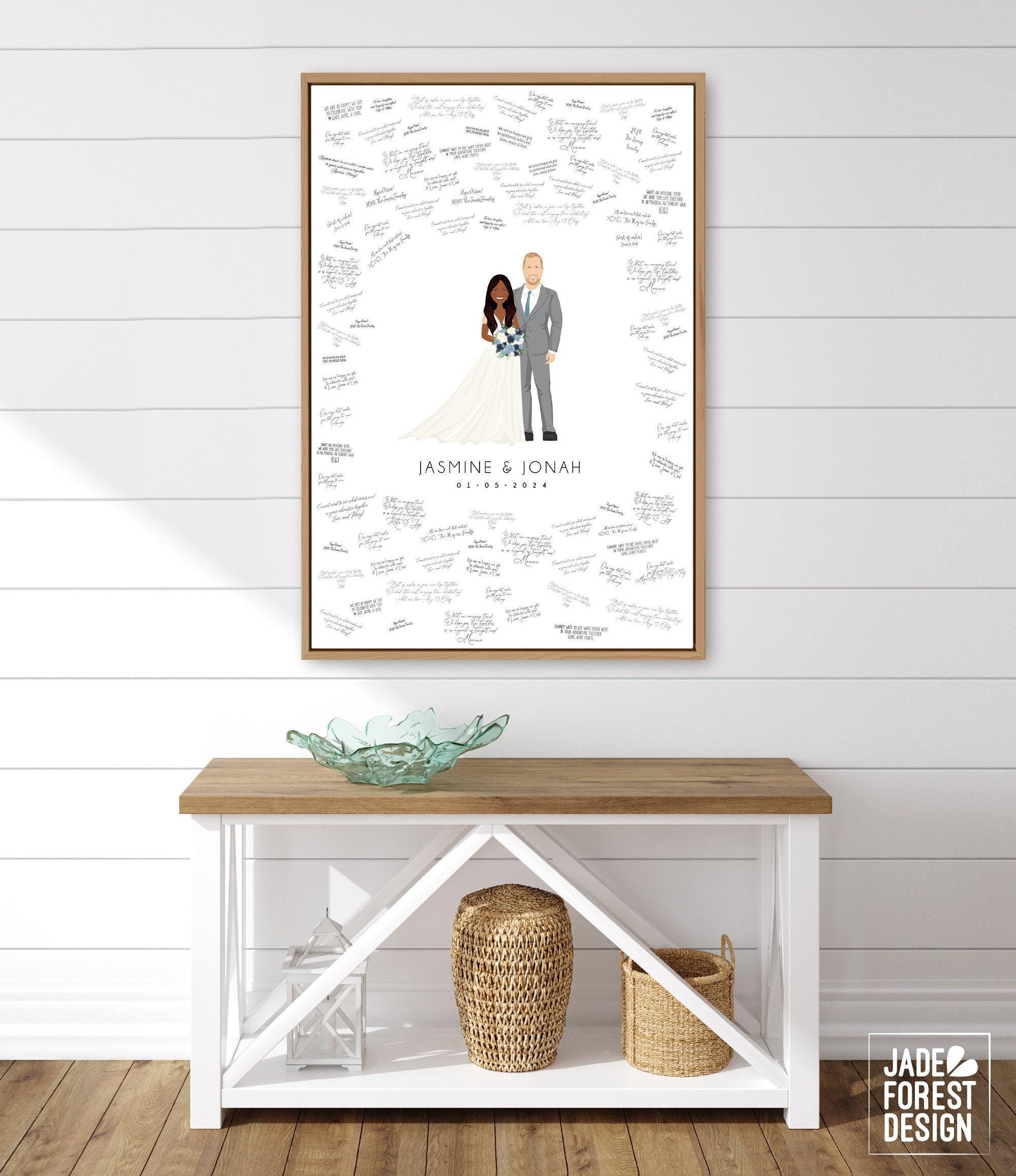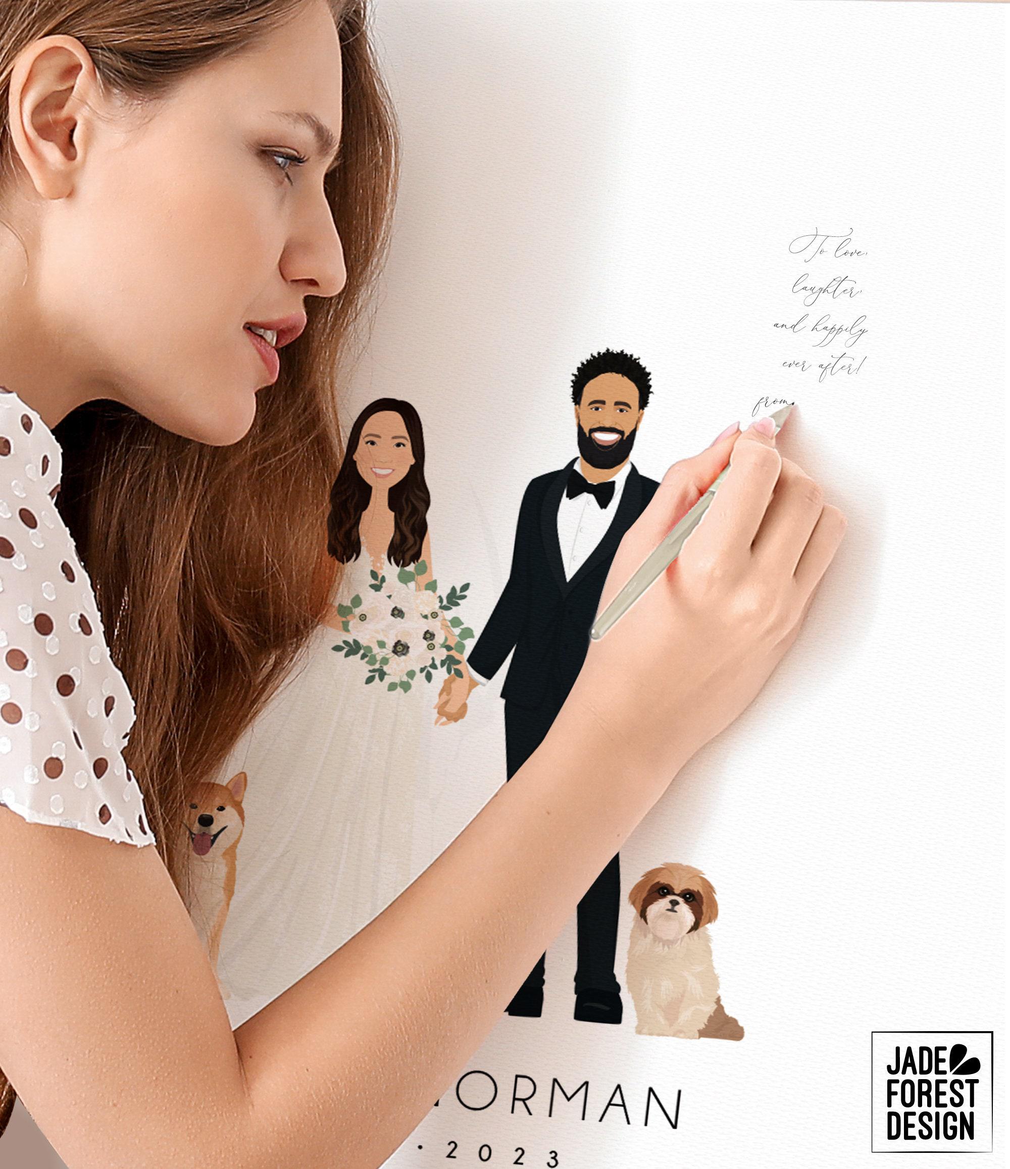 Celebrate your special day with a unique wedding guest book alternative that your guests will truly enjoy signing. This custom portrait guest book canvas features a charming cartoon illustration of the happy couple, personalized to include your likeness, pets, and favorite details. Designed as a whimsical keepsake, this personalized couple dancing art turns your memories into a joyful work of art that will brighten your home for years.