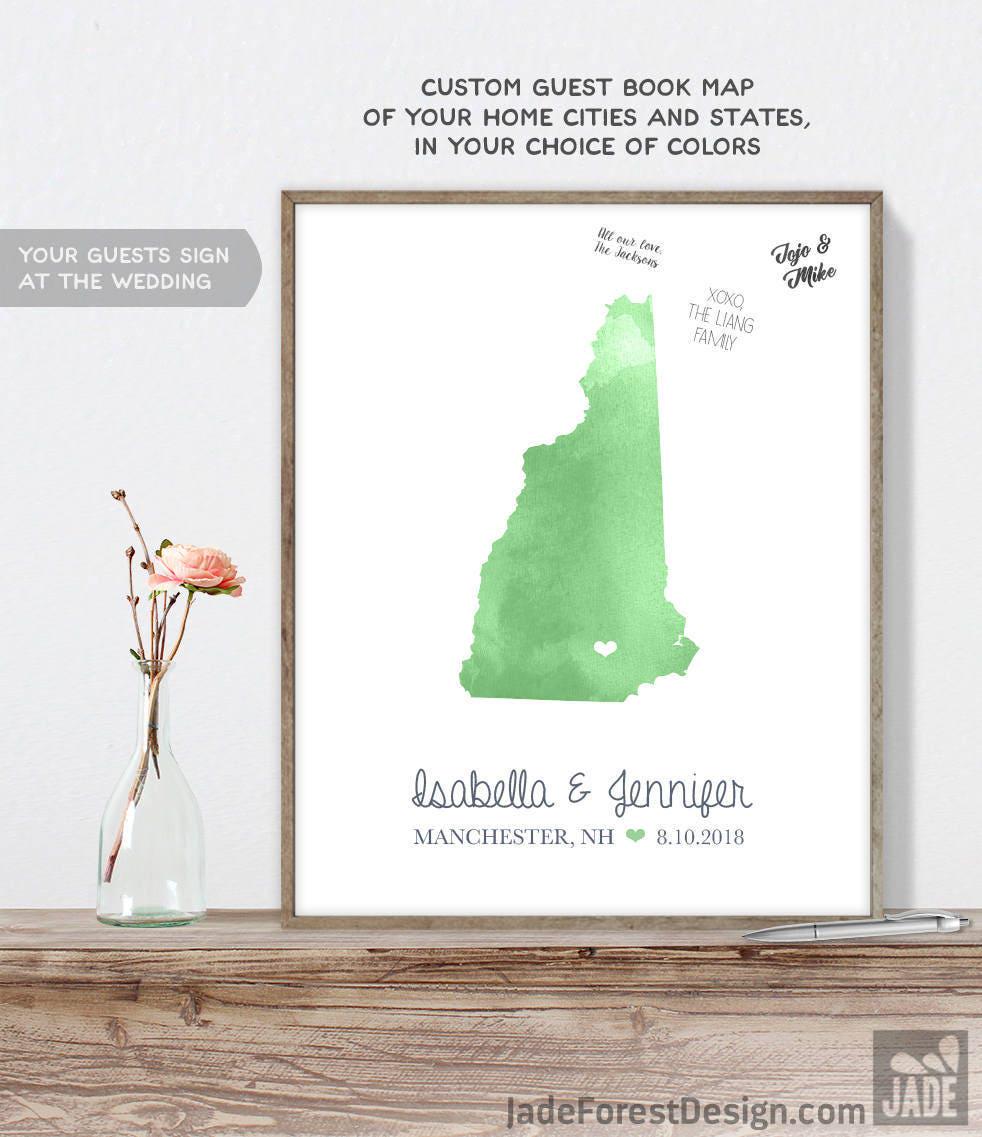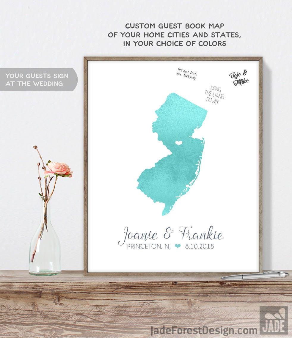 Celebrate your special day with a unique wedding guest book alternative that captures the essence of your ceremony location. This personalized watercolor map art highlights New Jersey with a heart marking your wedding town, inviting guests to sign around the illustration and create a custom keepsake. Combining the charm of personalized map art with the practicality of a guestbook, this design offers an elegant and meaningful way to remember your celebration.