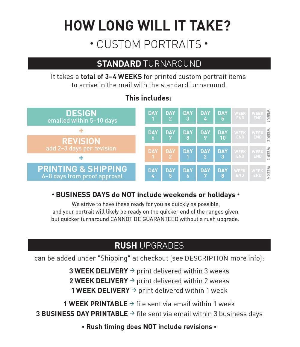You can expect emailed proofs (or printable files) within 4–7 business days of your order date for non-portrait orders. Portrait proofs and custom upgrades take 2–3 weeks. For PRINTED items, you'll be asked to approve the design for print (or revise, if needed).
